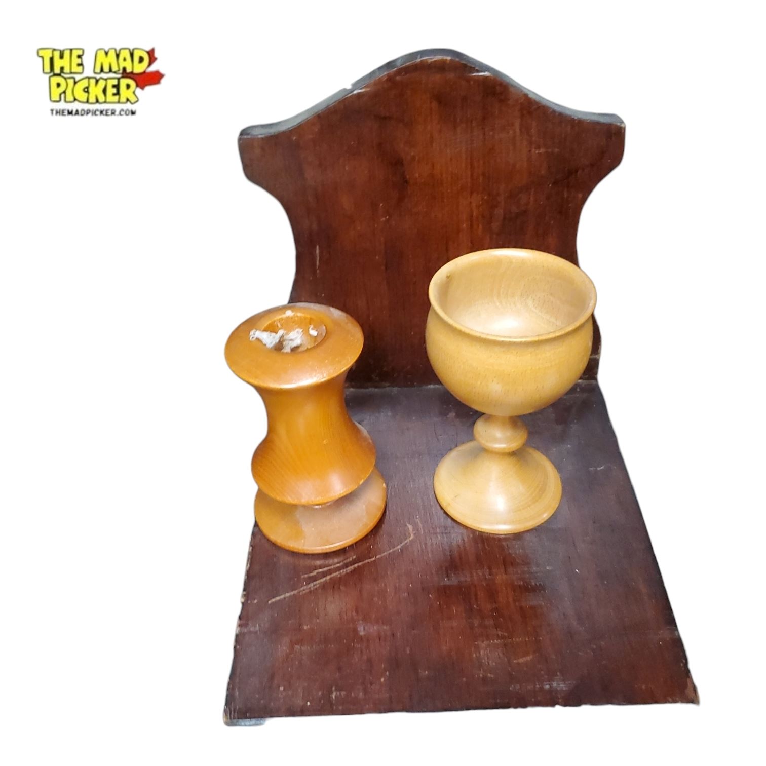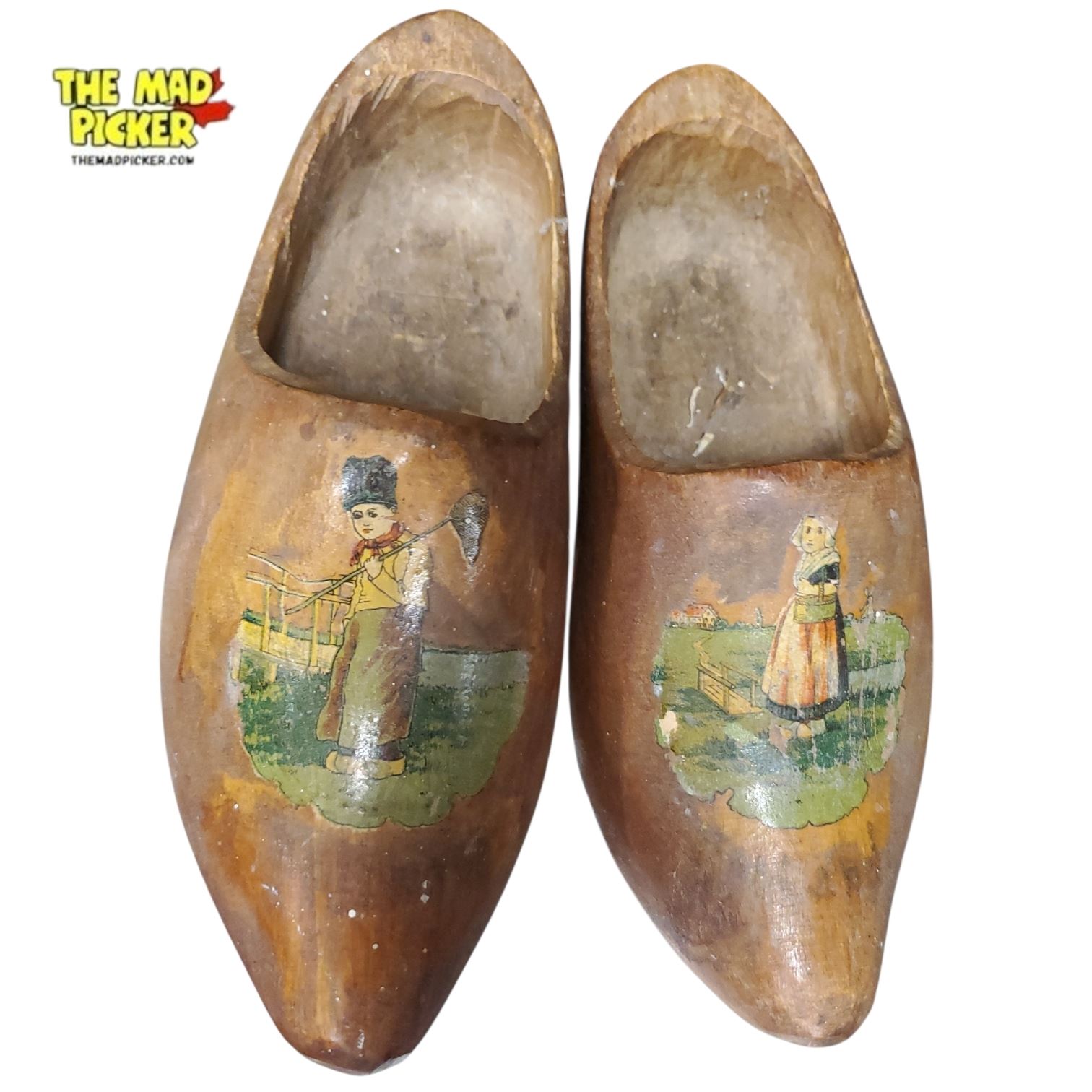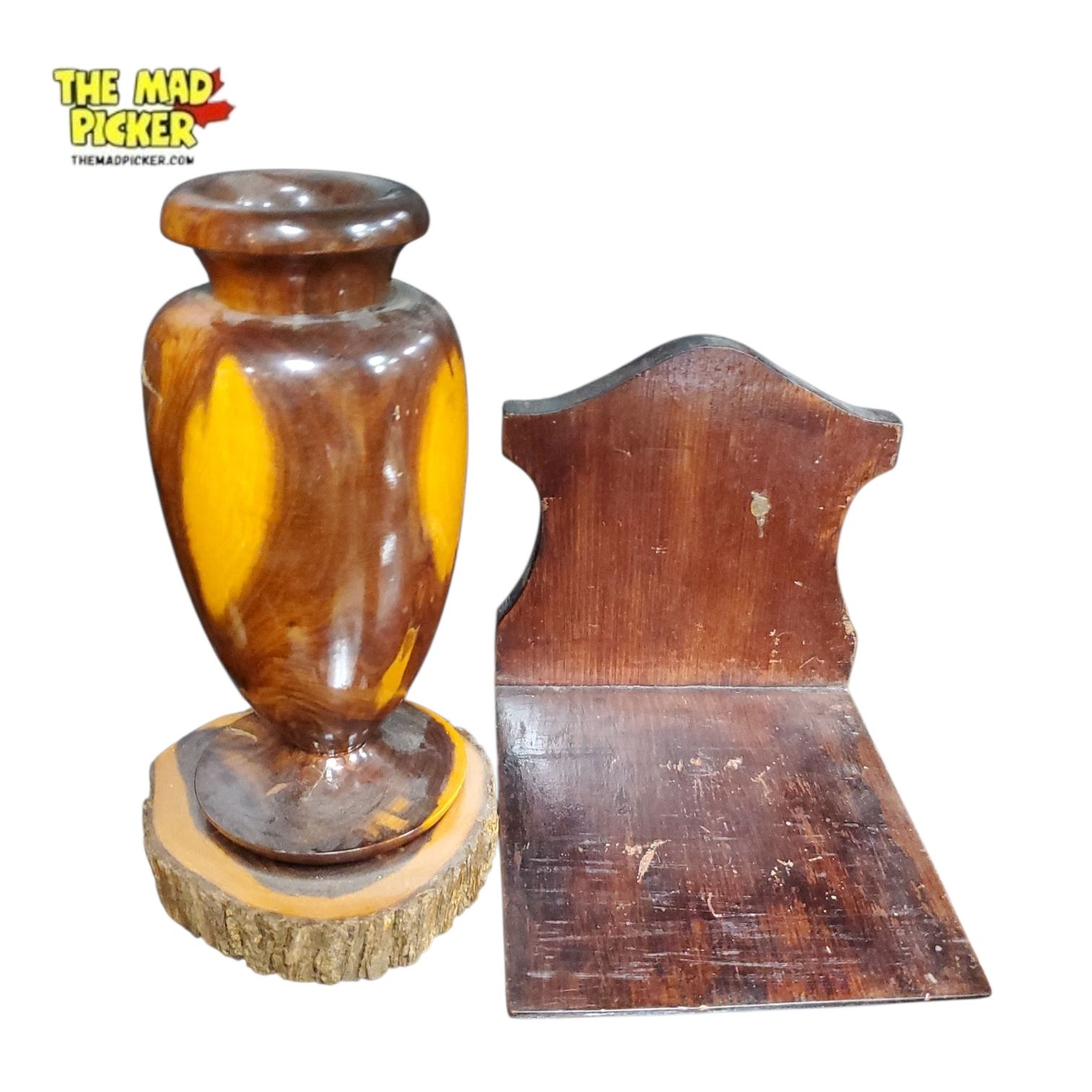 Group of assorted wooden decor items including Dutch-style wooden clogs, a pair of bookends, and various turned wood decorative pieces. Likely mid-20th century. Includes handcrafted detailing and varied finishes across items. Suitable for display or functional use.