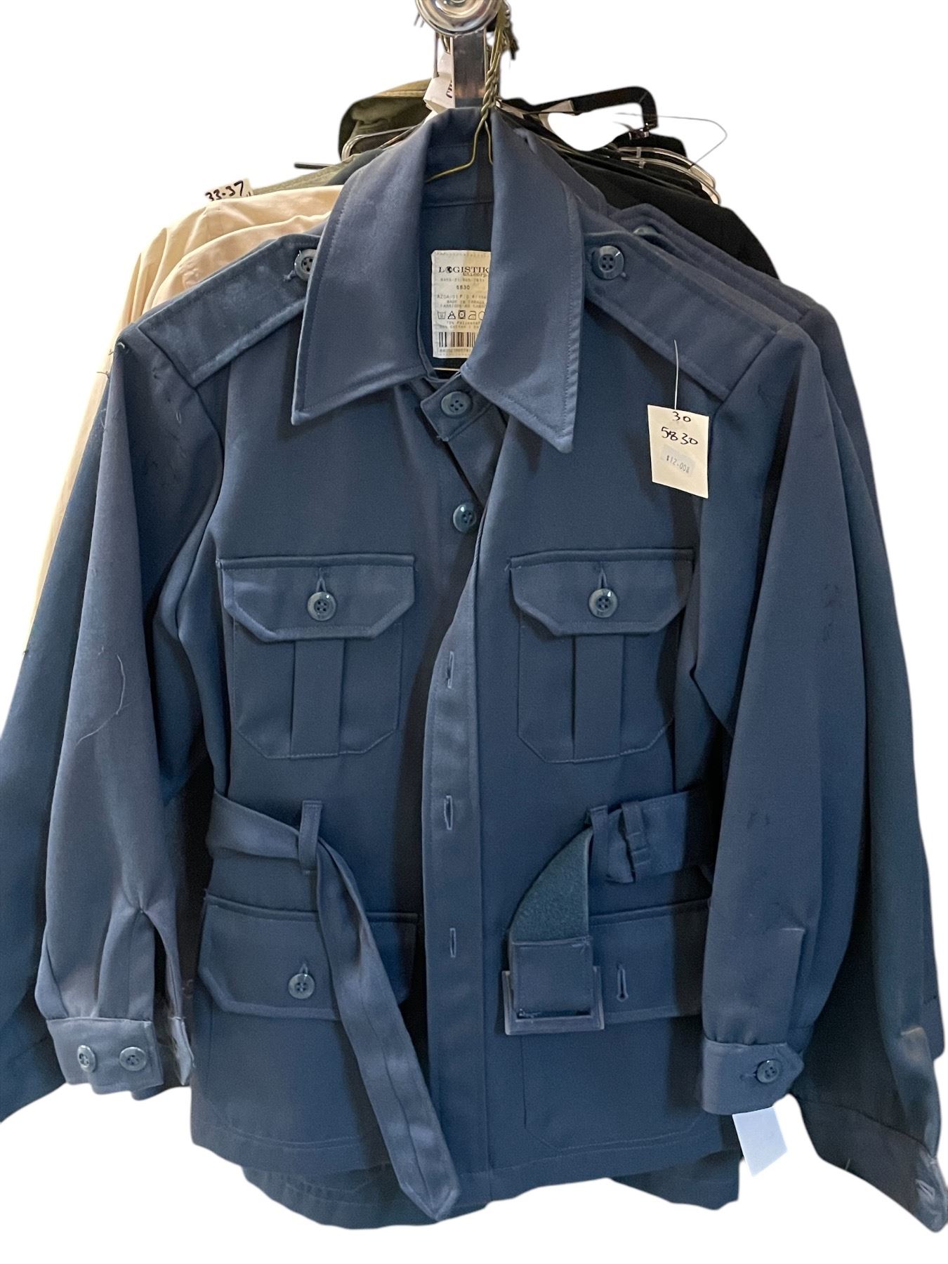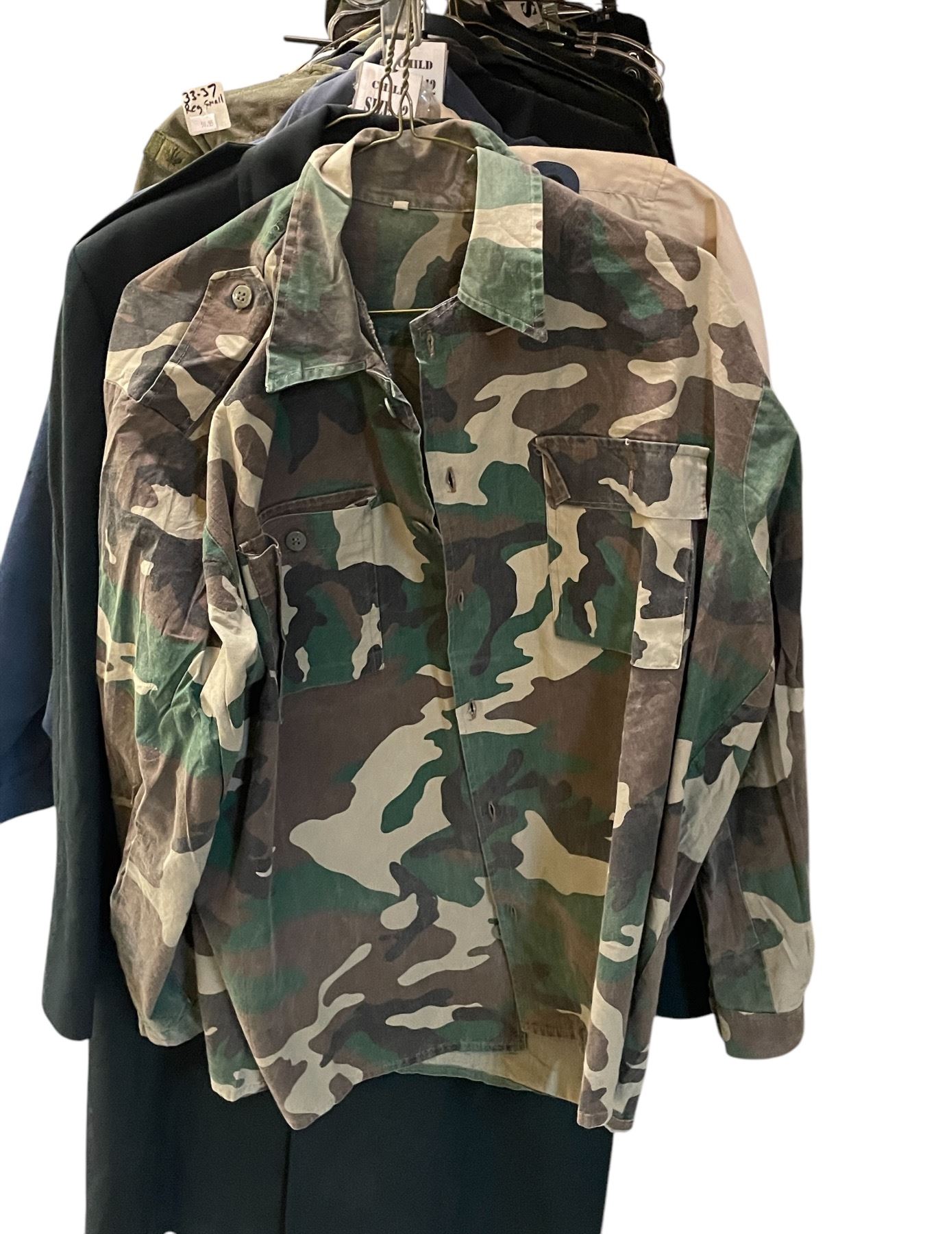Group of assorted Millitary jackets / coats (approx 35 pcs) w/ clothing rack shelving (approx 60in x 28 x 61in H)