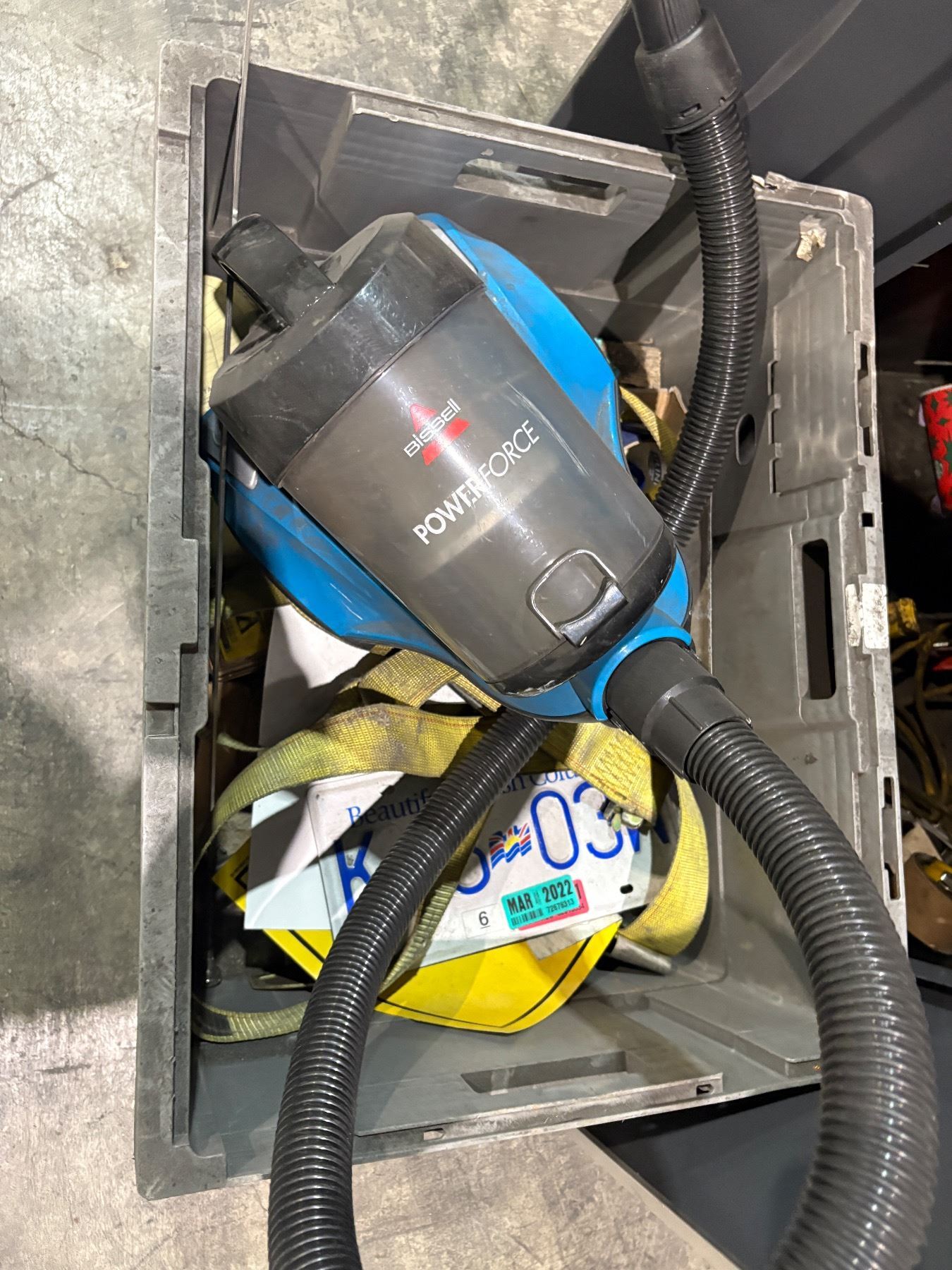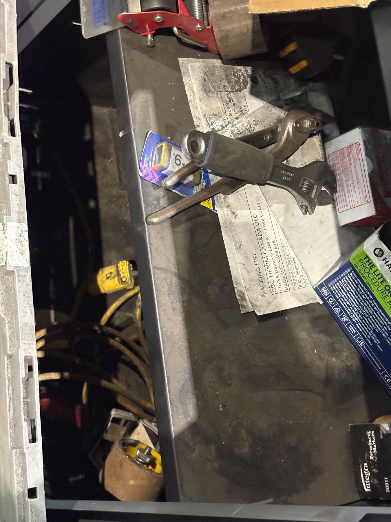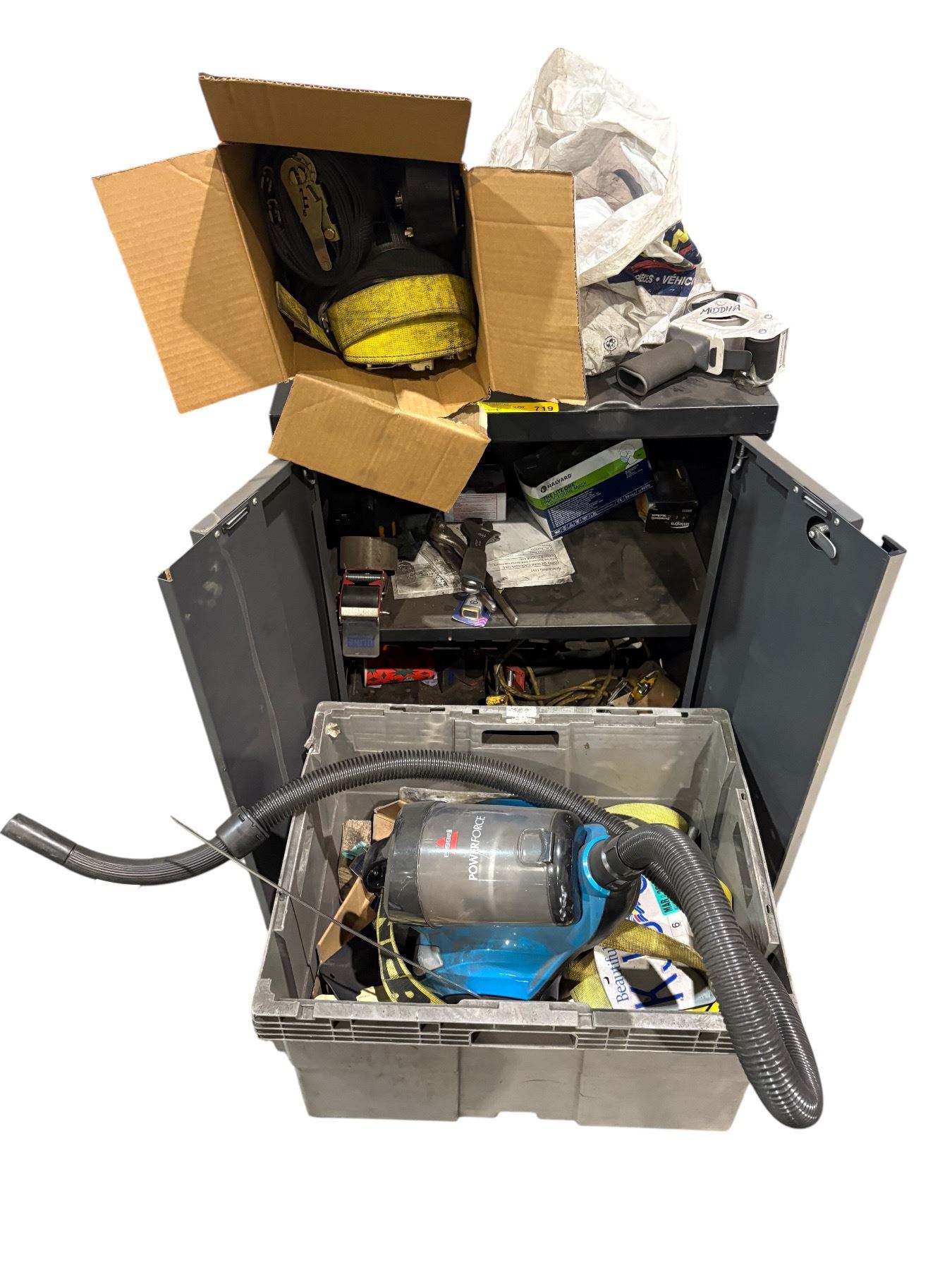 Group of assorted items - tools, shipping straps, cabinet etc.