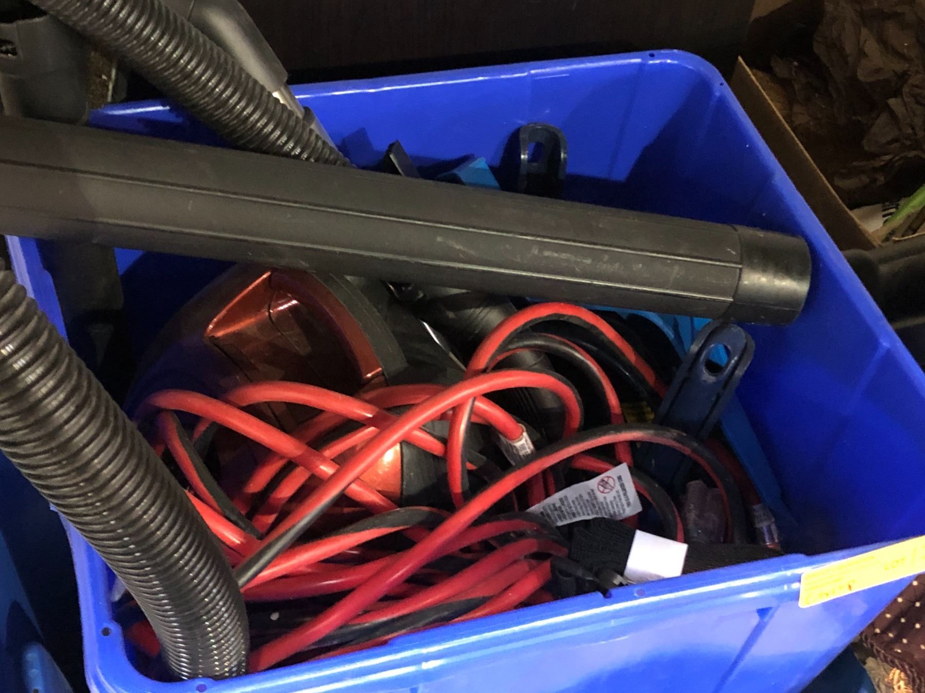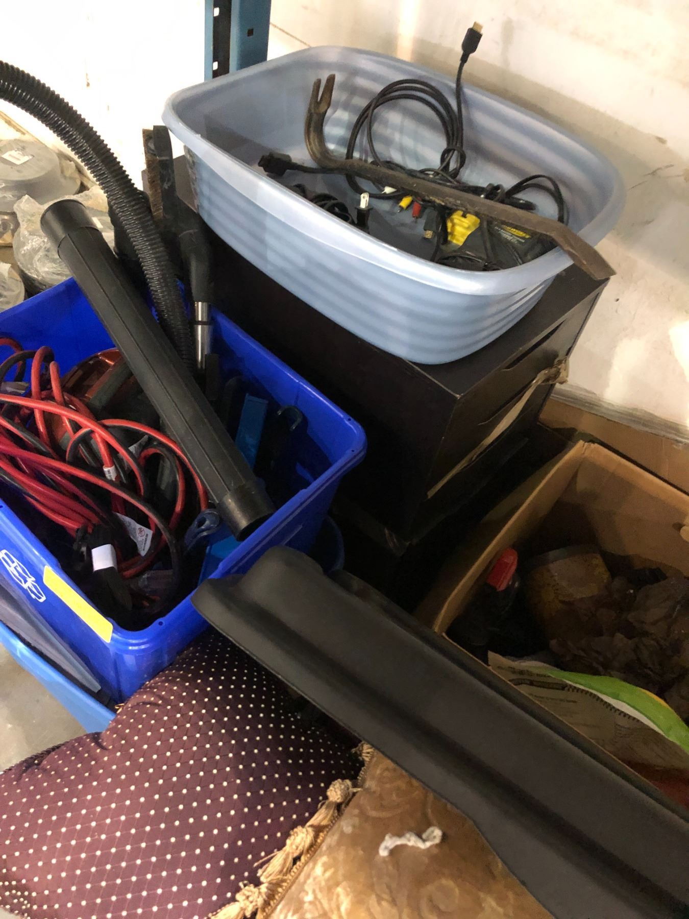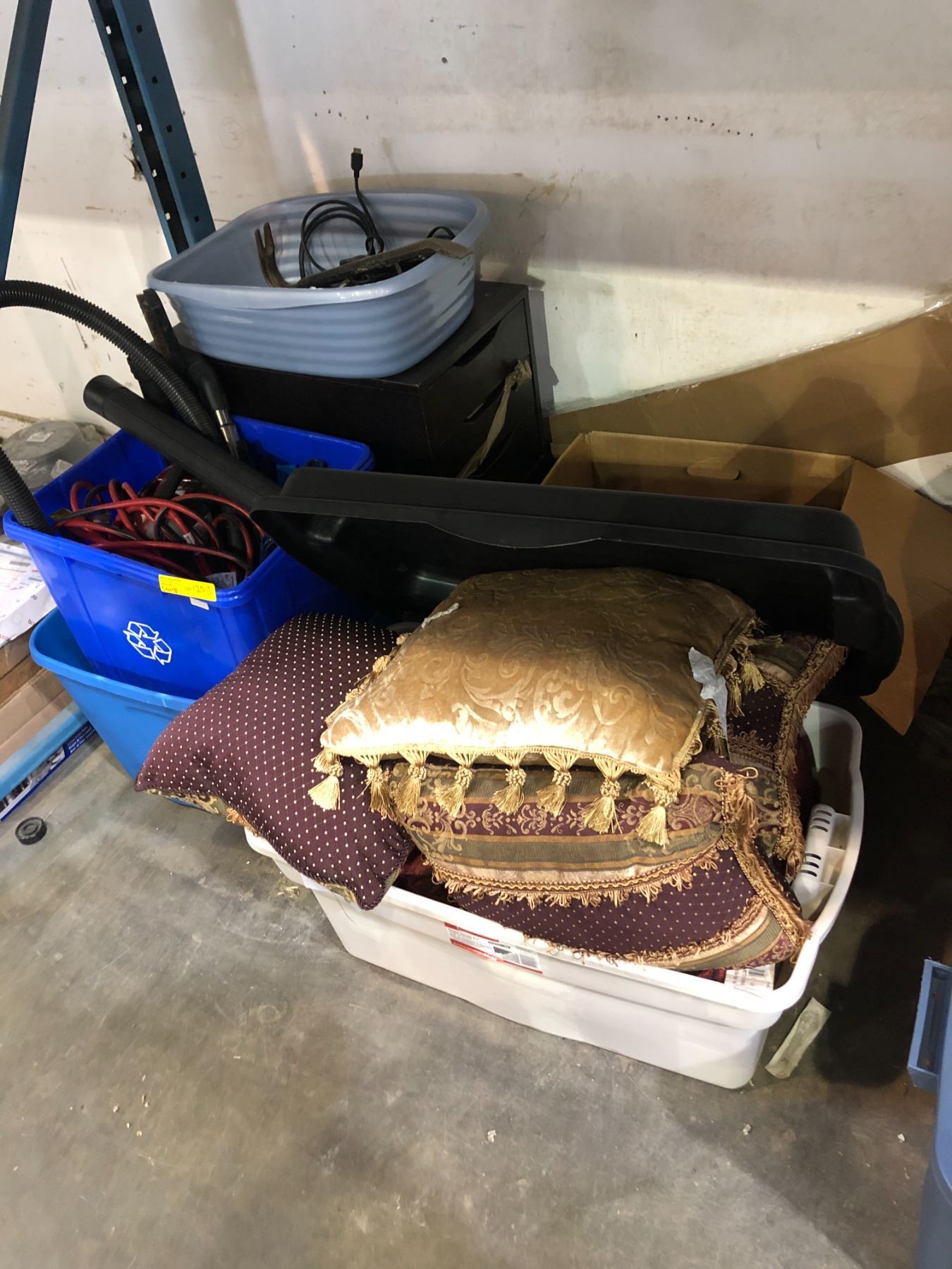 Group of misc items includes - cushions, assorted tools, filing cabinet