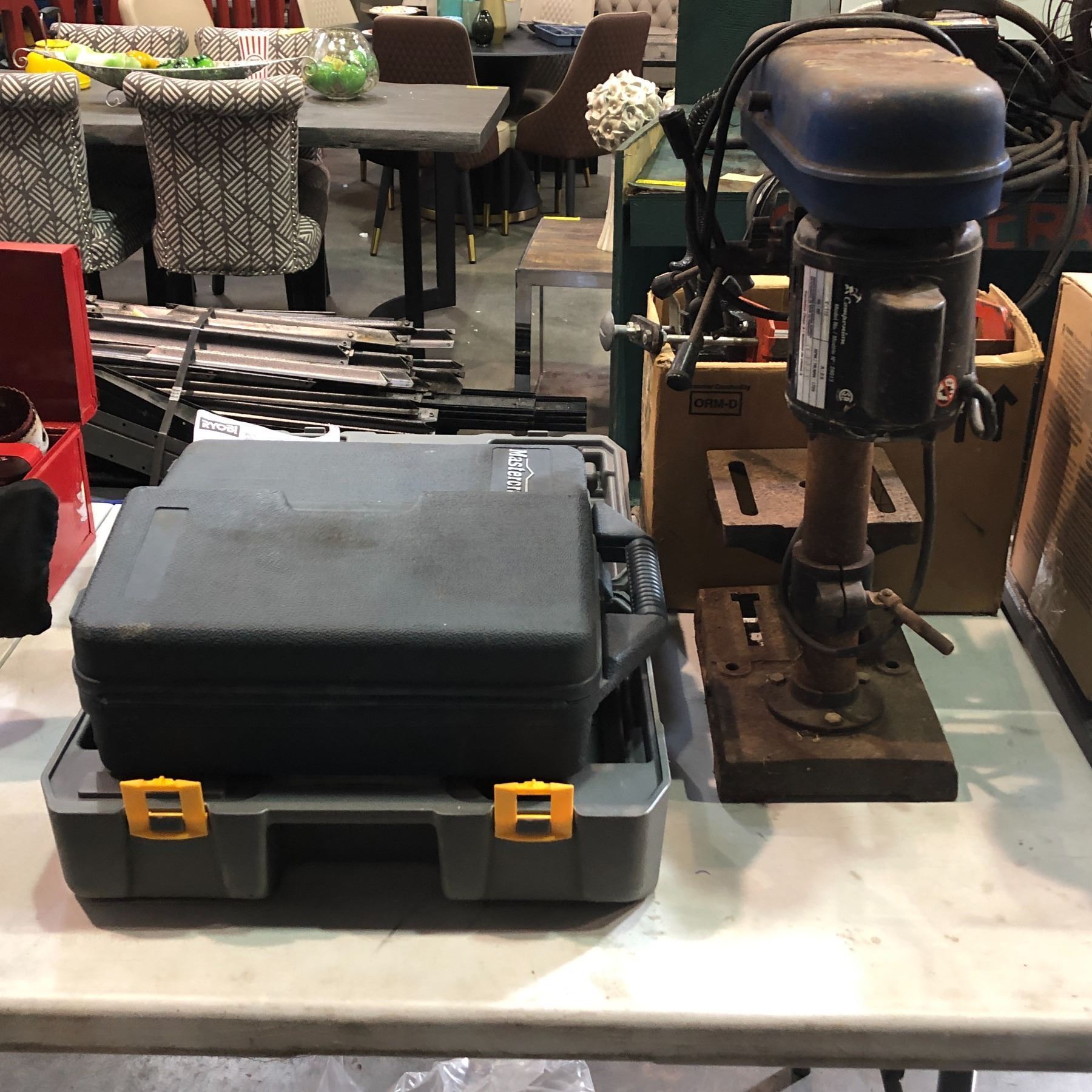 Group of misc items including - Companion bench grill press, Mastercraft air-powered gravity-feed sp