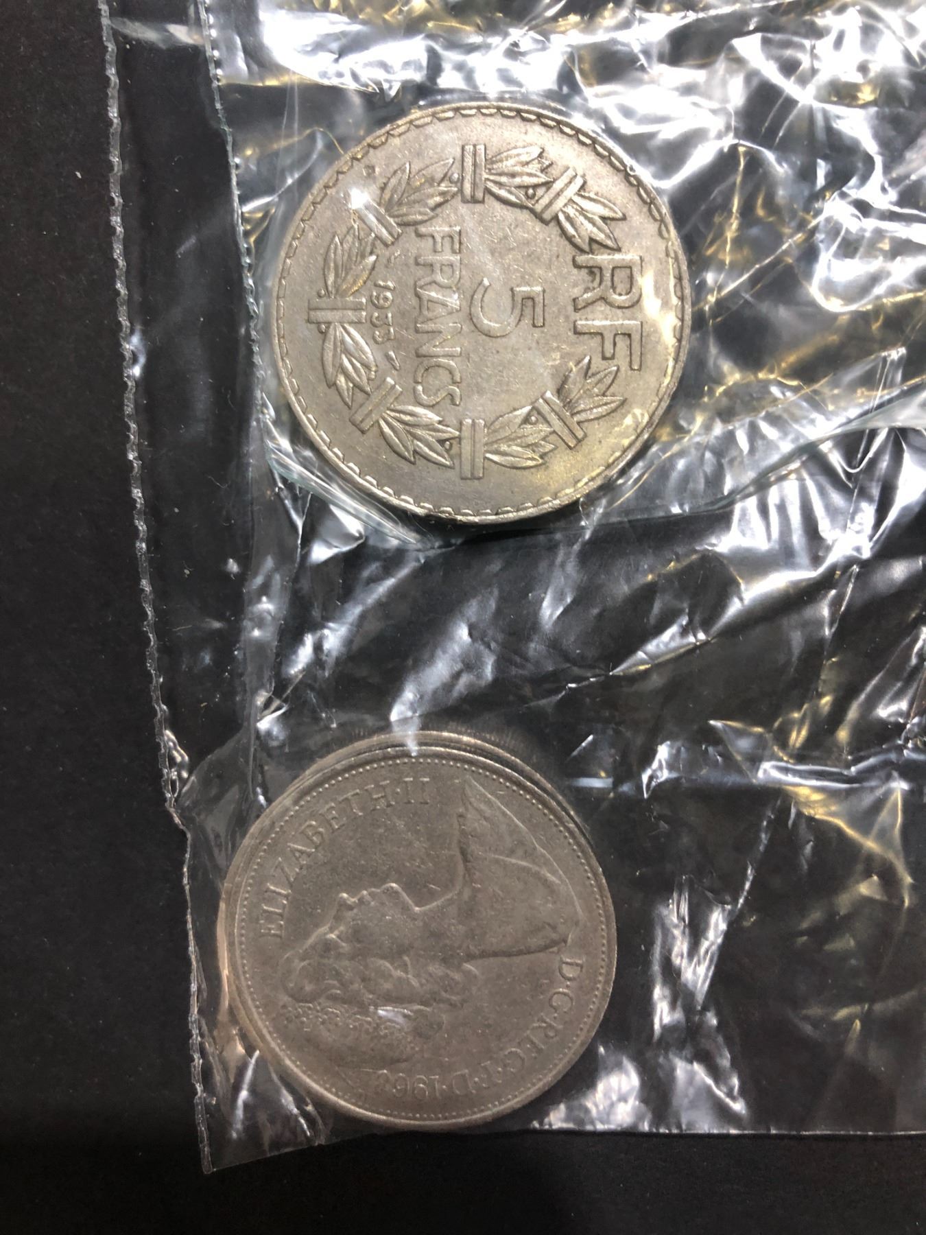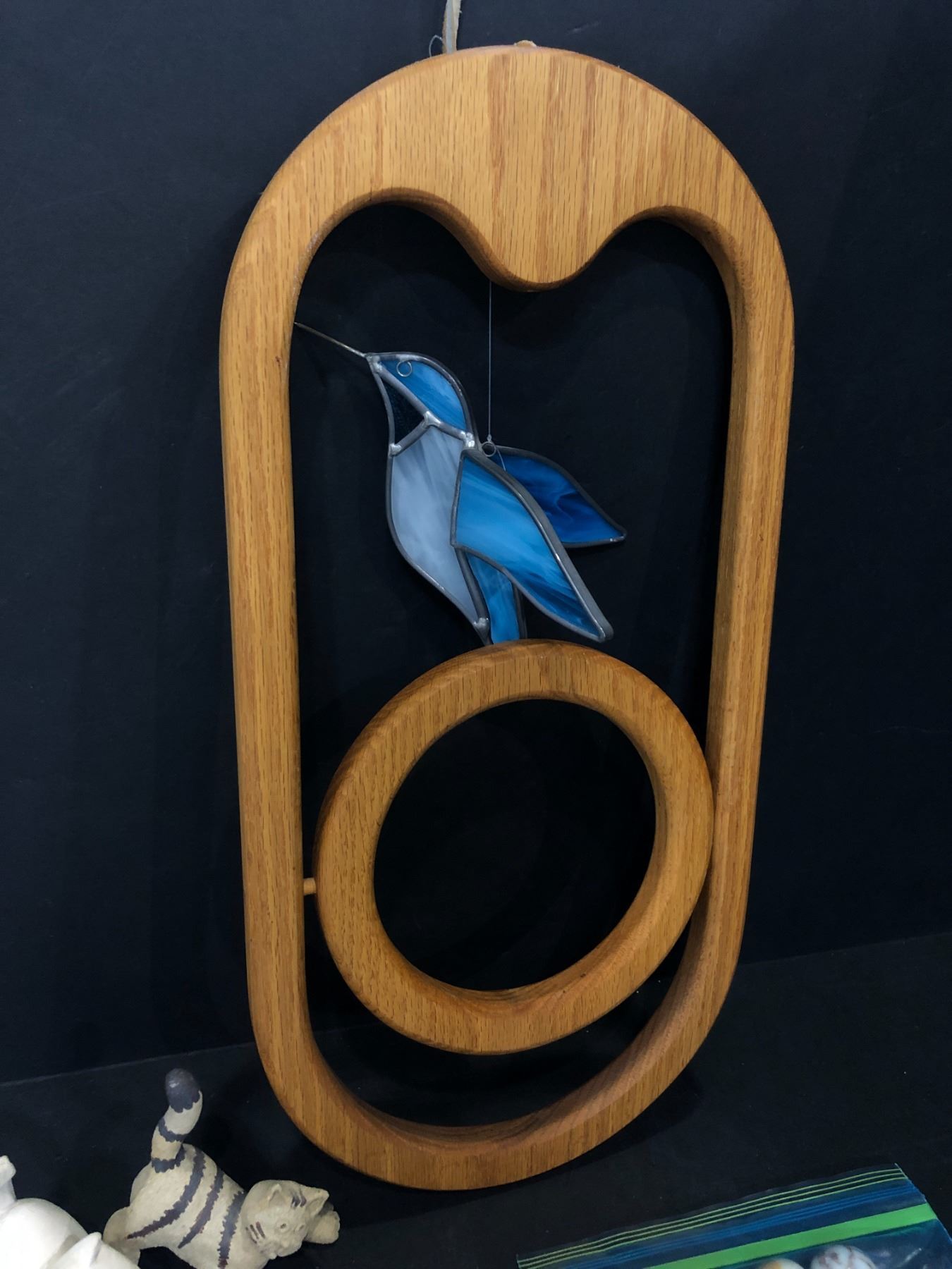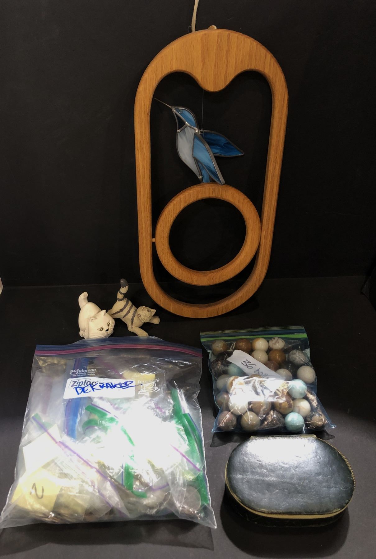 Group of misc items including - group of assorted coins from different countries, decor cats, wooden decor w/hummingbird, etc...