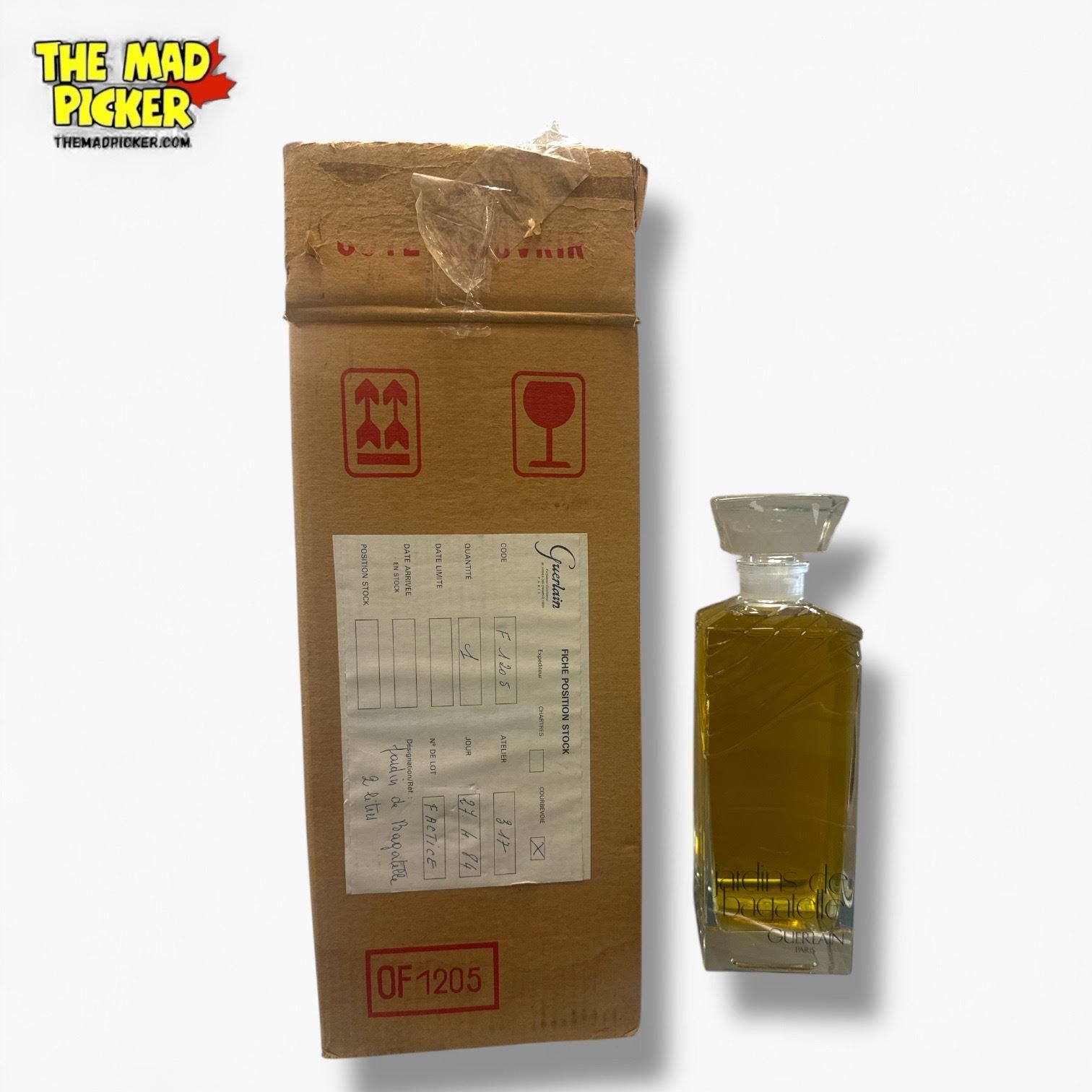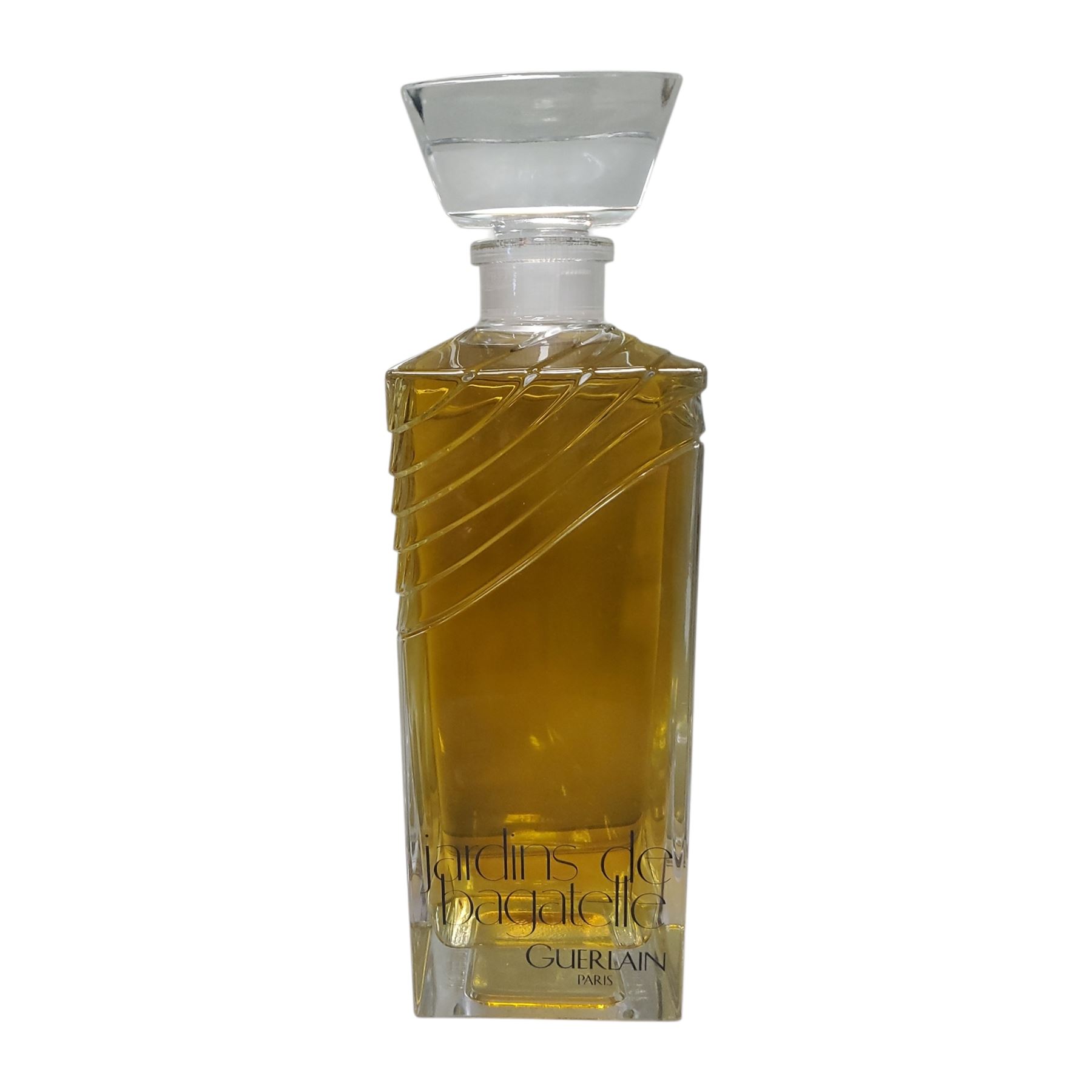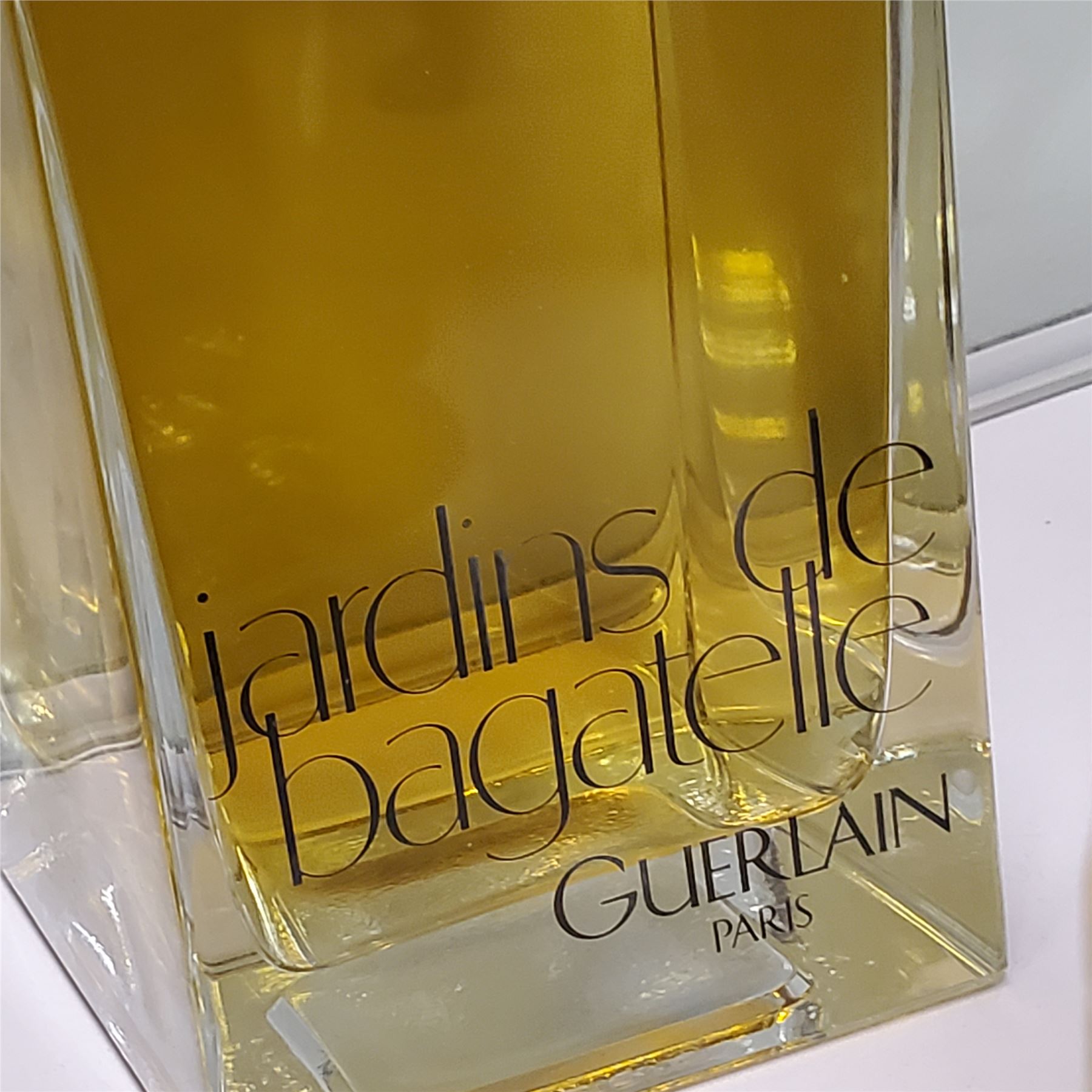 Guerlain Jardins De Bagatelle 2-litre perfume bottle store display. Feminine floral fragrance created by Jean-Paul Guerlain in 1983, inspired by the rose gardens of Parc de Bagatelle in Paris. Scent features jasmine, tuberose, gardenia, and neroli. Rectangular flacon with diagonal ridges by Robert Granai, made by Saint-Gobain Desjonqueres.