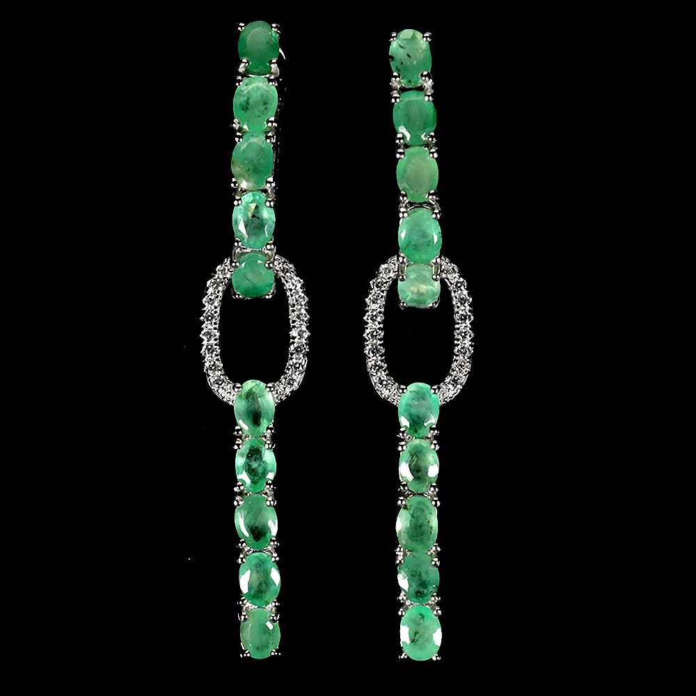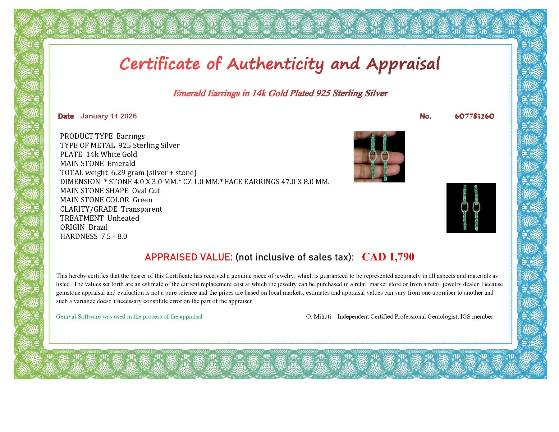 HIGH CLARITY EMERALD AND CZ EARRINGS IN 14K WHITE PLATED GOLD OVER 925 STERLING SILVER - APPRAISED REPLACEMENT VALUE CAD 1,790