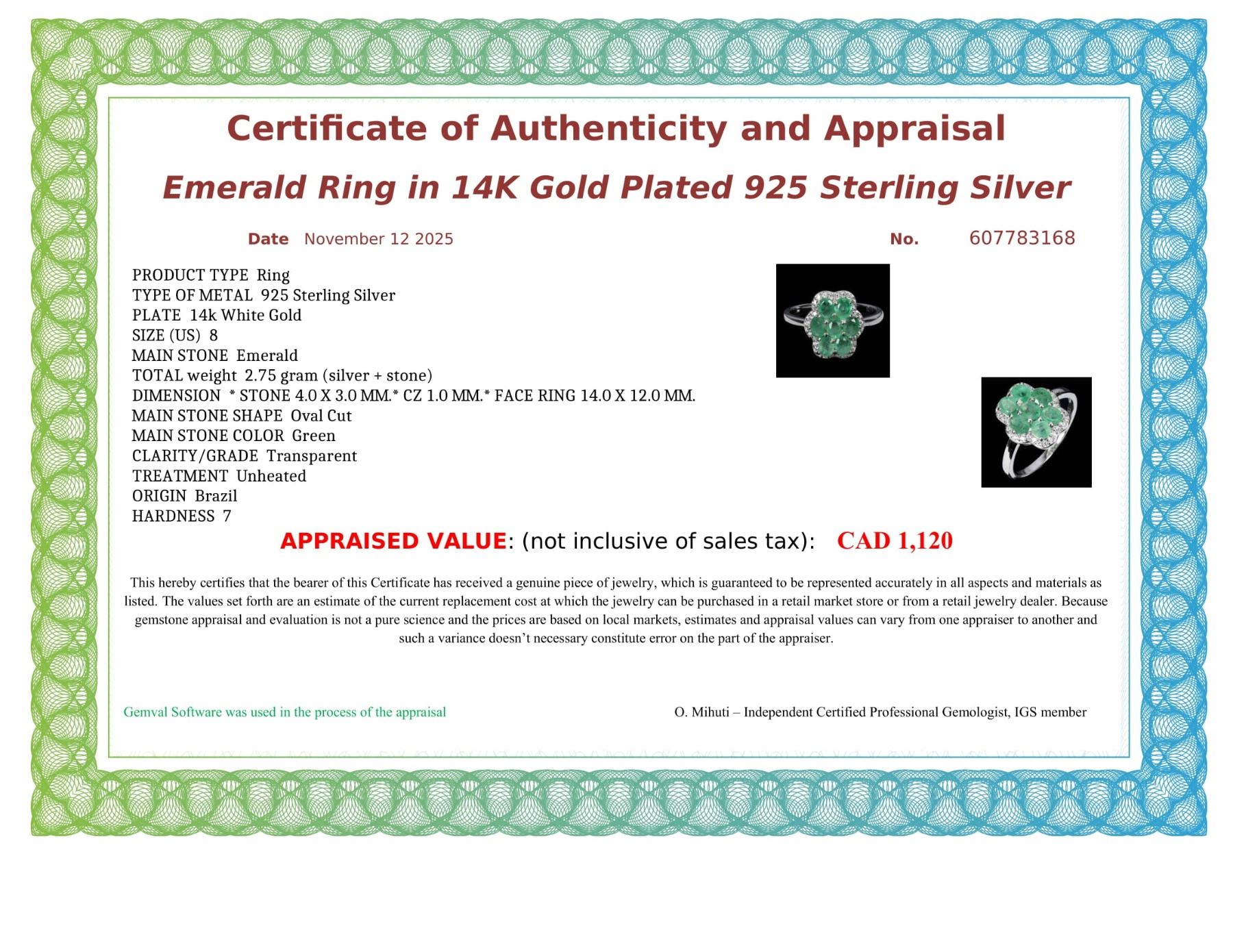 HIGH CLARITY EMERALD RING IN 14K WHITE PLATED GOLD OVER 925 STERLING SILVER - SIZE 8 - APPRAISED REPLACEMENT VALUE $ 1,120