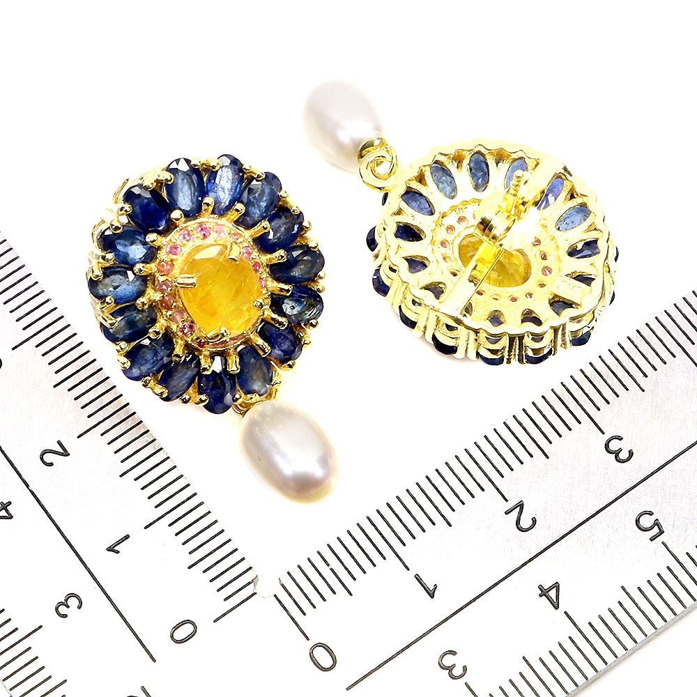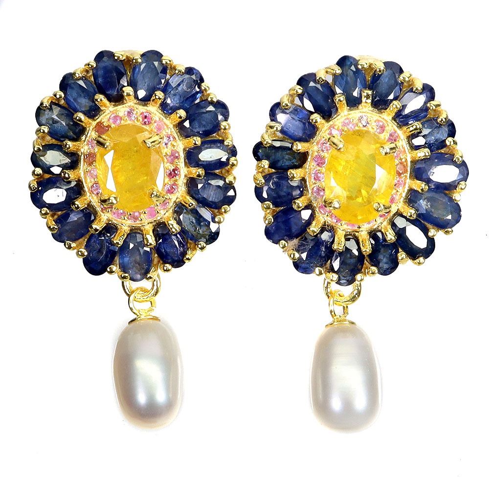 HIGH END 5X3 mm YELLOW SAPPHIRE, BLUE SAPPHIRE, RUBY AND PEARL EARRINGS IN 14K YELLOW PLATED GOLD OVER 925 STERLING SILVER - APPRAISED REPLACEMENT VALUE CAD 920