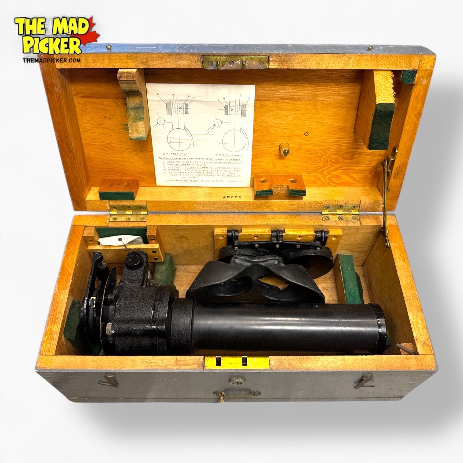 The instrument remains in excellent preserved condition, retaining its wartime finish, optical components, and mechanical adjustments. It is housed in its original fitted wooden case, complete with period hardware and internal supports. The case shows appropriate age and service wear consistent with WWII naval use, adding authenticity and character without compromising structural integrity.