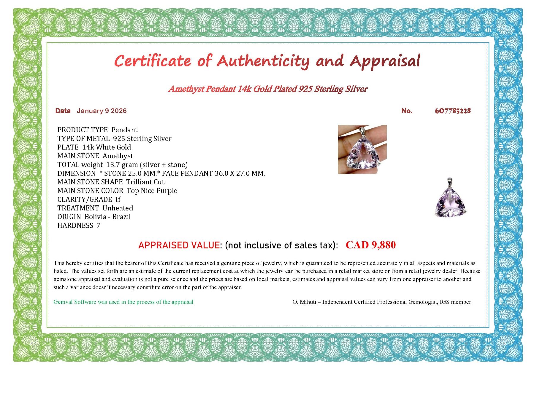 HUGE RARE 60 CARATS TRILLIANT CUT AMETHYST PENDANT IN 14K YELLOW PLATED GOLD OVER 925 STERLING SILVER - APPRAISED REPLACEMENT VALUE CAD 9,880