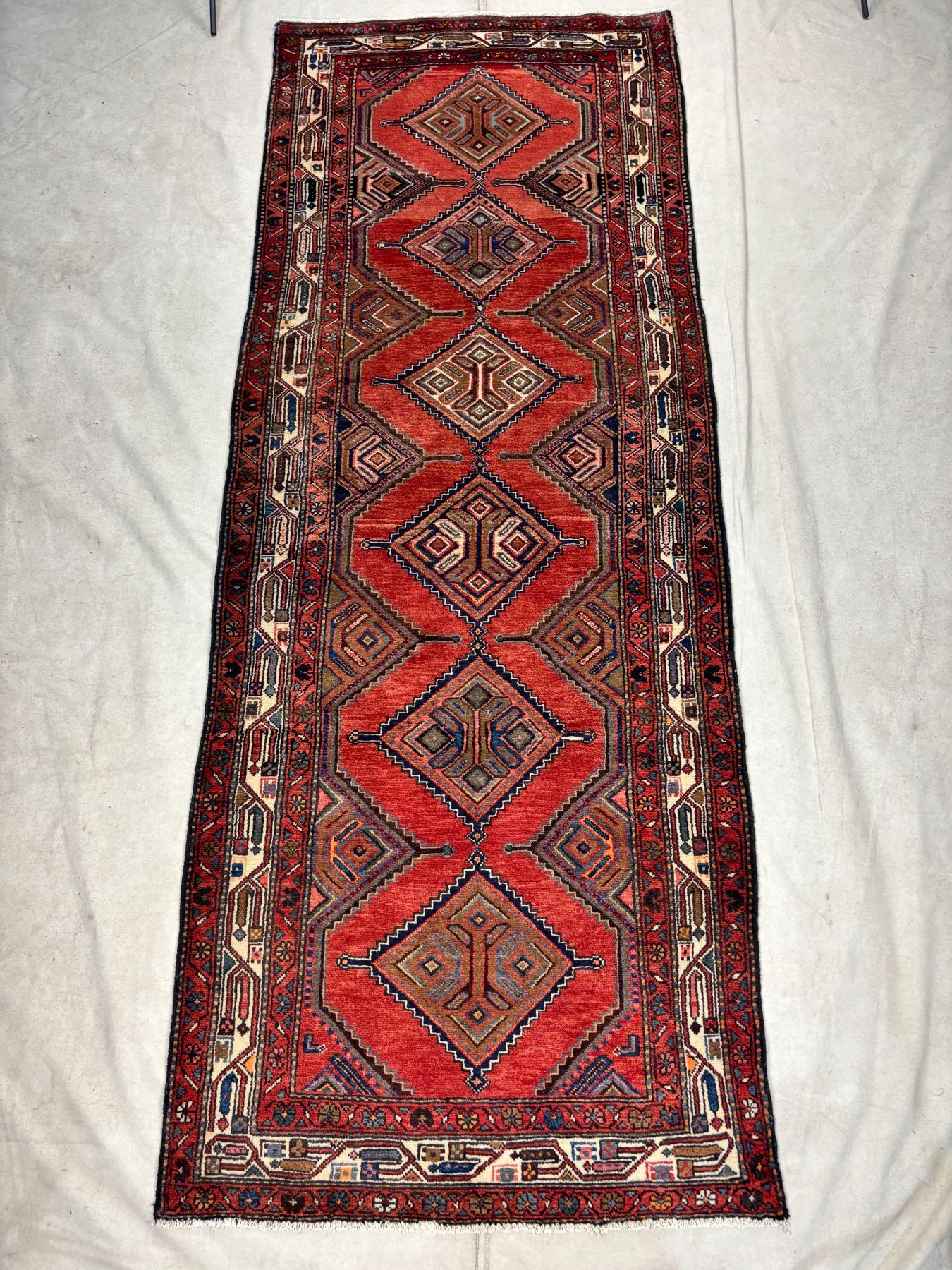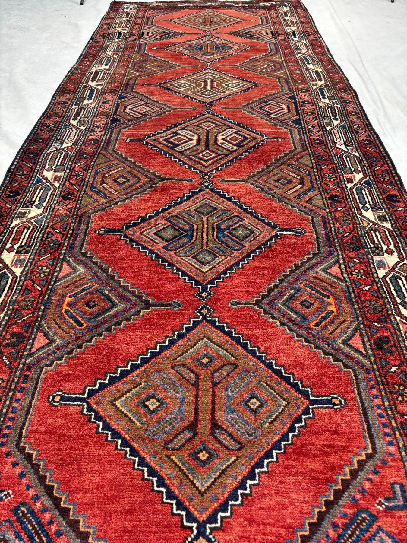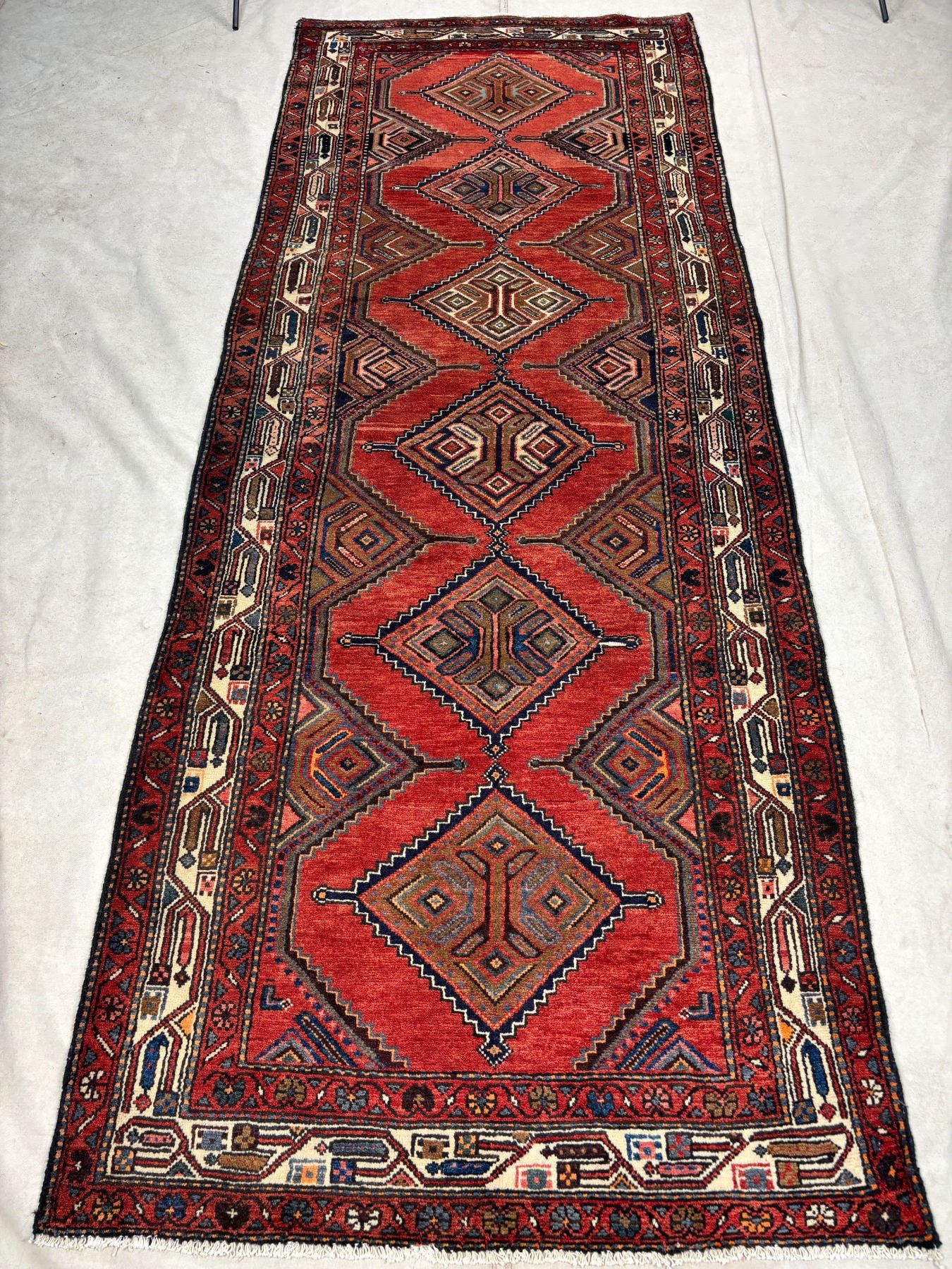 Hamedan 100% Authentic Hand Knotted Wool Persian Rug Handmade in Iran Fluffy Runner geometric map Beautiful coloring (These carpets have been washed professionally, and for this reason there are no 3tears or dirt in this carpet and it will be delivered to you clean and smooth. Don't miss the opportunity to buy such a carpet) Size: 9.7' × 3.7'