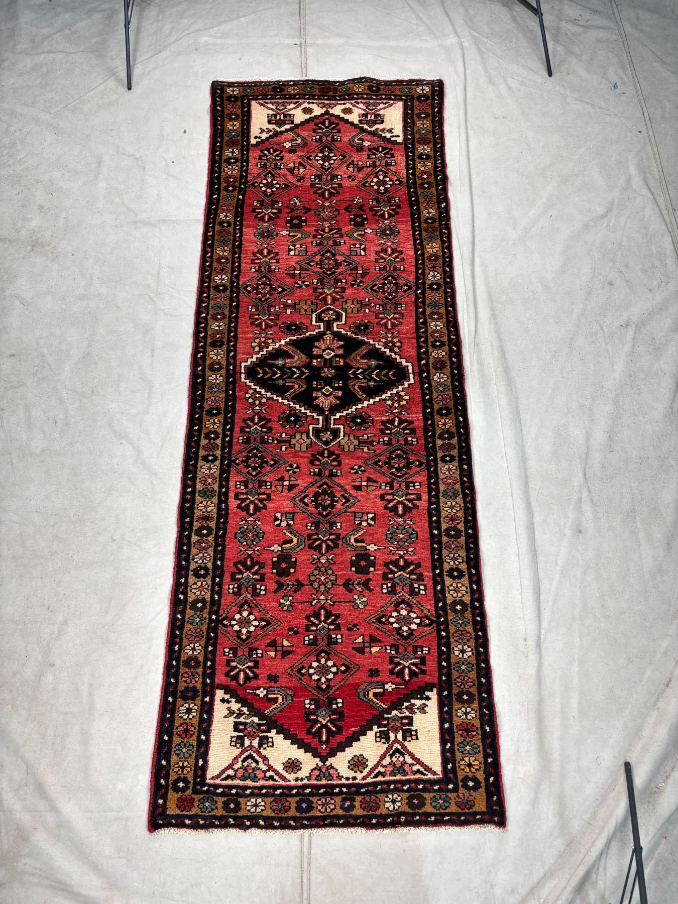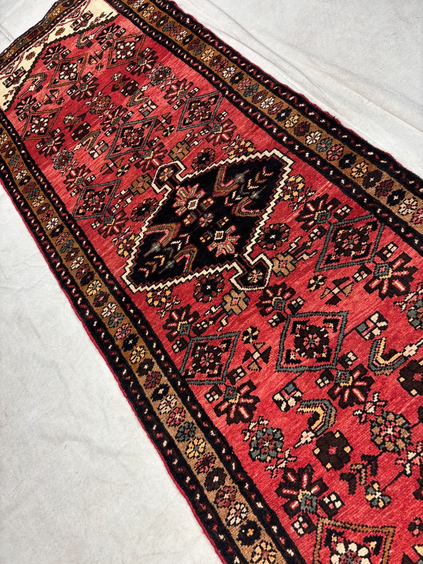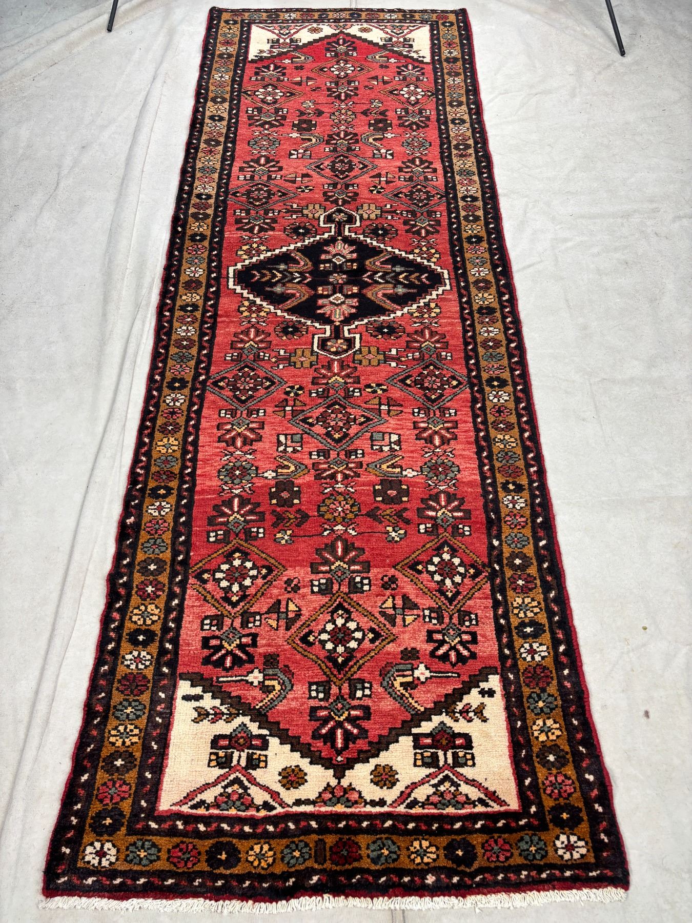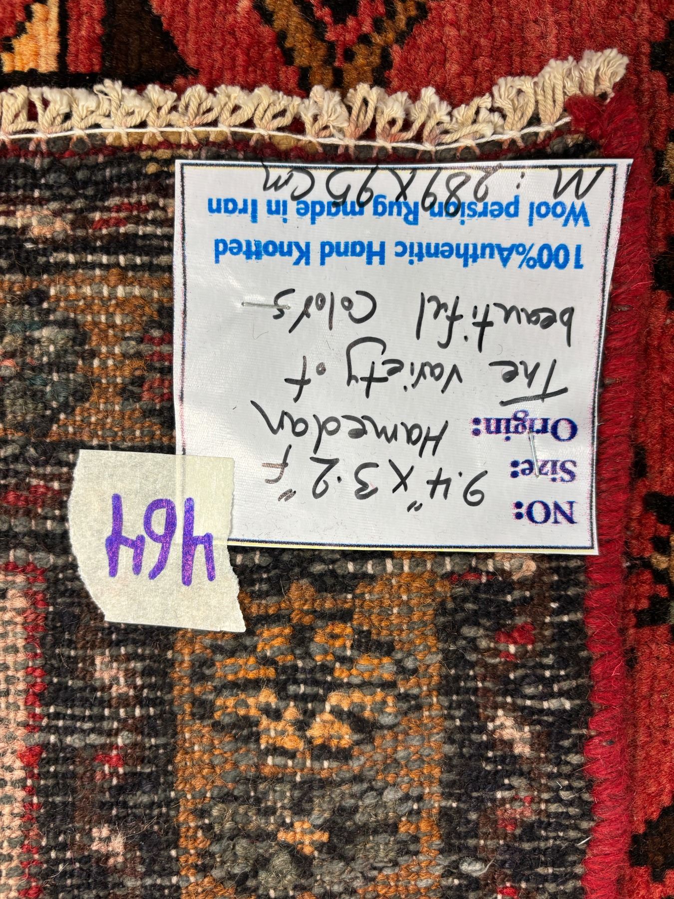 Hamedan 100% Authentic Hand Knotted Wool Persian Rug Handmade in Iran The variety of beautiful color Fluffy Runner (These carpets have been washed professionally, and for this reason there are no 3tears or dirt in this carpet and it will be delivered to you clean and smooth. Don't miss the opportunity to buy such a carpet) Size: 9.4' × 3.2'