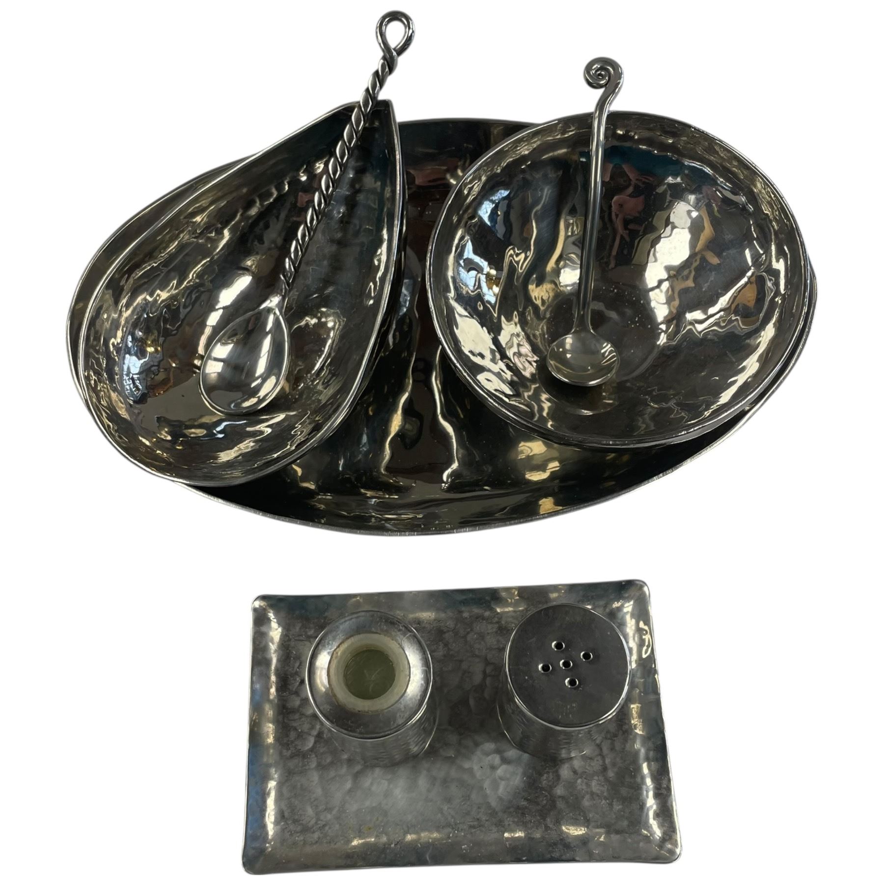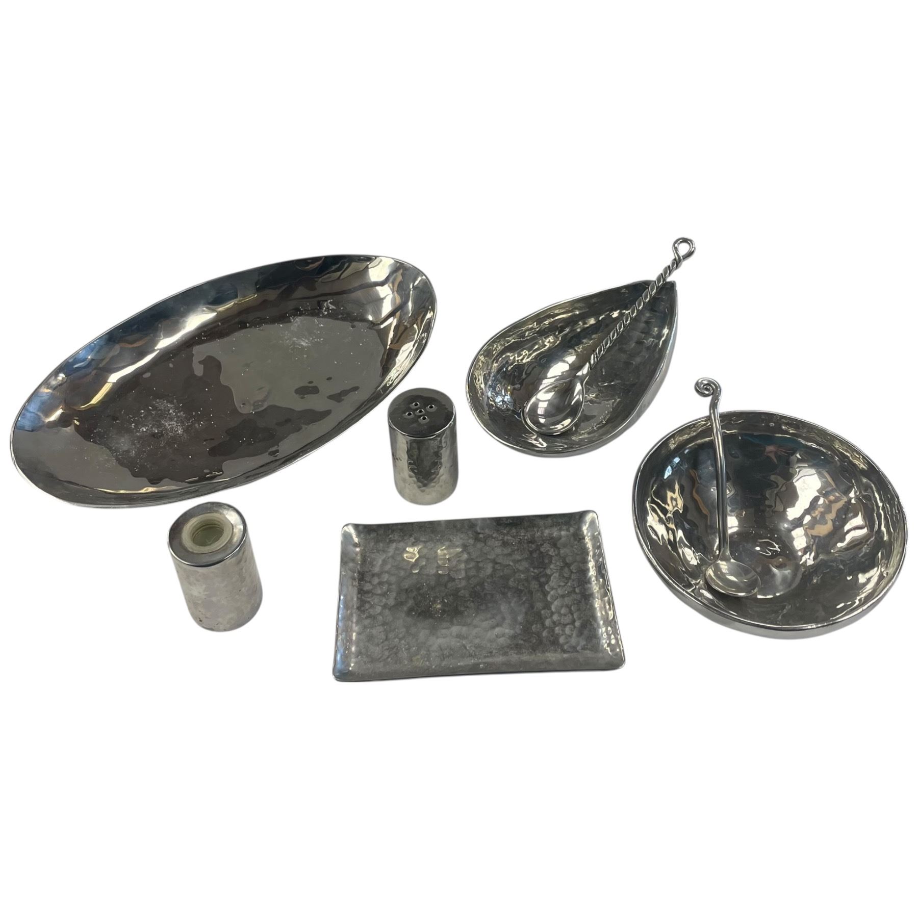 Collection of hammered metalware featuring a polished silver-tone finish. Includes an oval platter, serving bowl with spoon, rectangular tray, and two cylindrical salt & pepper shakers. Artisan-made decor with textured detailing. Item is as pictured.