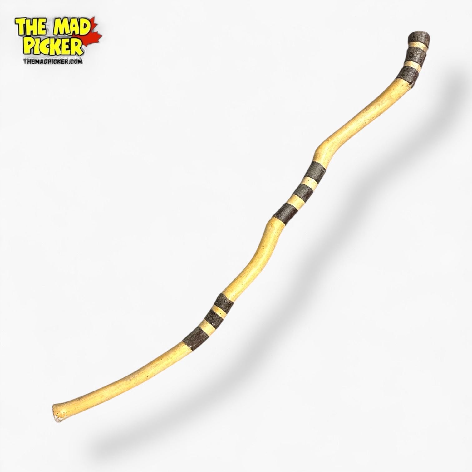 Hand-carved walking stick crafted from natural wood with a curved 'crook' handle. Features a yellow finish with hand-painted black spiral details. Rustic, handcrafted design with a partially ridged texture along the shaft. Suitable for decorative use or light walking assistance. Likely a collectible item.
