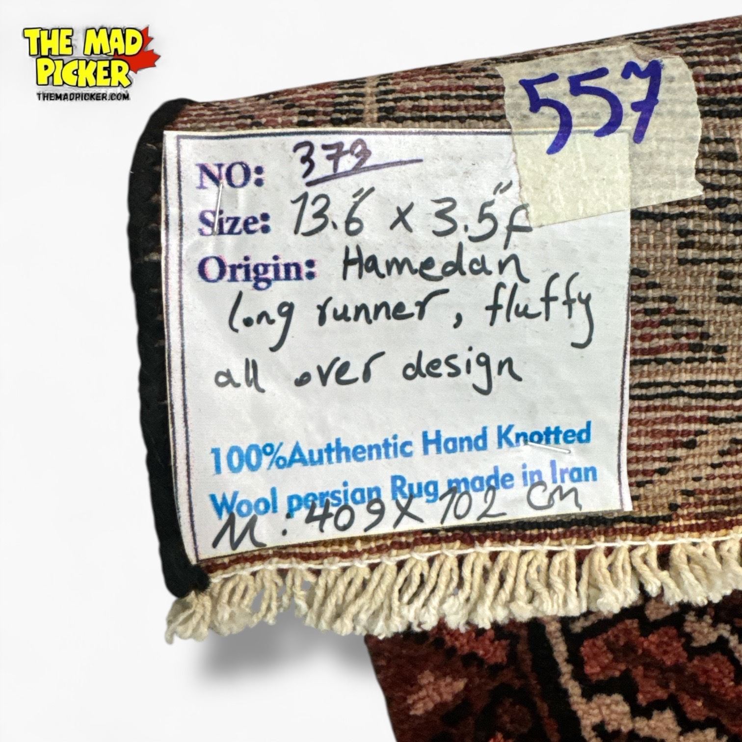 Persian runner rug, 100% hand-knotted wool from the Hamedan region of Iran. Measures 40x702cm. Features a long, fluffy texture and traditional Hamedan weaving technique. Known for durability and intricate patterns, Hamedan rugs are crafted in a region with a rich carpet-making heritage. #373