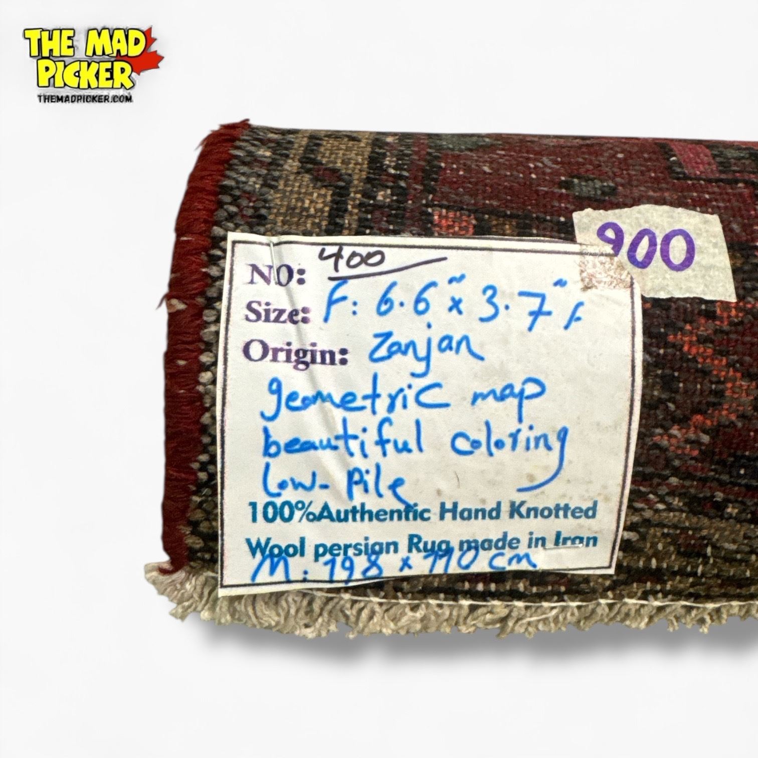 100% hand-knotted Persian rug from the Zanjan region of Iran. Made of wool with a low pile, this piece features intricate patterns and vibrant coloring characteristic of Zanjan craftsmanship. Measures 198x110cm.