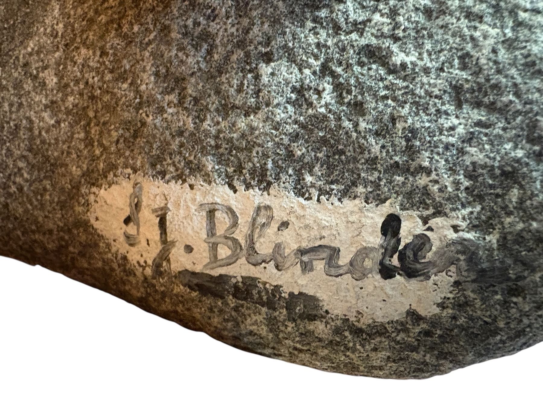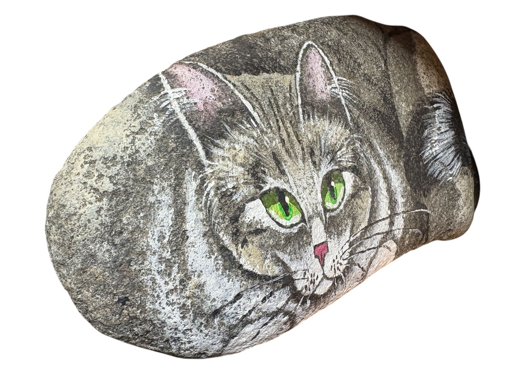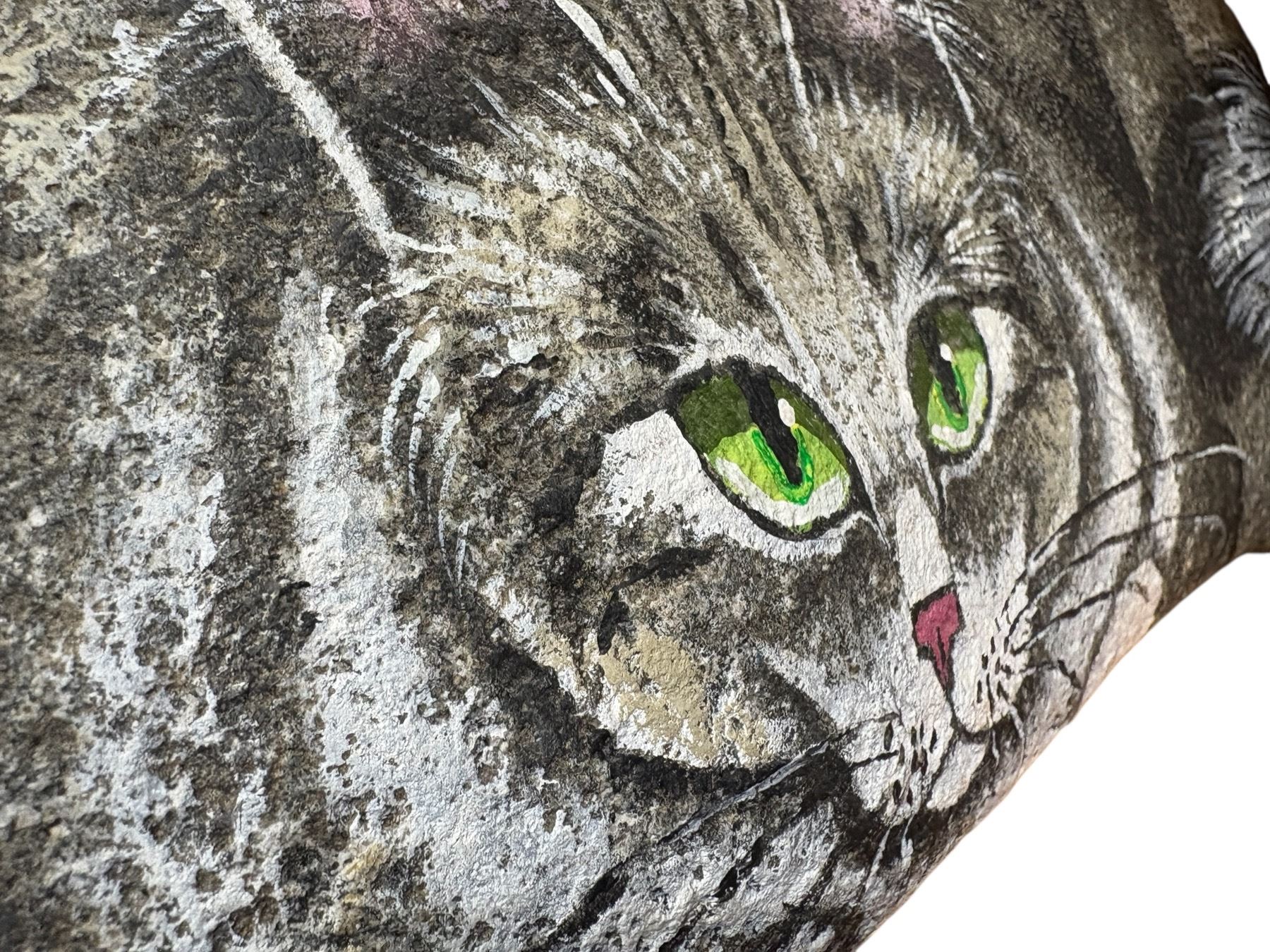 Rustic folk art piece featuring a hand-painted cat design on a natural stone. The stone measures 17 inches wide and showcases detailed craftsmanship and vibrant colors. Origin and artist unknown. Suitable for display as a decorative art object or a unique conversation piece.