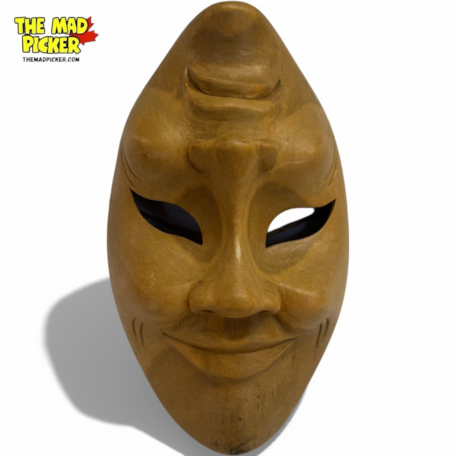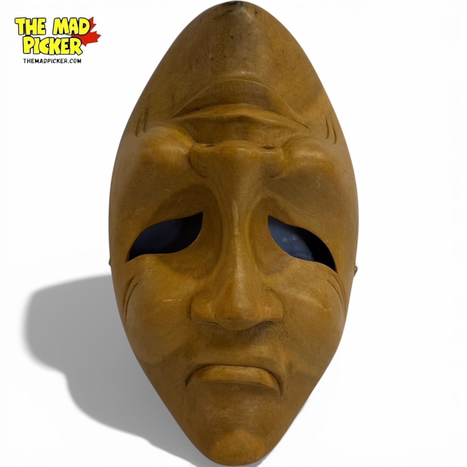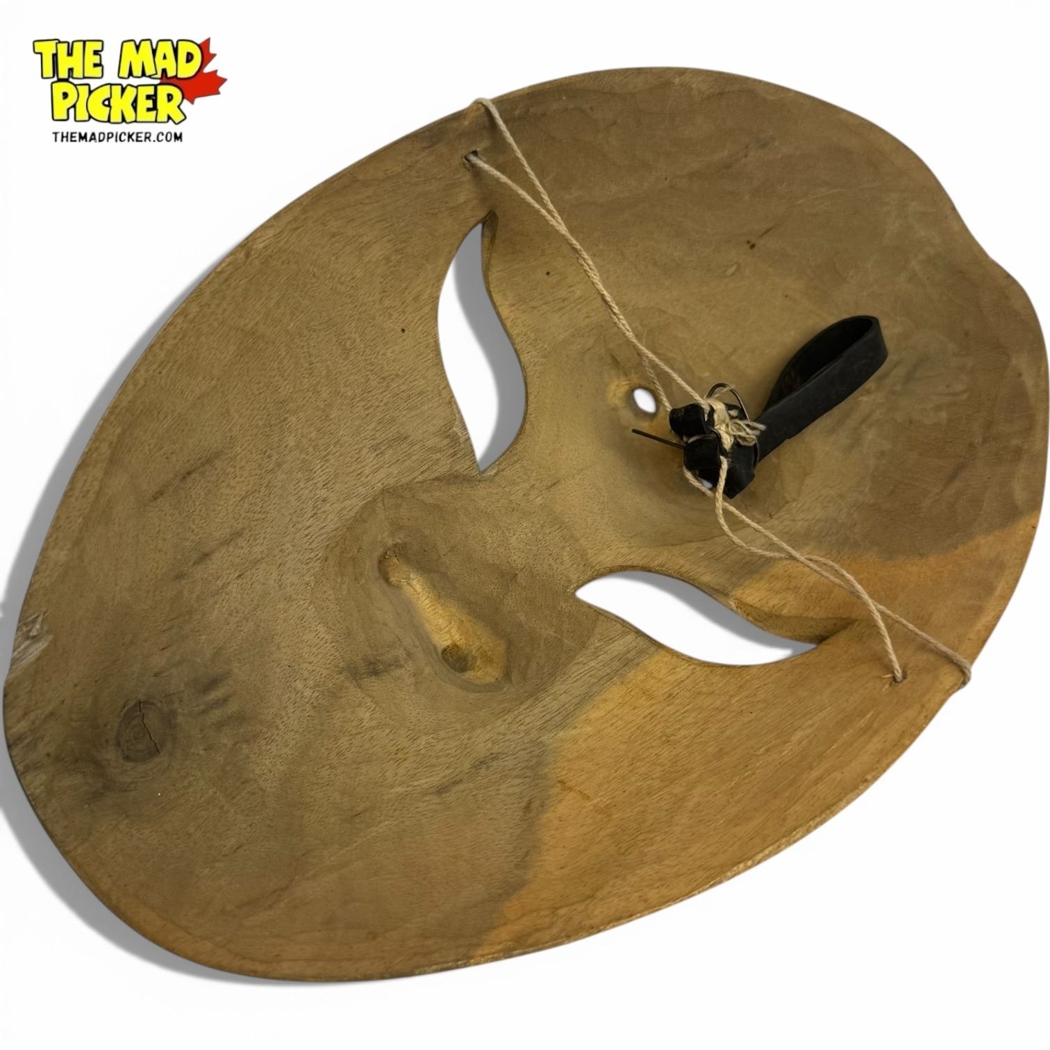 Hand-carved reversible wall art mask crafted from hibiscus wood in Bali. Features dual designs: the comedy and tragedy masks, symbolizing theater's two major expressions. Intricate carving showcases traditional Balinese artistry. Dimensions approximately 10-12 inches in height.