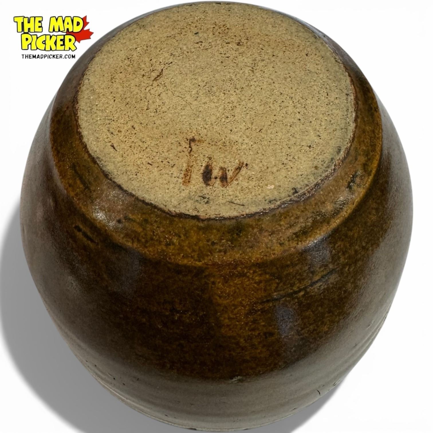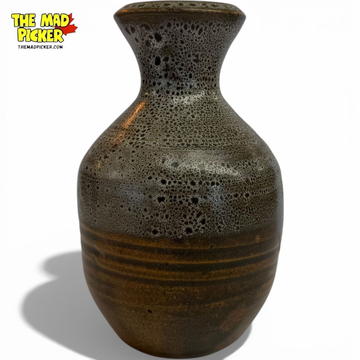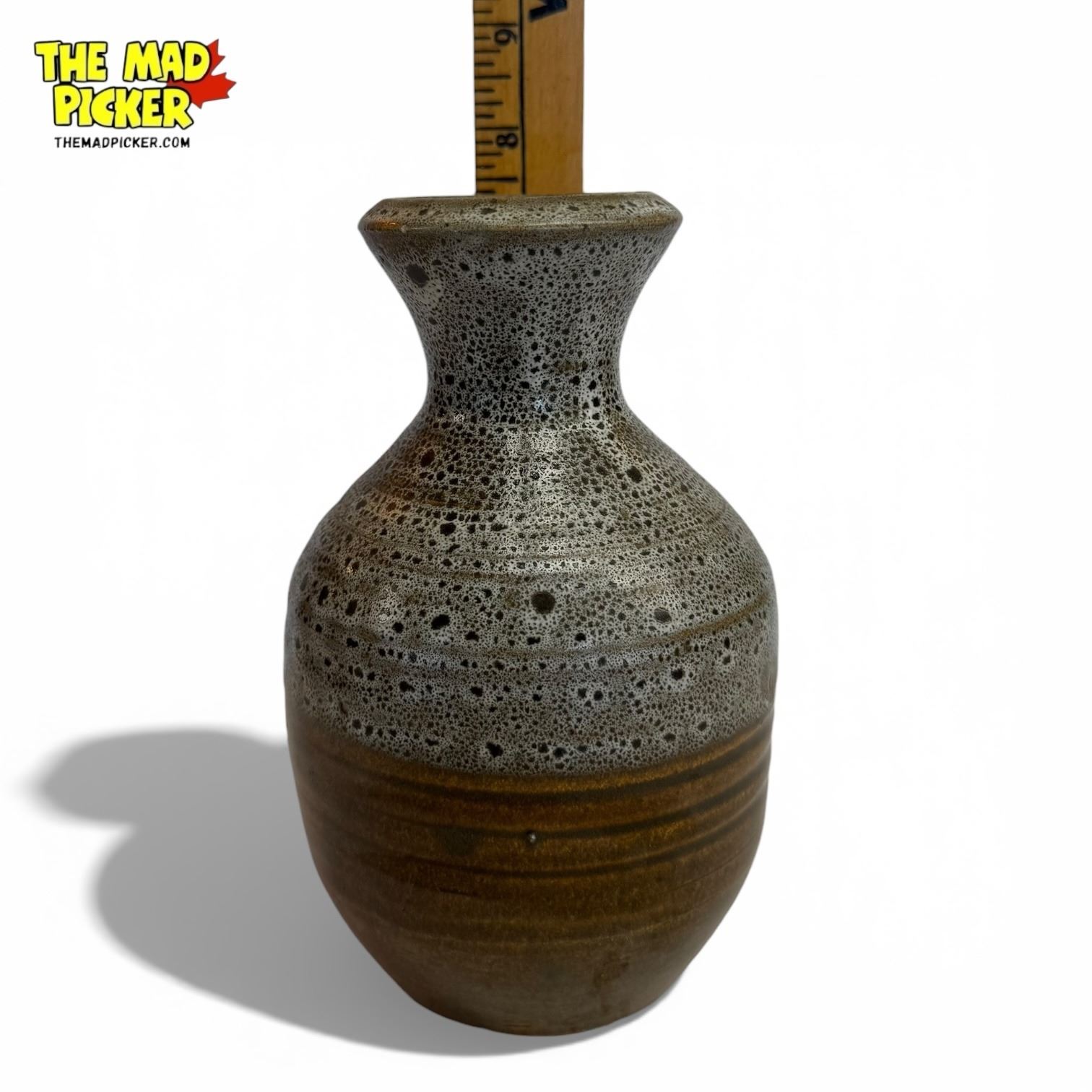 Hand-thrown studio pottery vase, 7.5 inches tall, featuring a brown and speckled salt glaze finish. Organic wabi-sabi design with raw, earthy textures. Narrow notched neck and bulbous body. Handcrafted and signed 'TW' on the base. Resembles traditional salt glaze or Rockingham glaze techniques.