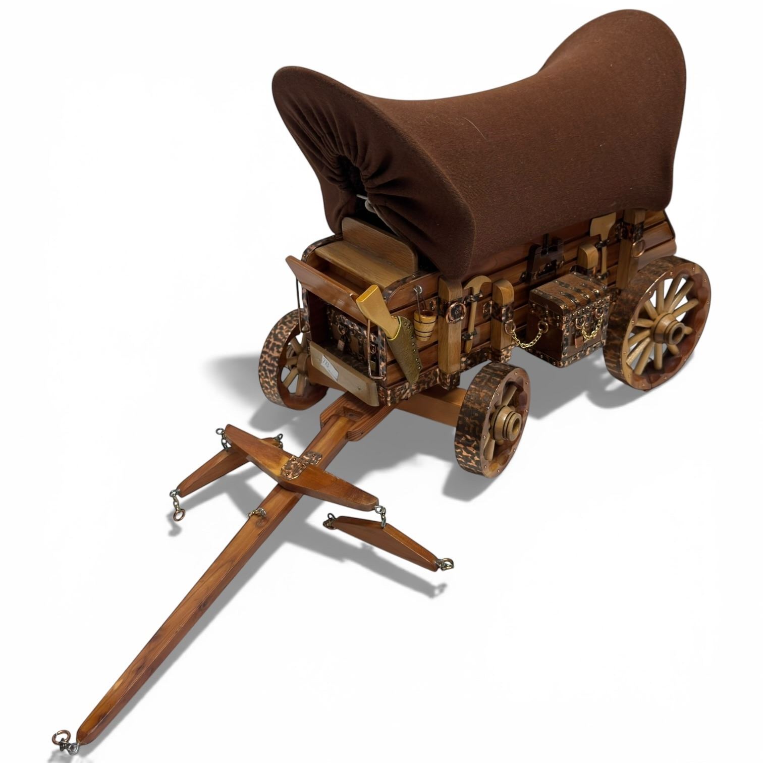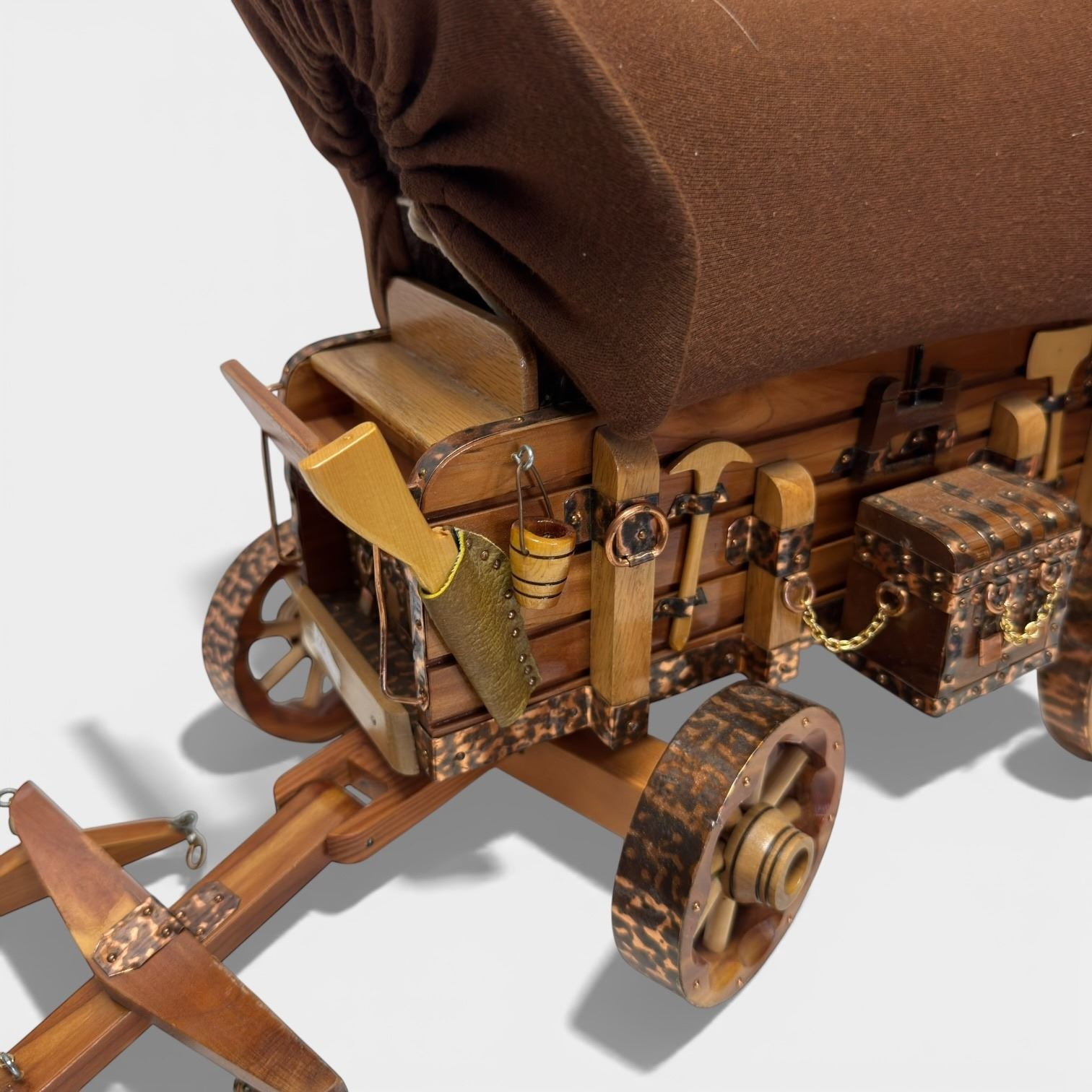 Handcrafted wooden Western Americana covered wagon featuring fabric covering, copper accents and varnish finish. The wagon measures 23-Inch in length, 7.5-Inch in width and 11-Inch in height. Item is as pictured.