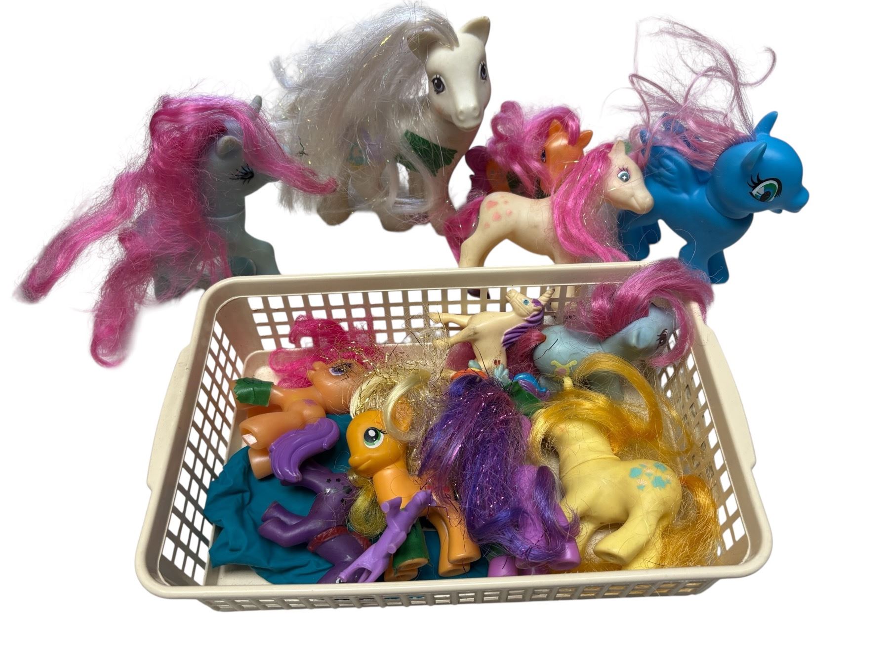 Collection of My Little Pony dolls by Hasbro, spanning various generations from the 1980s through the 2000s. Includes multiple ponies in differing styles, colors, and designs. Produced during the G1 to G3 eras, representing iconic characters and styles. Exact pony count, accessories, and specific names not provided.