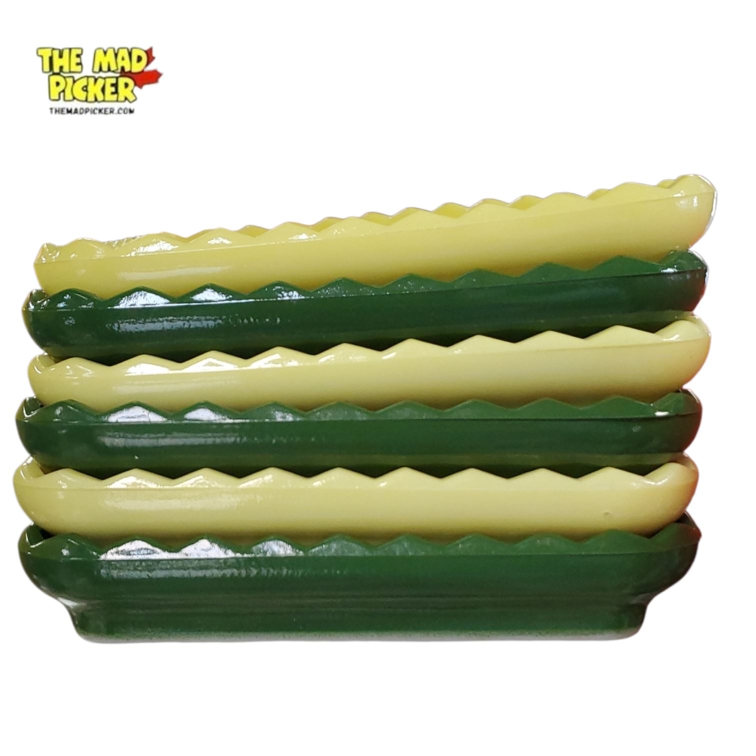 Vintage Hazel Atlas Moderntone Platonite triangular dishes, likely replacement pieces for a Lazy Susan set. Includes chartreuse green and dark green dishes with scalloped edges. Made of opaque pressed Platonite glass by Hazel-Atlas Glass Company, mid-20th century. Classic mid-century modern design.