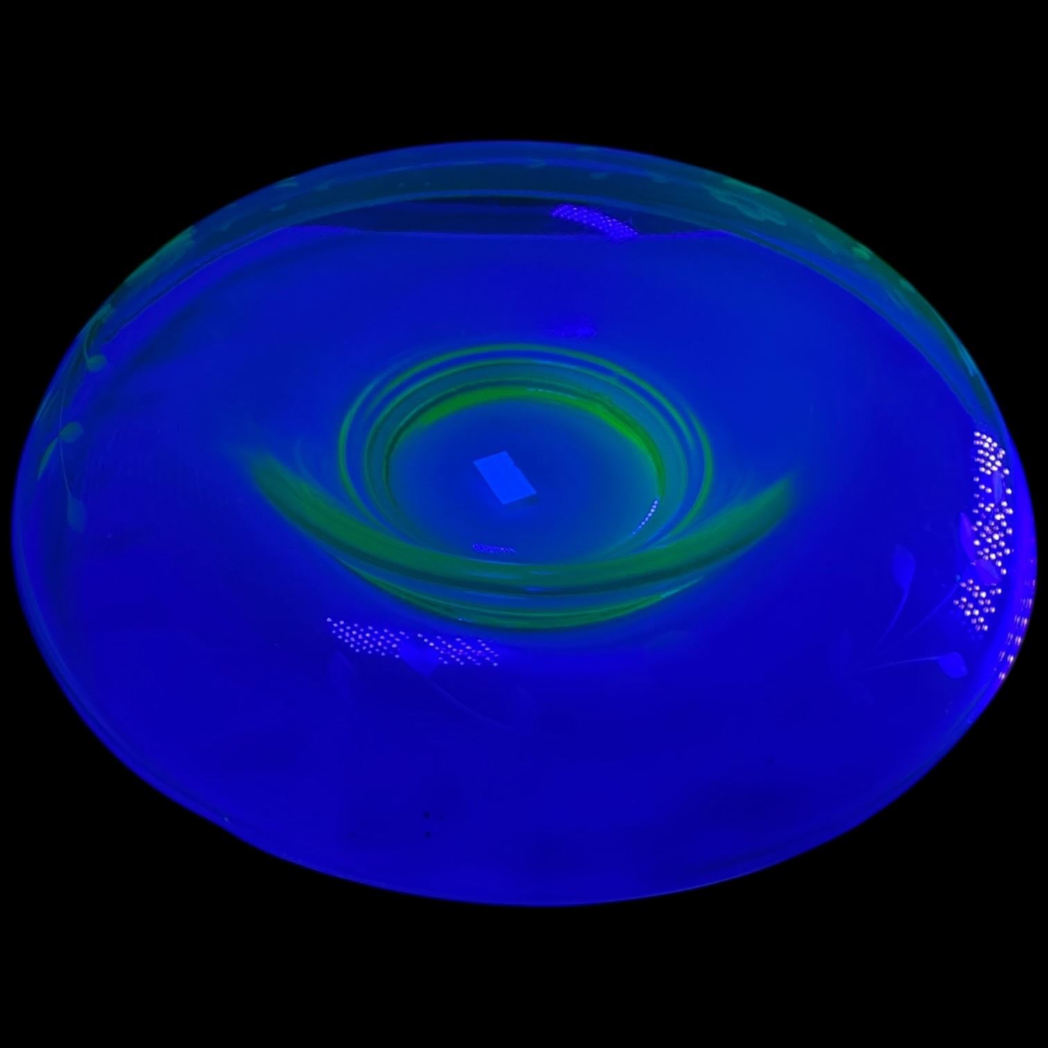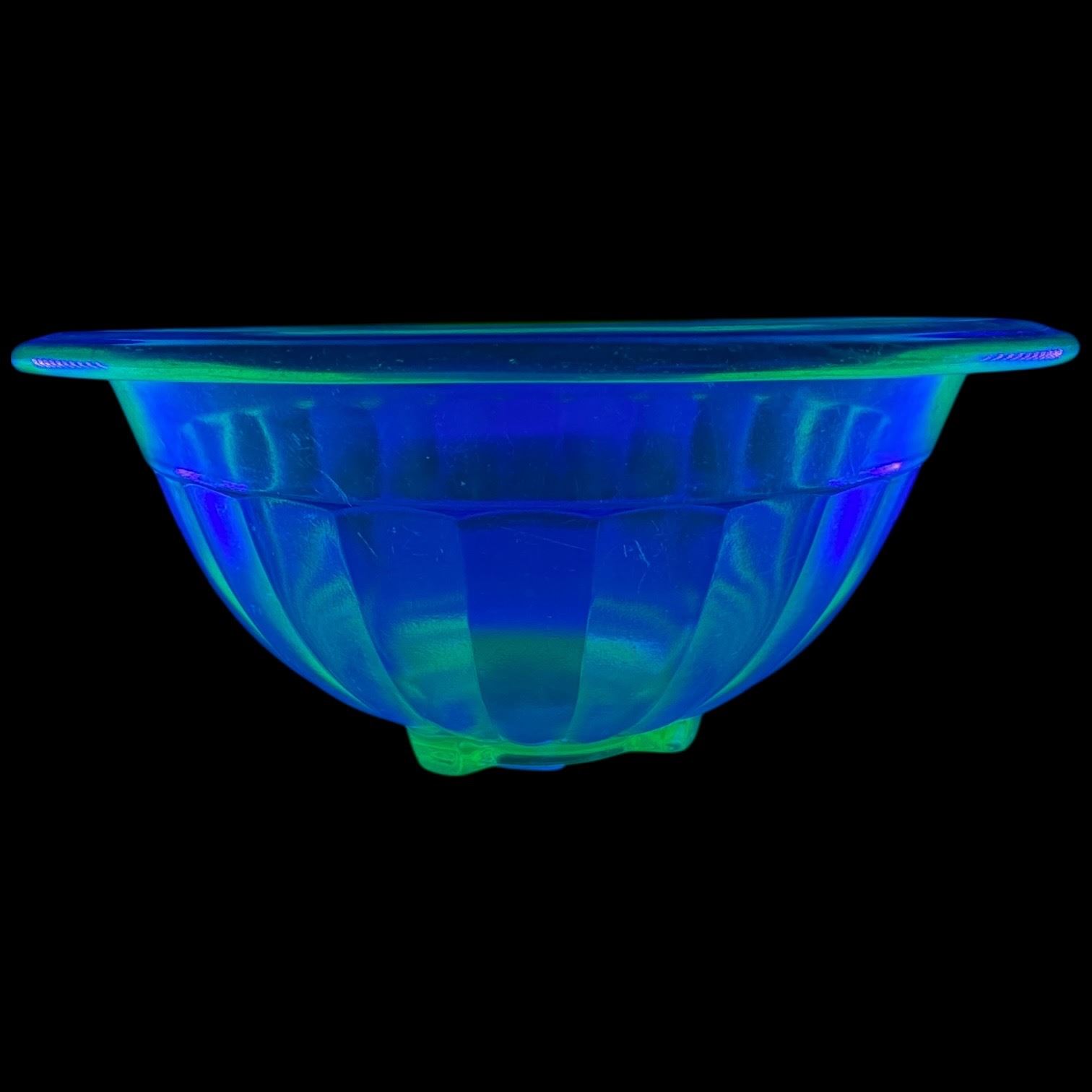 Lot includes a Hazel Atlas uranium glass bowl with a 7-Inch diameter and a uranium glass console bowl measuring 12-Inch in diameter. Both feature the characteristic green glow under UV light. Items are as pictured.