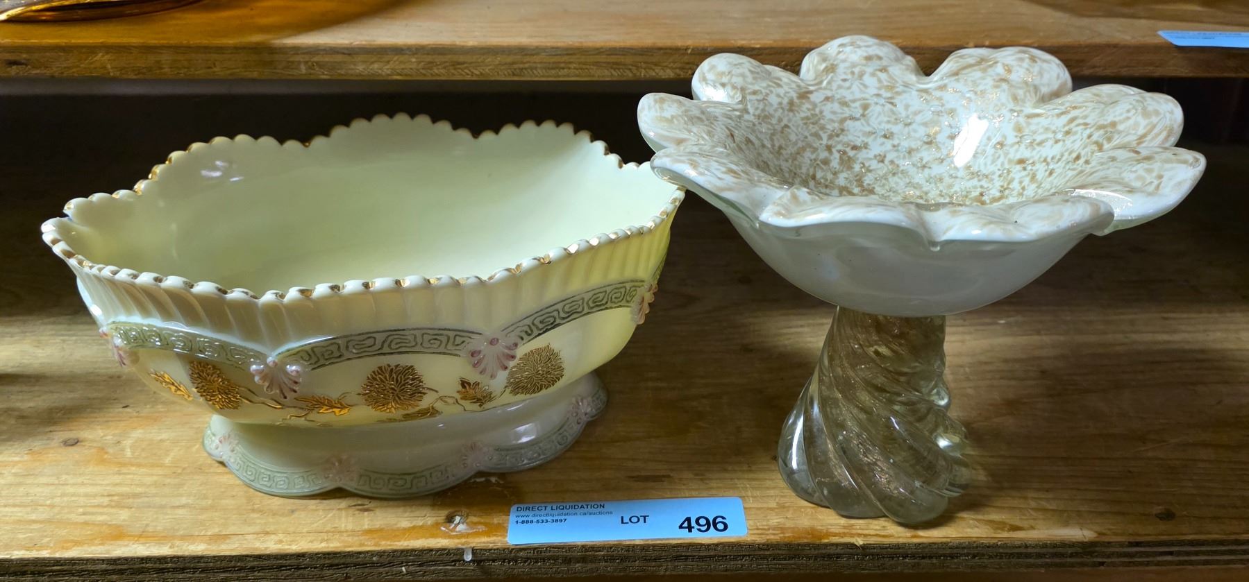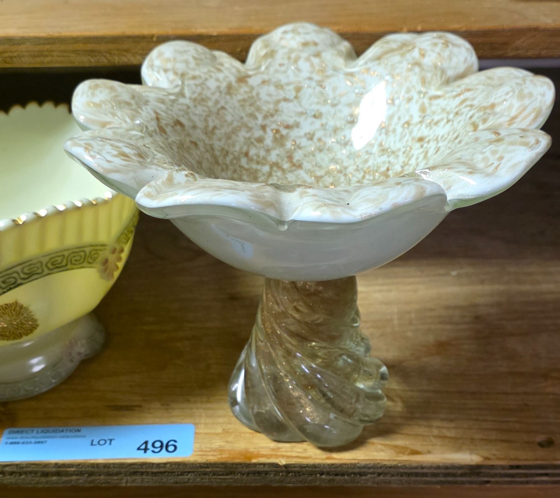 Heavy vinetian cased gold fleck pedestal bowl art glass. 1899 EAPG Northwood Chrysantheum Sprig Uranium Custard Glass