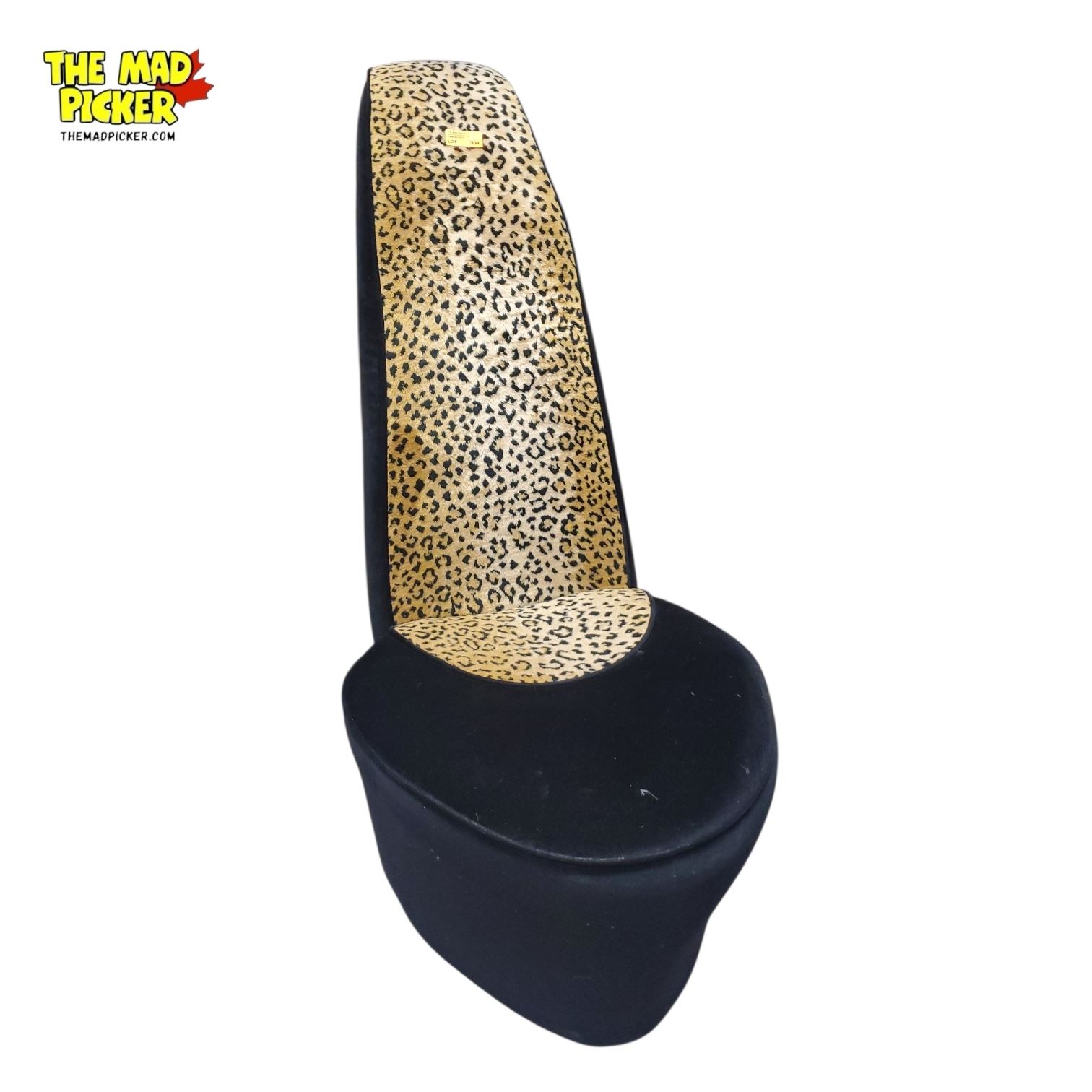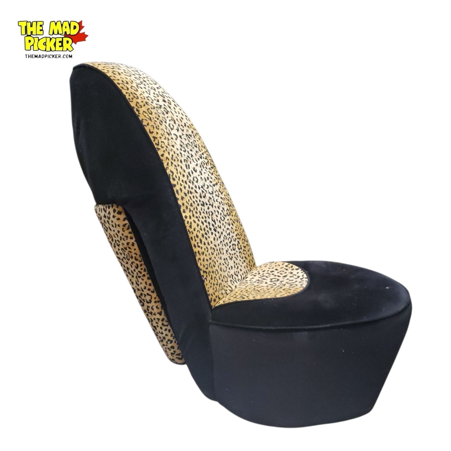 High-heel shoe-shaped accent chair with black and leopard-print fabric upholstery. Distinctive design suitable for decorative or occasional seating use. Stands 39 inches tall. Features a mix of bold patterns and textures for a striking visual impact.