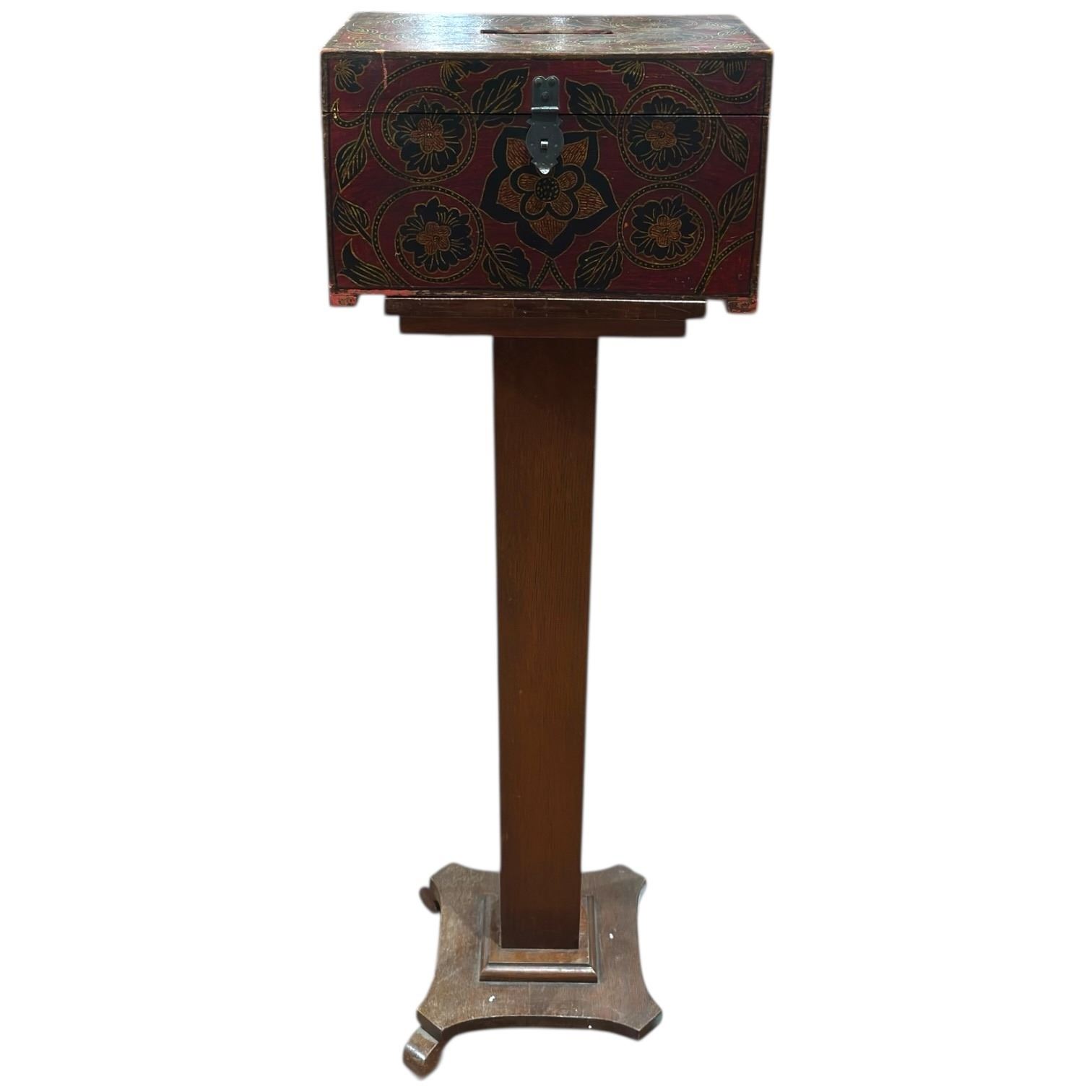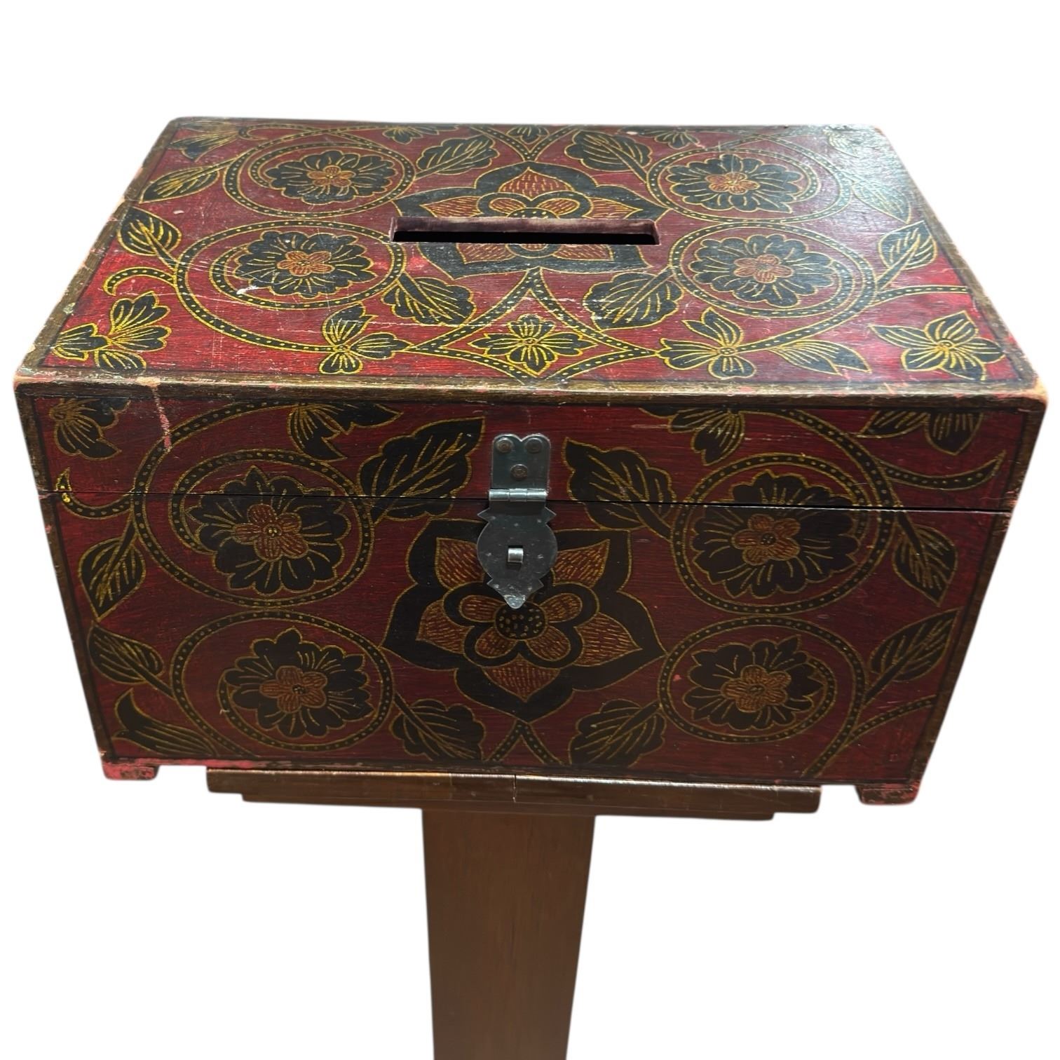 Himalayan painted ballot box mounted on a pedestal stand. Dimensions are 16-Inch length, 11-Inch width, and 45-Inch height. The stand shows some easily repaired damage. Decorative and functional, item is as pictured.