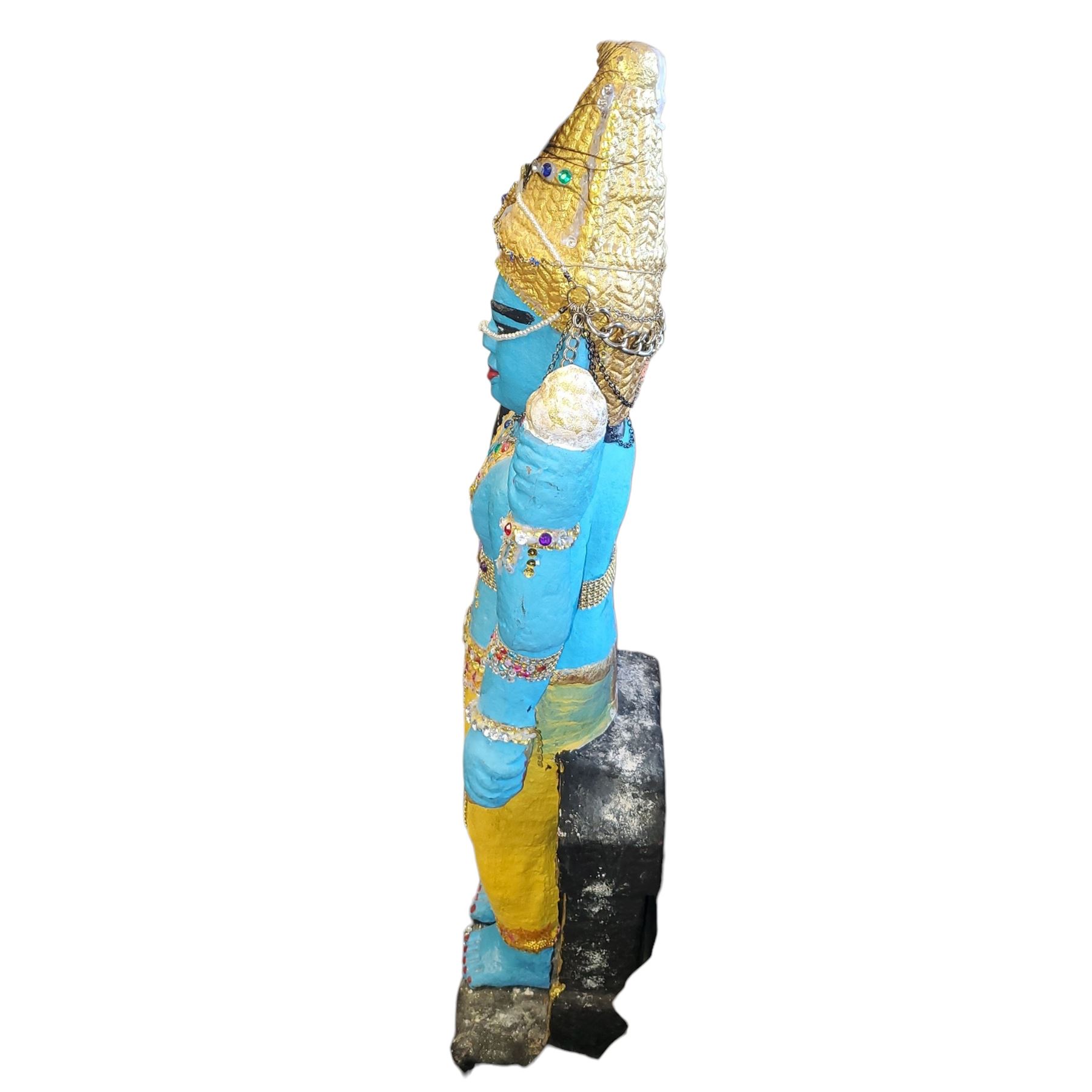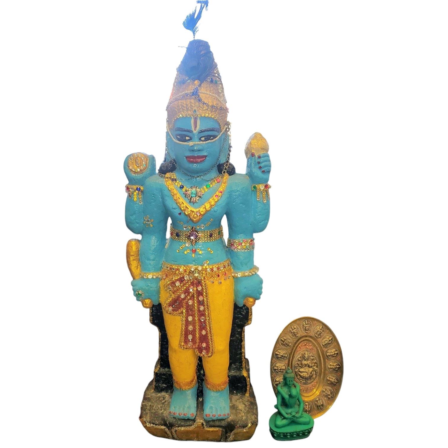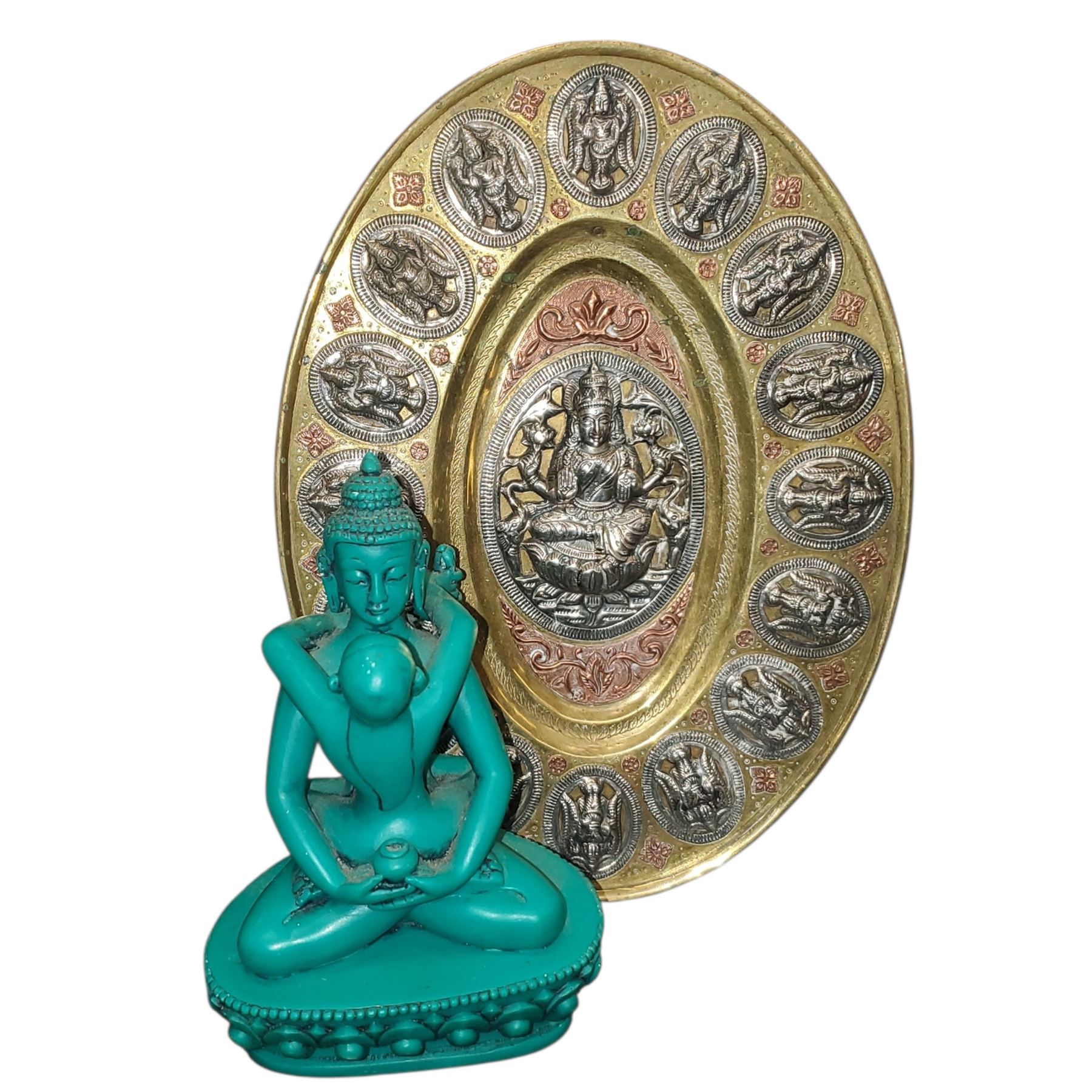 Lot includes a Hindu Guruvayurappan statue, a Tanjore brass art plate, and two green resin Samantabhadra statues. The Guruvayurappan and Samantabhadra figures depict traditional religious iconography, while the brass plate reflects the Tanjore region's artistic heritage. Item is as pictured.