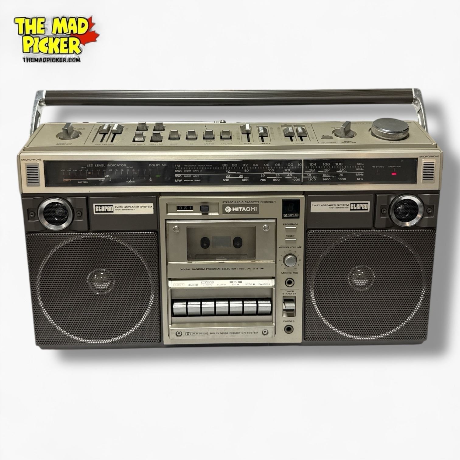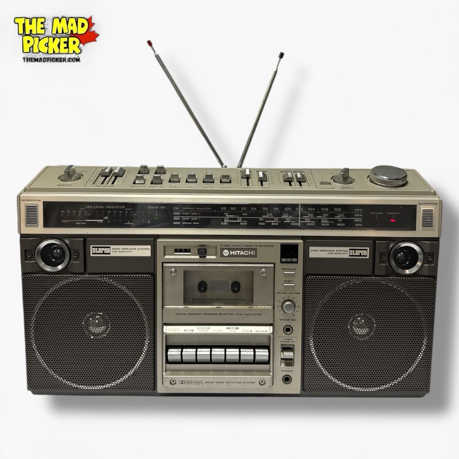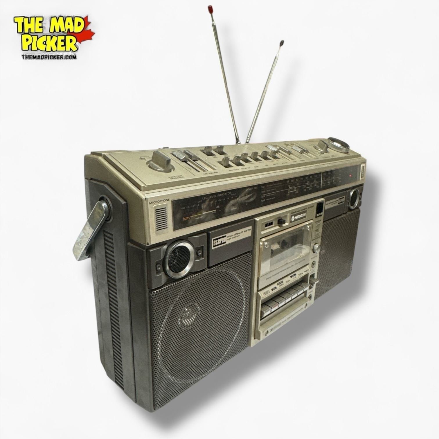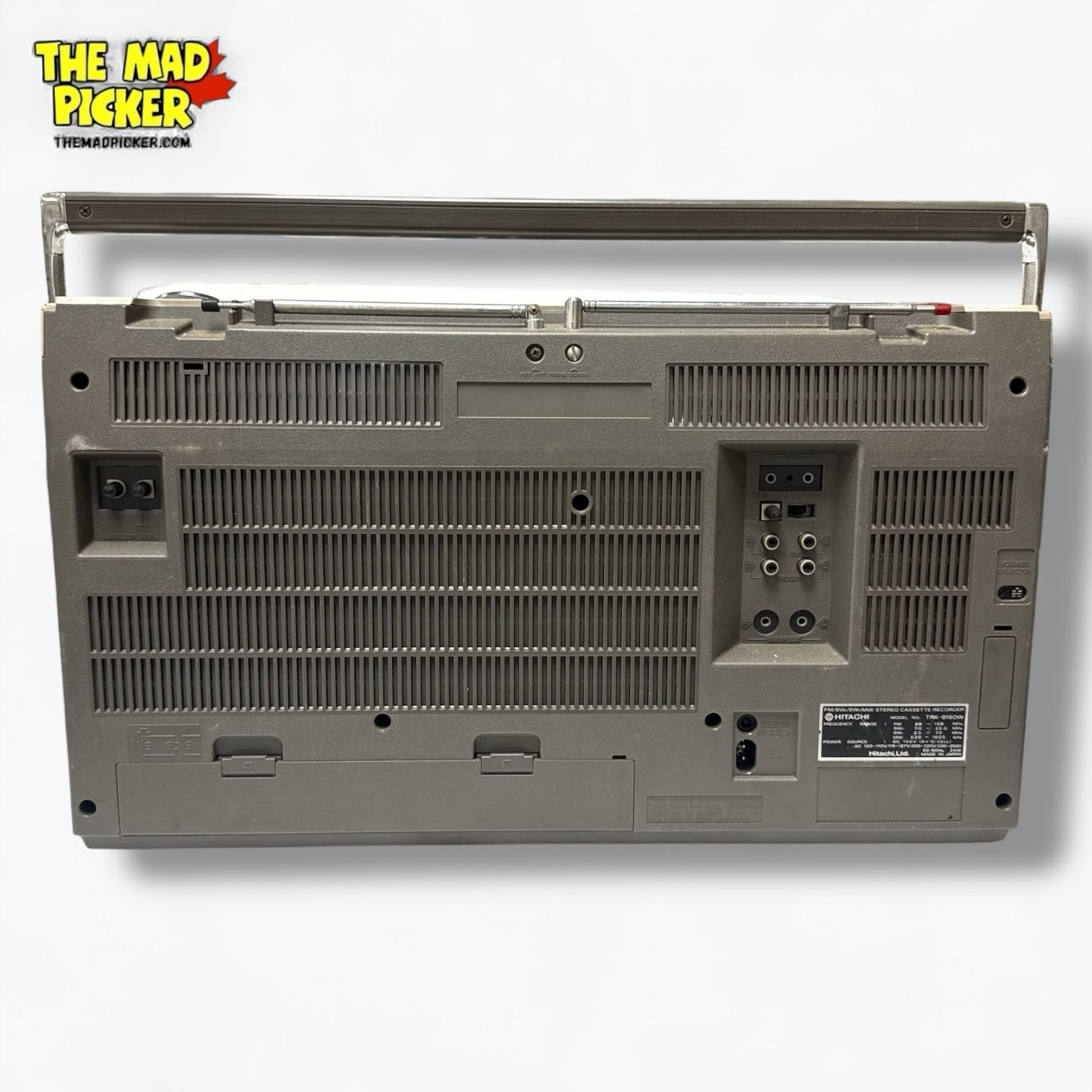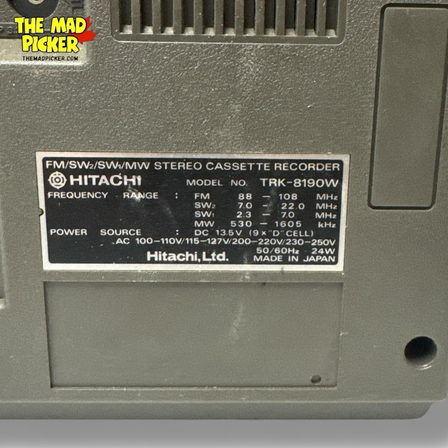 Hitachi TRK-8190 portable stereo cassette recorder and AM/FM radio from the 1980s. Features dual cassette decks, AM/FM tuner, and built-in microphone for recording. Known for its classic boombox design with large front-facing speakers and retractable handle. Powered by AC or batteries.