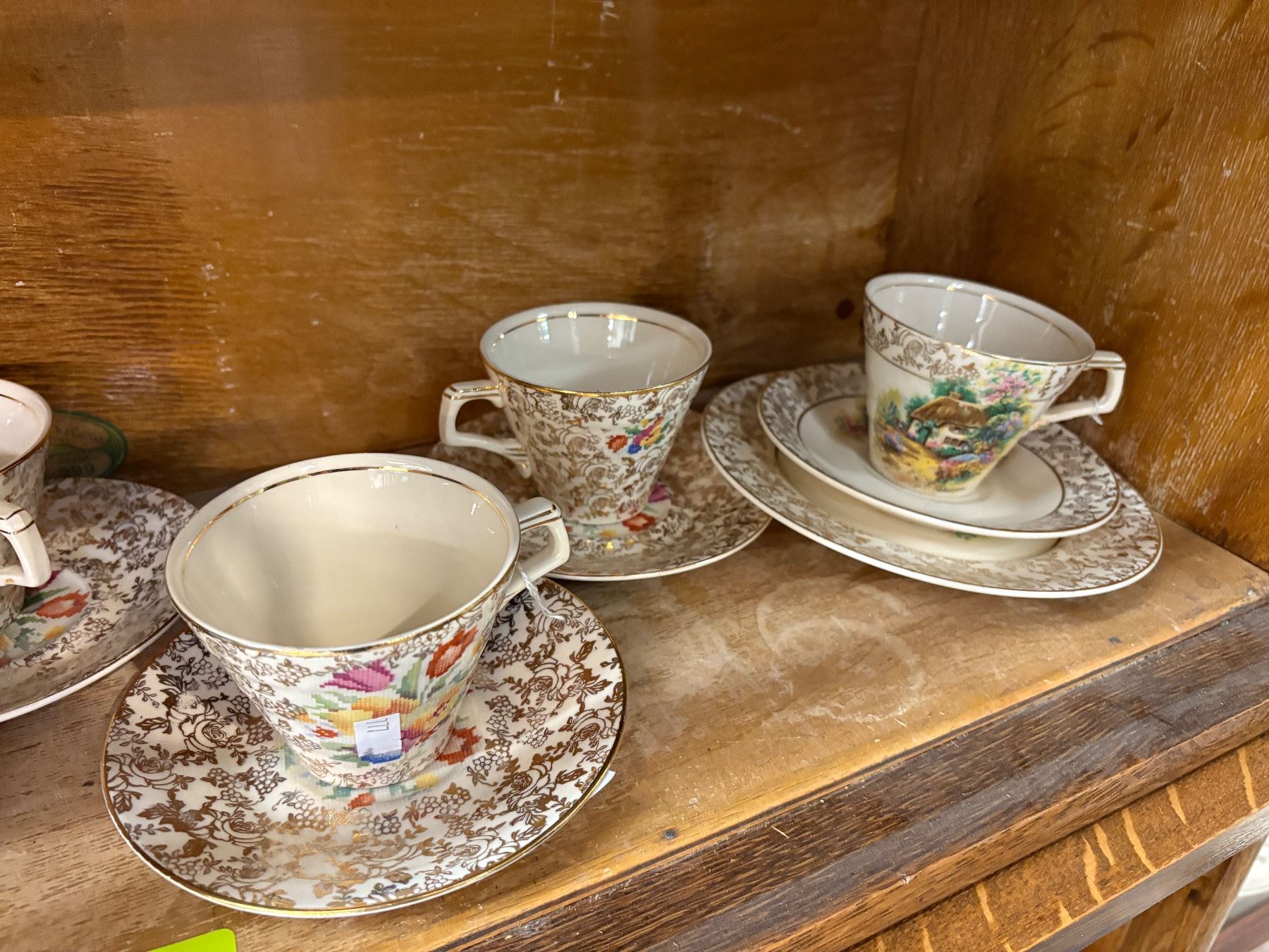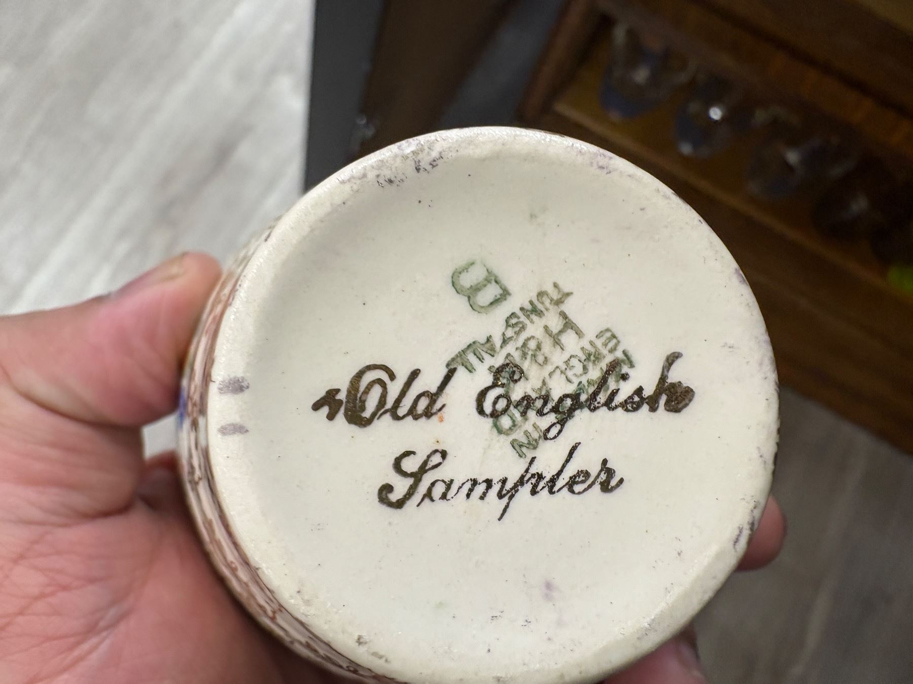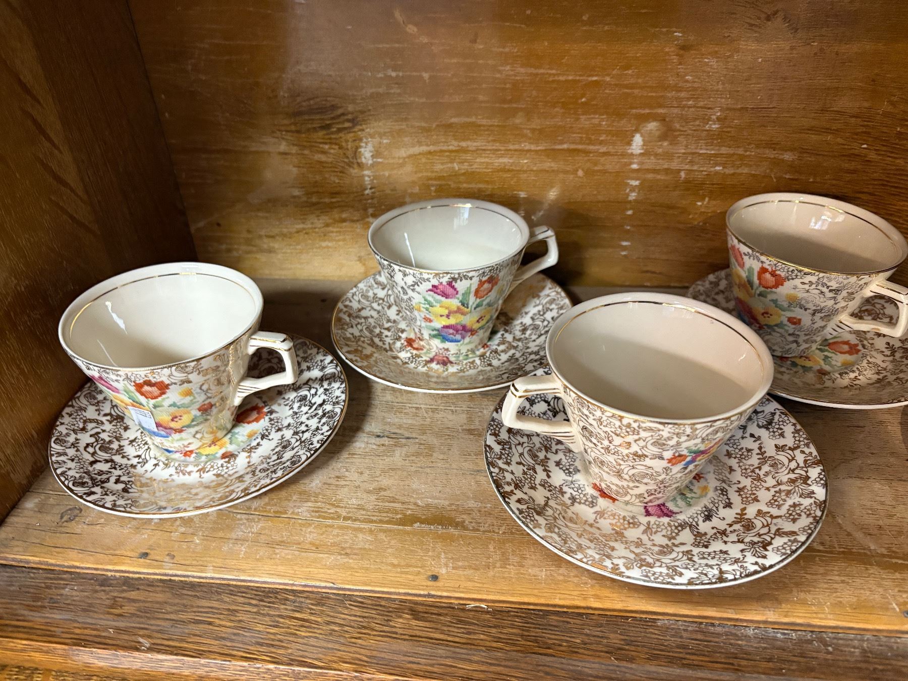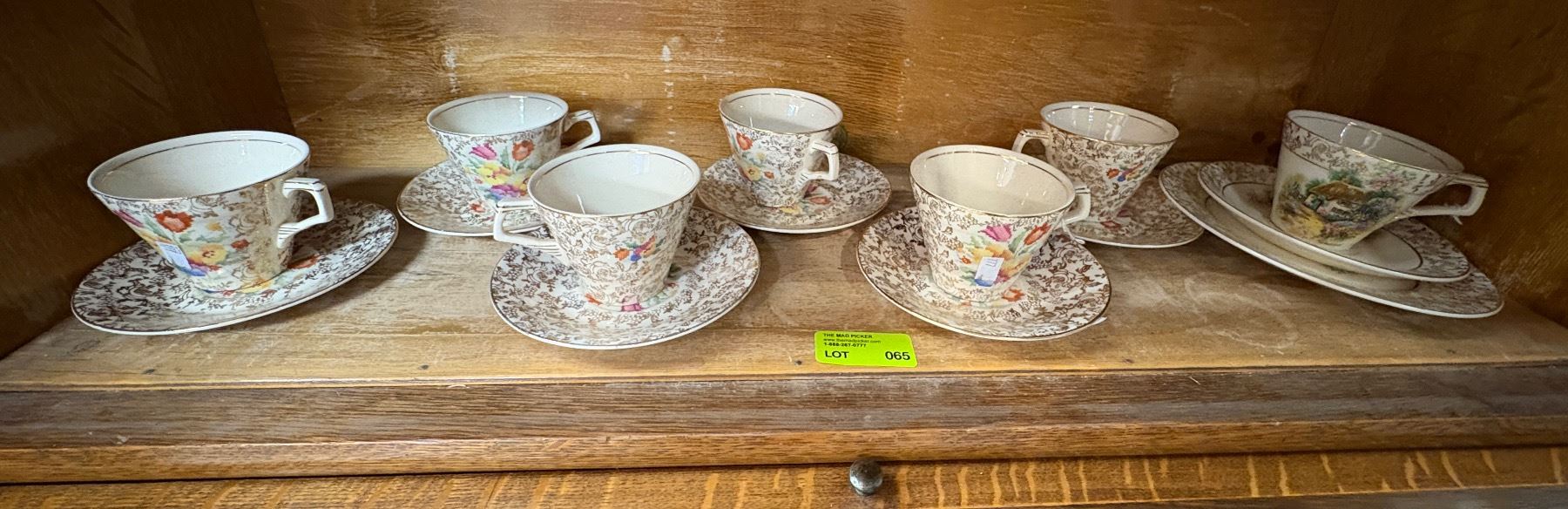 Set of 7 teacups by Hollinshead & Kirkham (H&K) Tunstall in the 'Old English Sampler' pattern. Made in England, mid-20th century. Features floral and geometric motifs on cream-colored ceramic. Marked on the base with H&K Tunstall stamp. Known for their decorative mid-century pottery.
