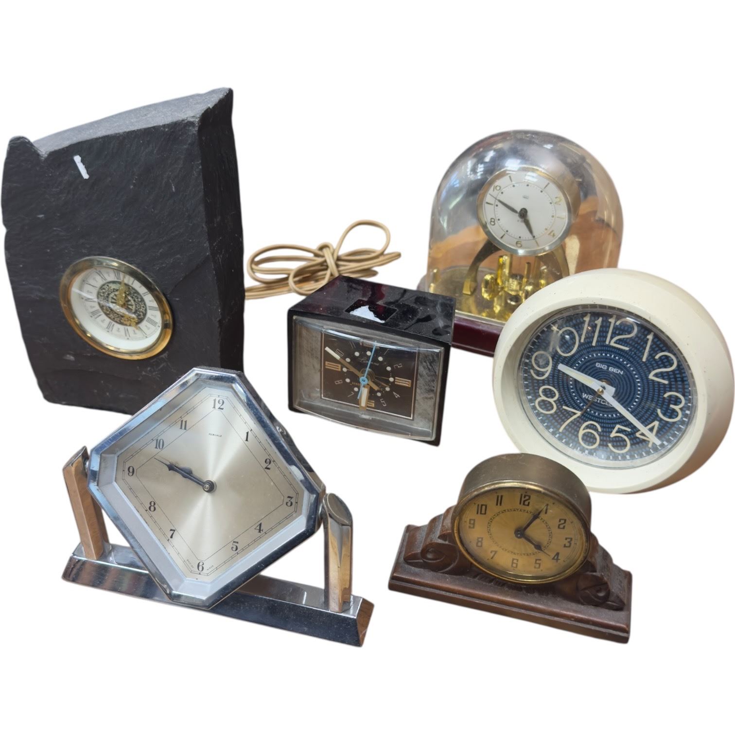 Collection of 10 clocks from various manufacturers including Smith's, West Clock, Perivale, General Electric and more. Assorted styles and types suitable for horological study. Item is as pictured.