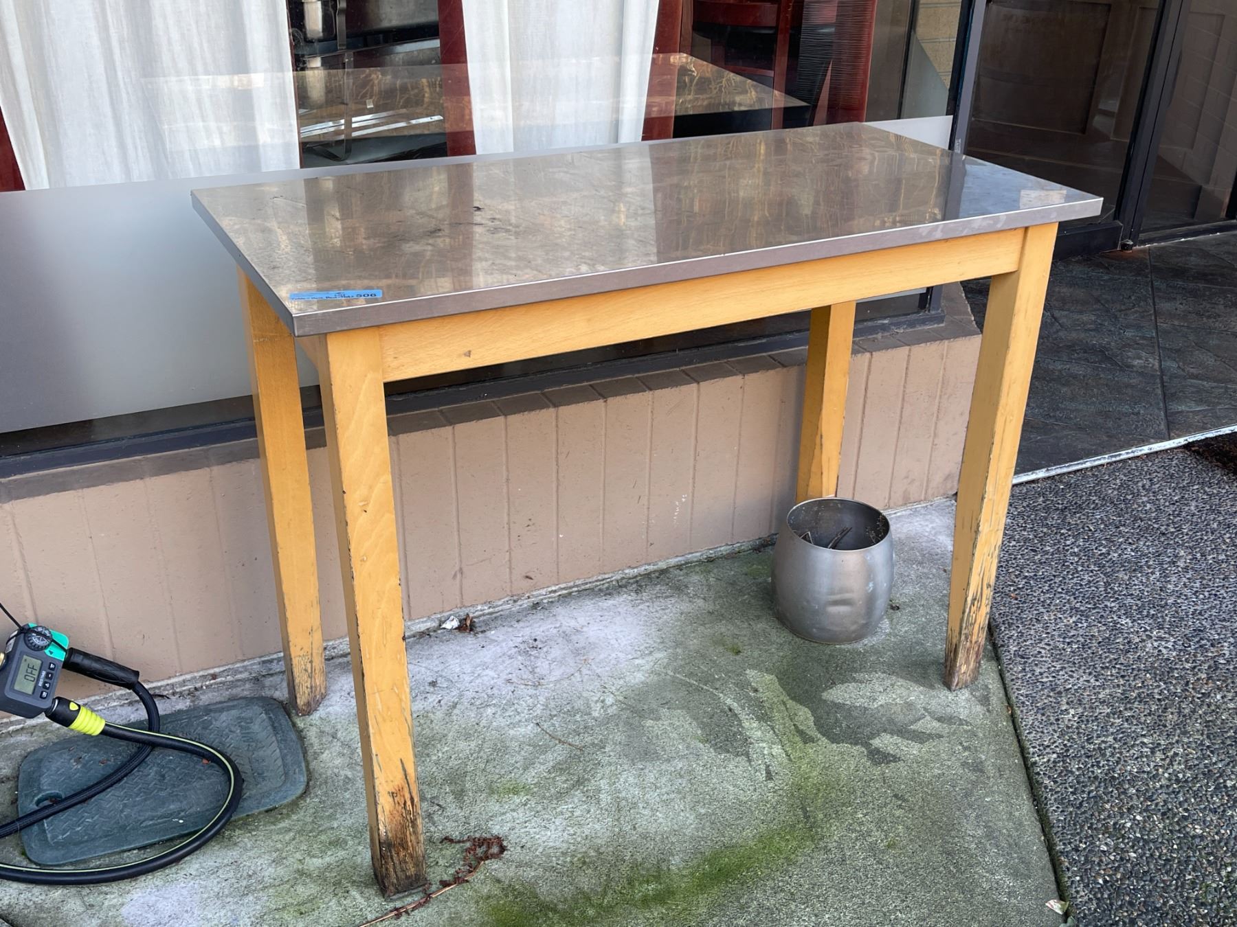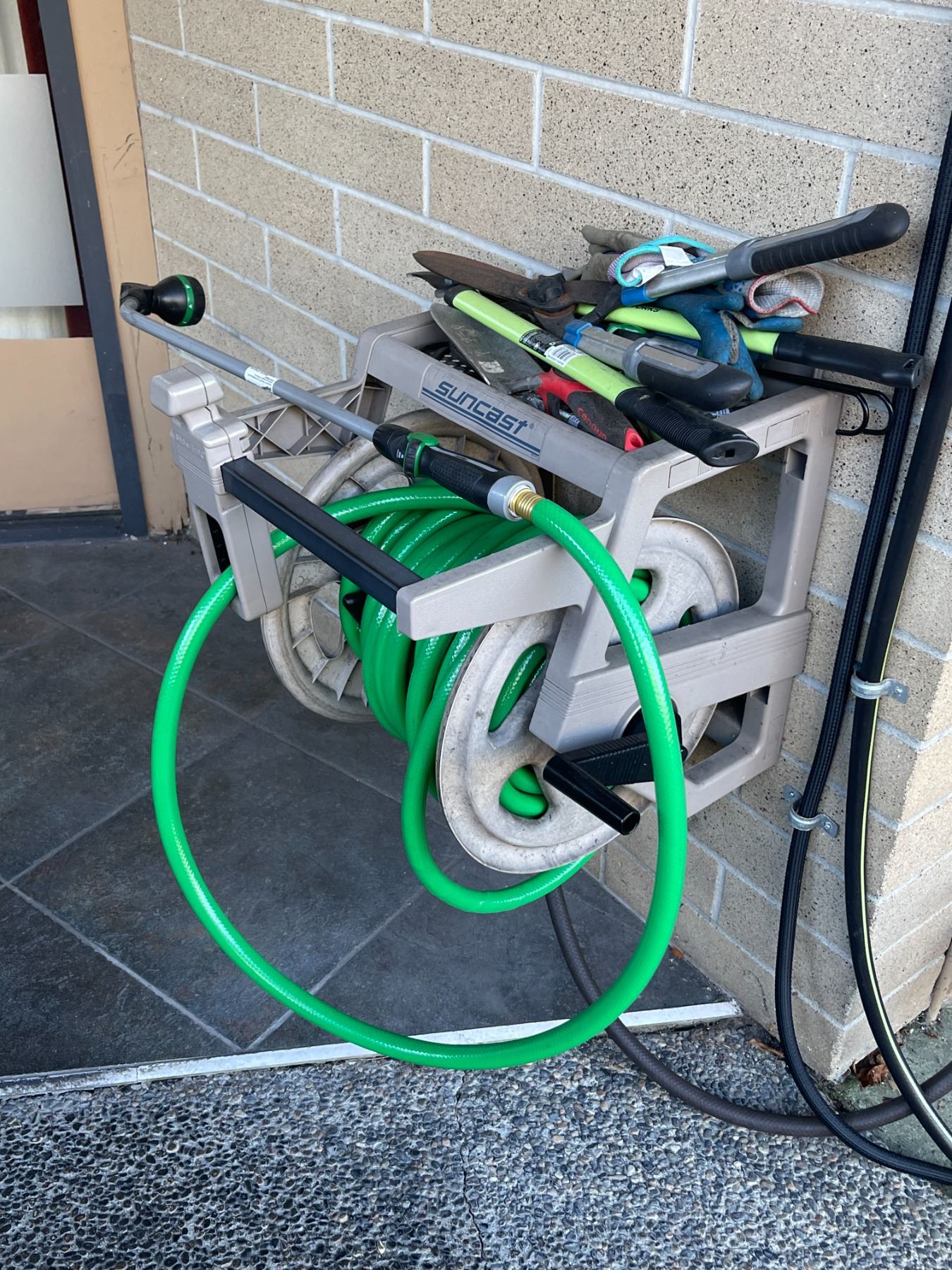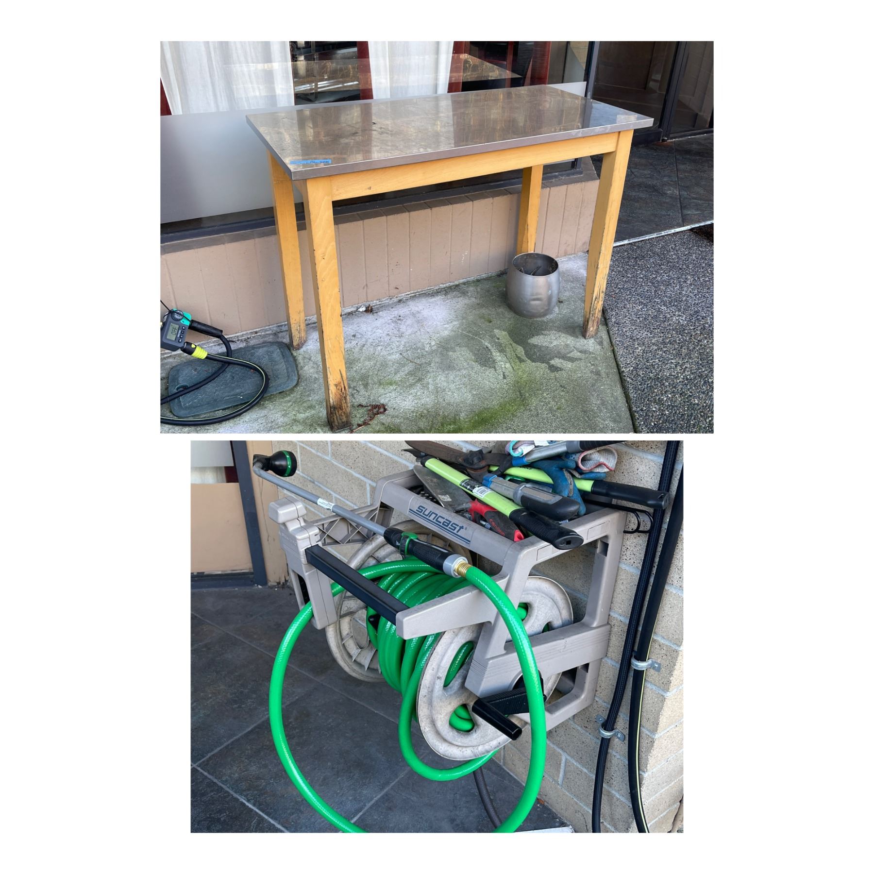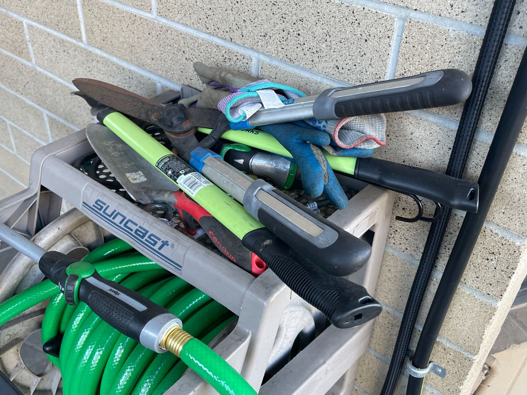 Hose reel w/ gardening tools & table w/ stainless steel top