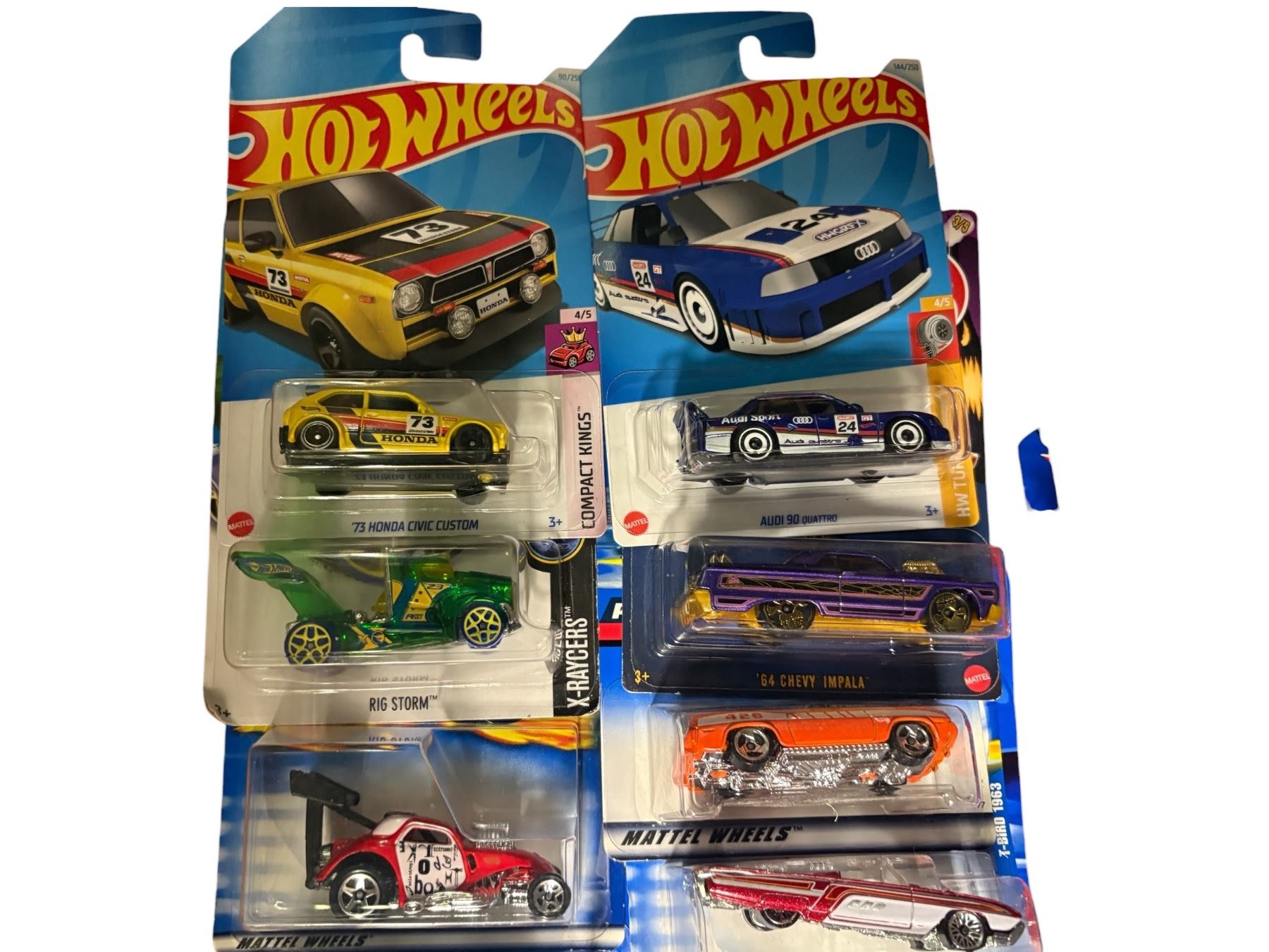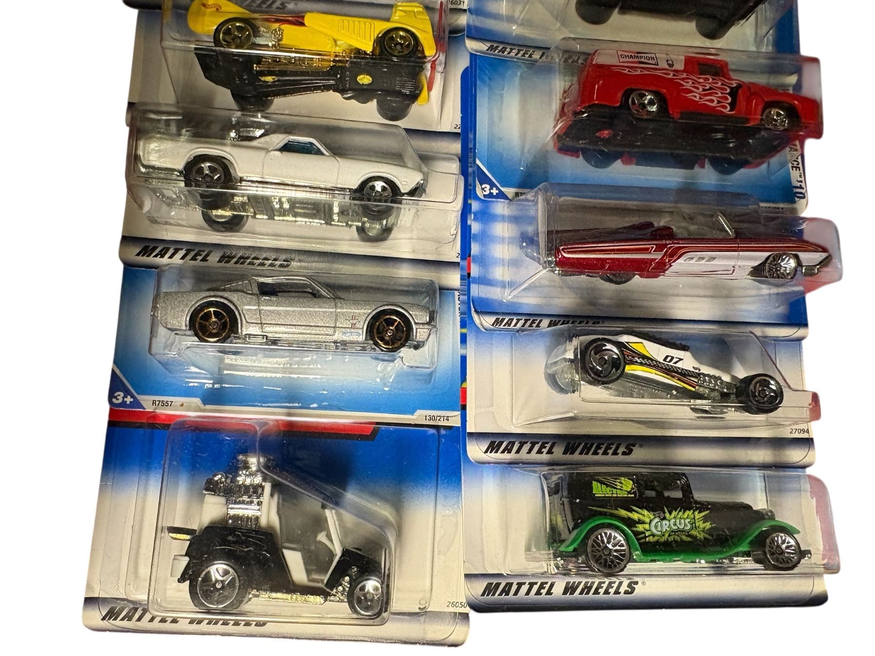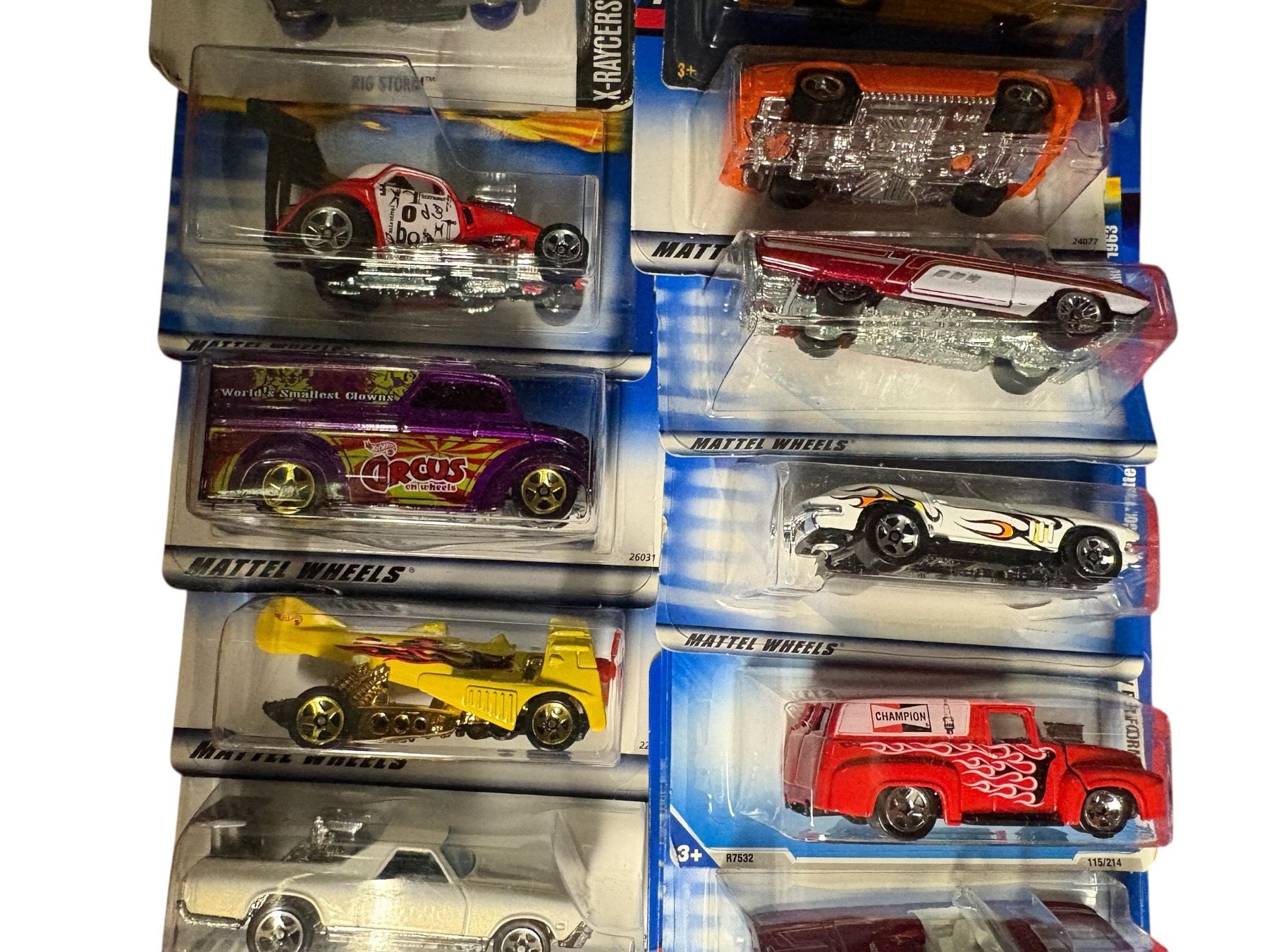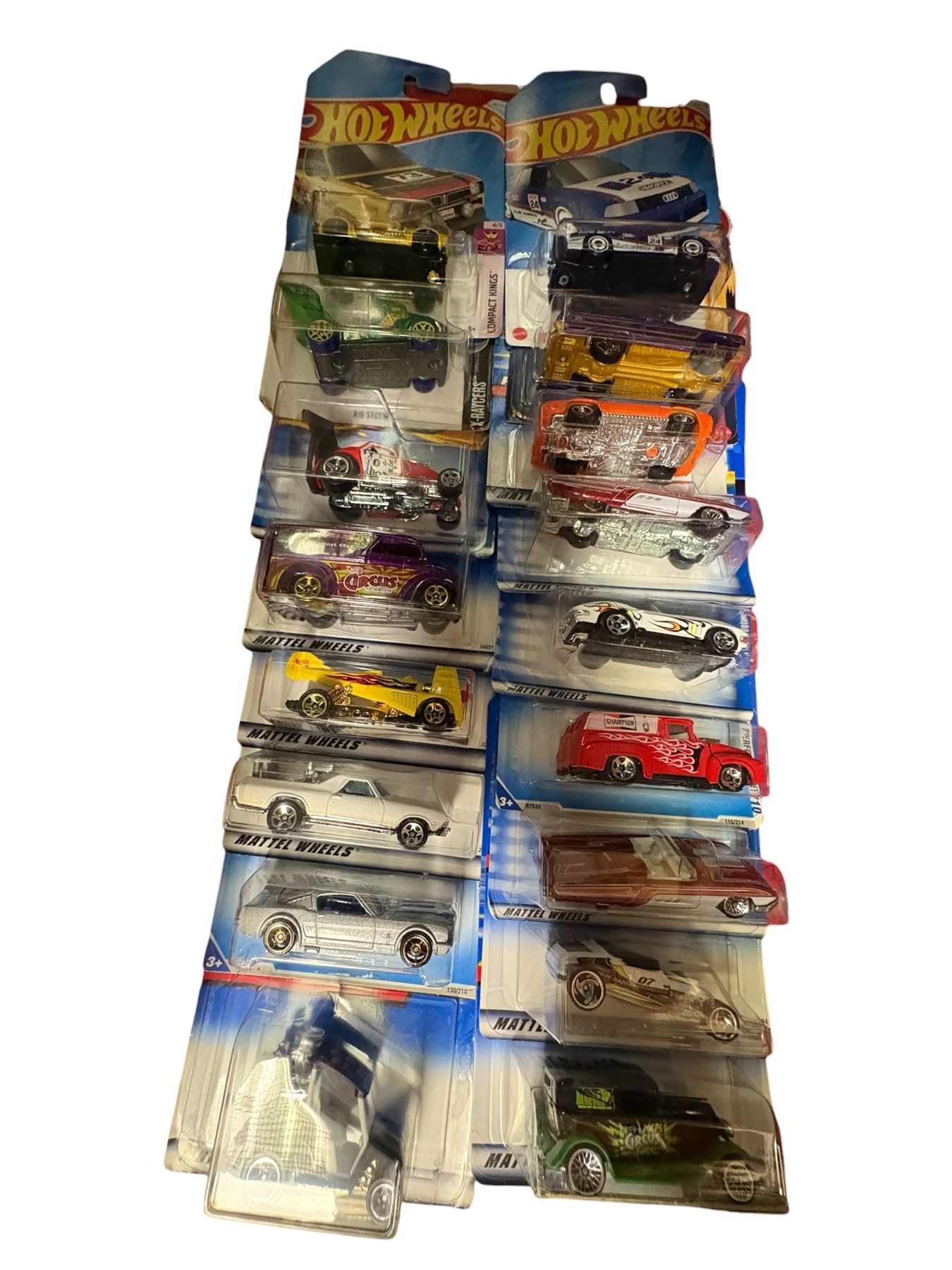Collection of 17 Hot Wheels diecast cars, assorted models. Each car remains sealed in its original blister pack. Includes a mix of designs and eras, showcasing detailed craftsmanship. Suitable for display or storage in unopened condition.