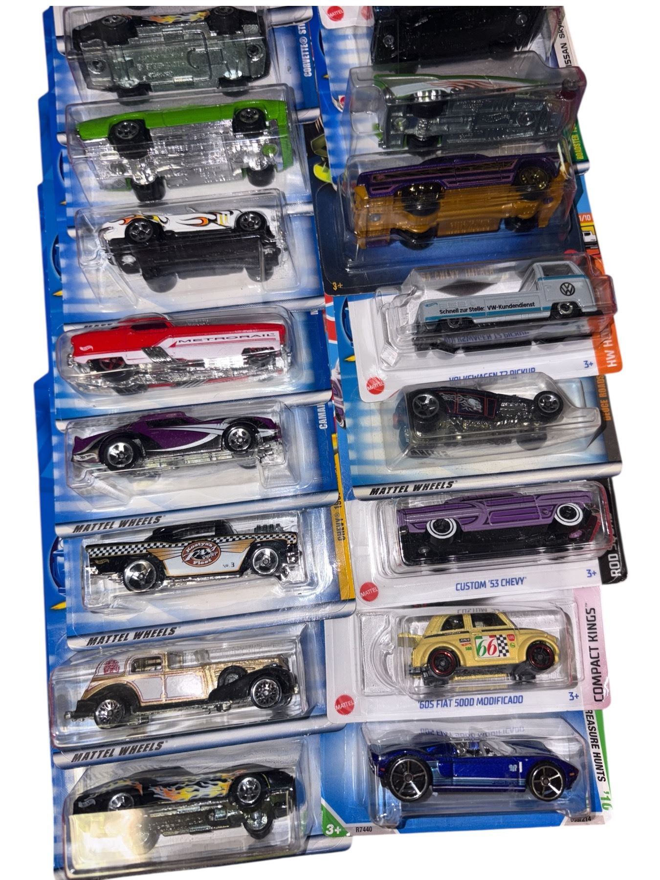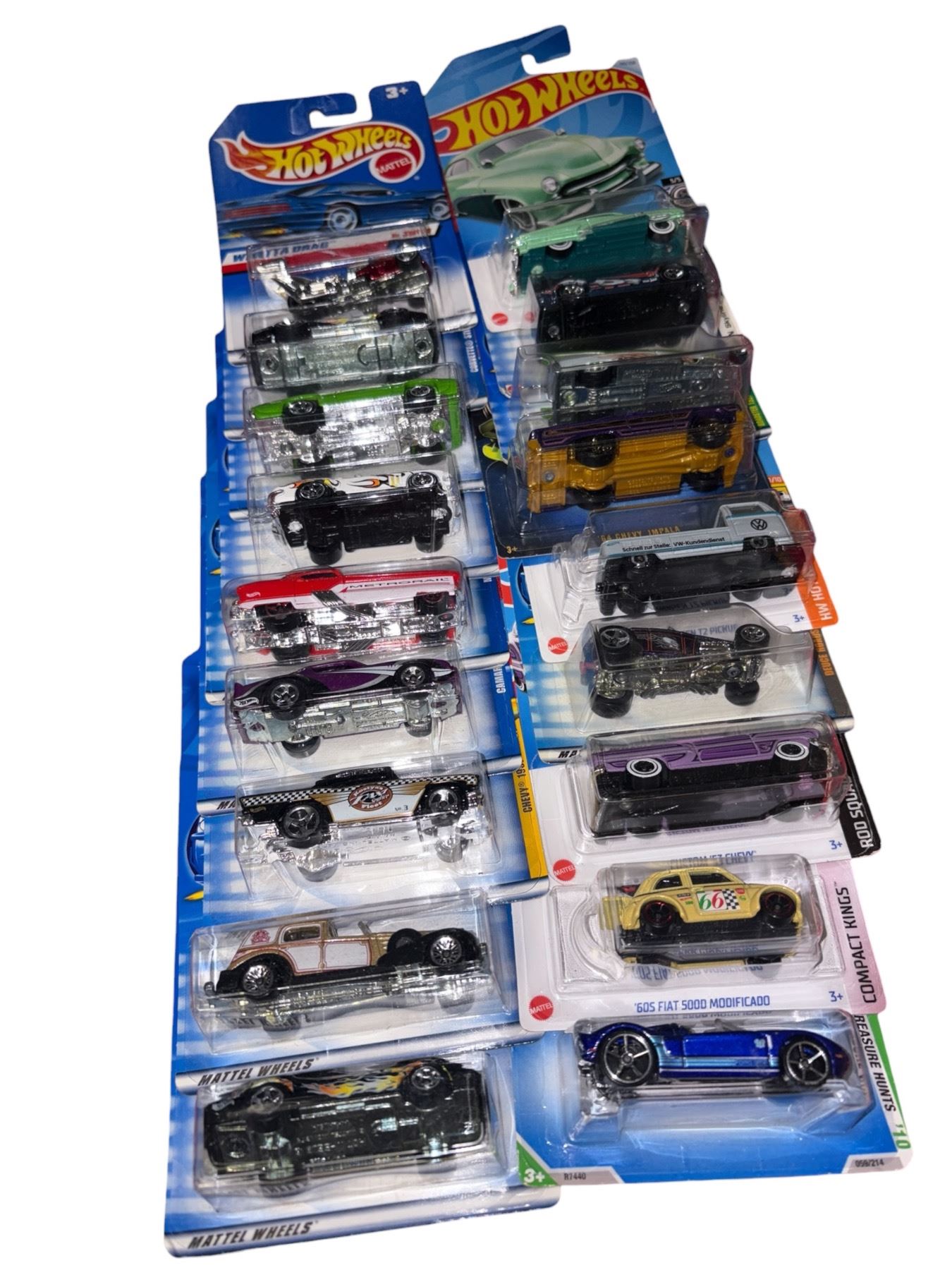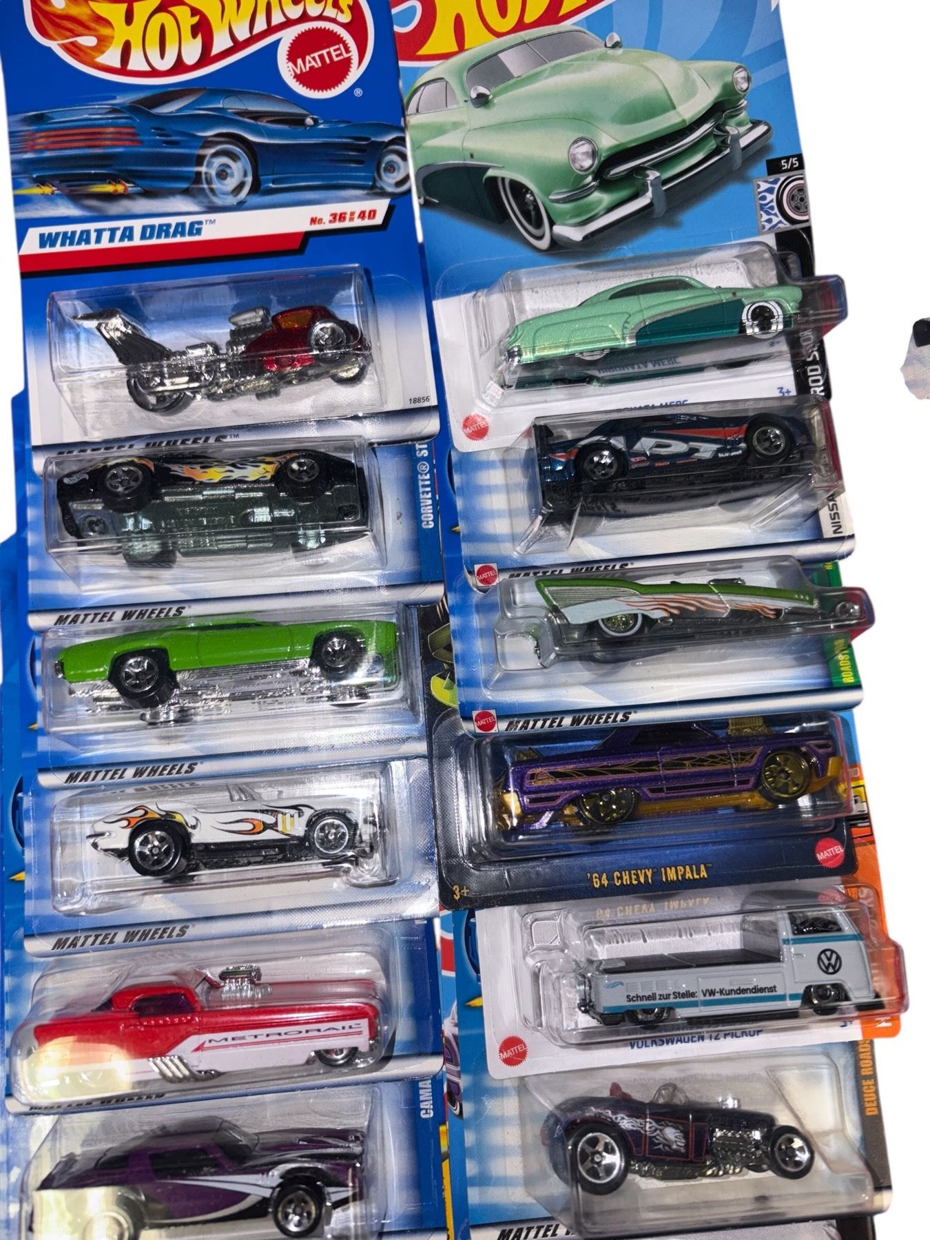 Collection of 18 Hot Wheels diecast cars, assorted models, all in original blister packs. Includes various designs and themes from multiple series within the Hot Wheels line. Cars measure approximately 1:64 scale, blister packs are unopened and intact. Manufactured by Mattel, covering years from the late 1990s to early 2020s.
