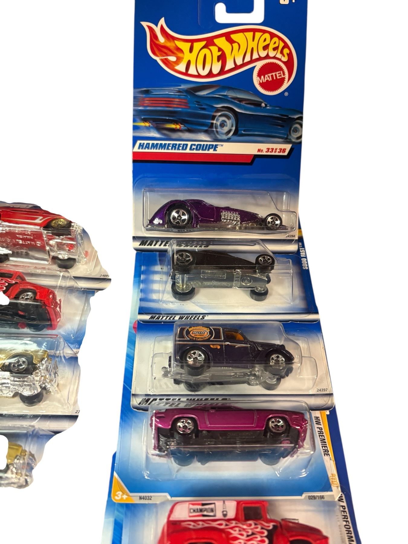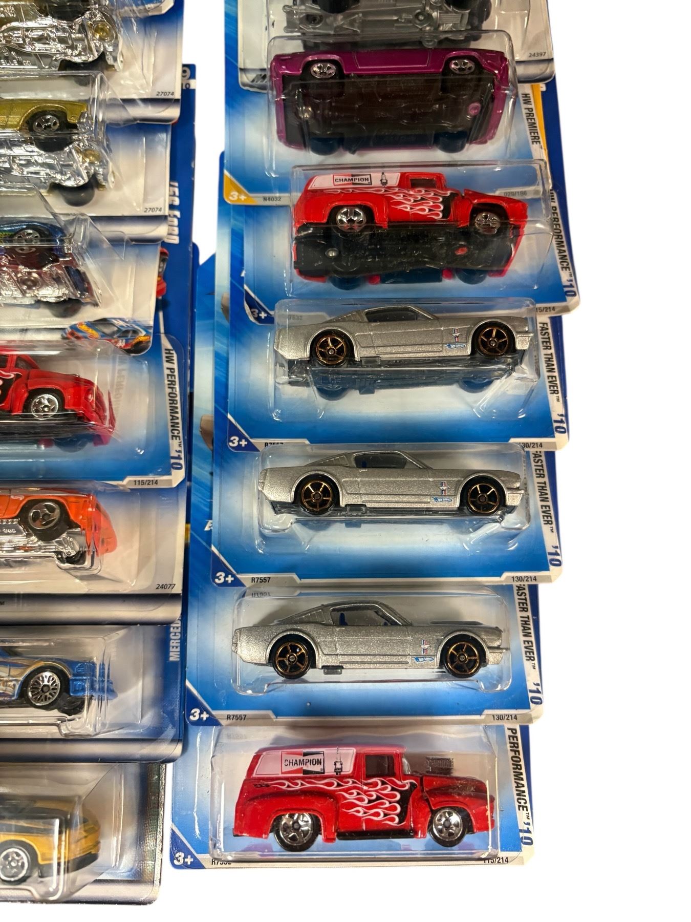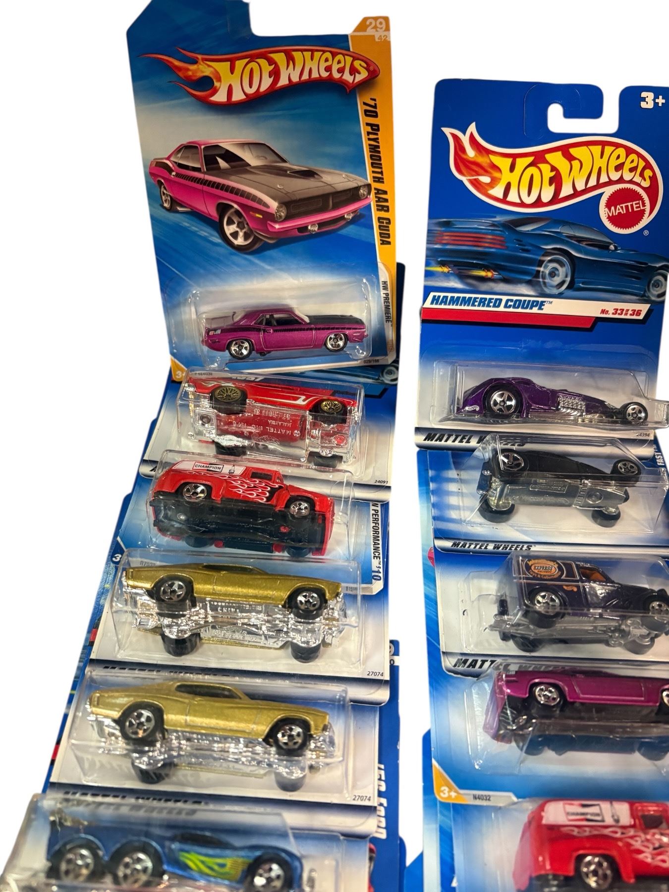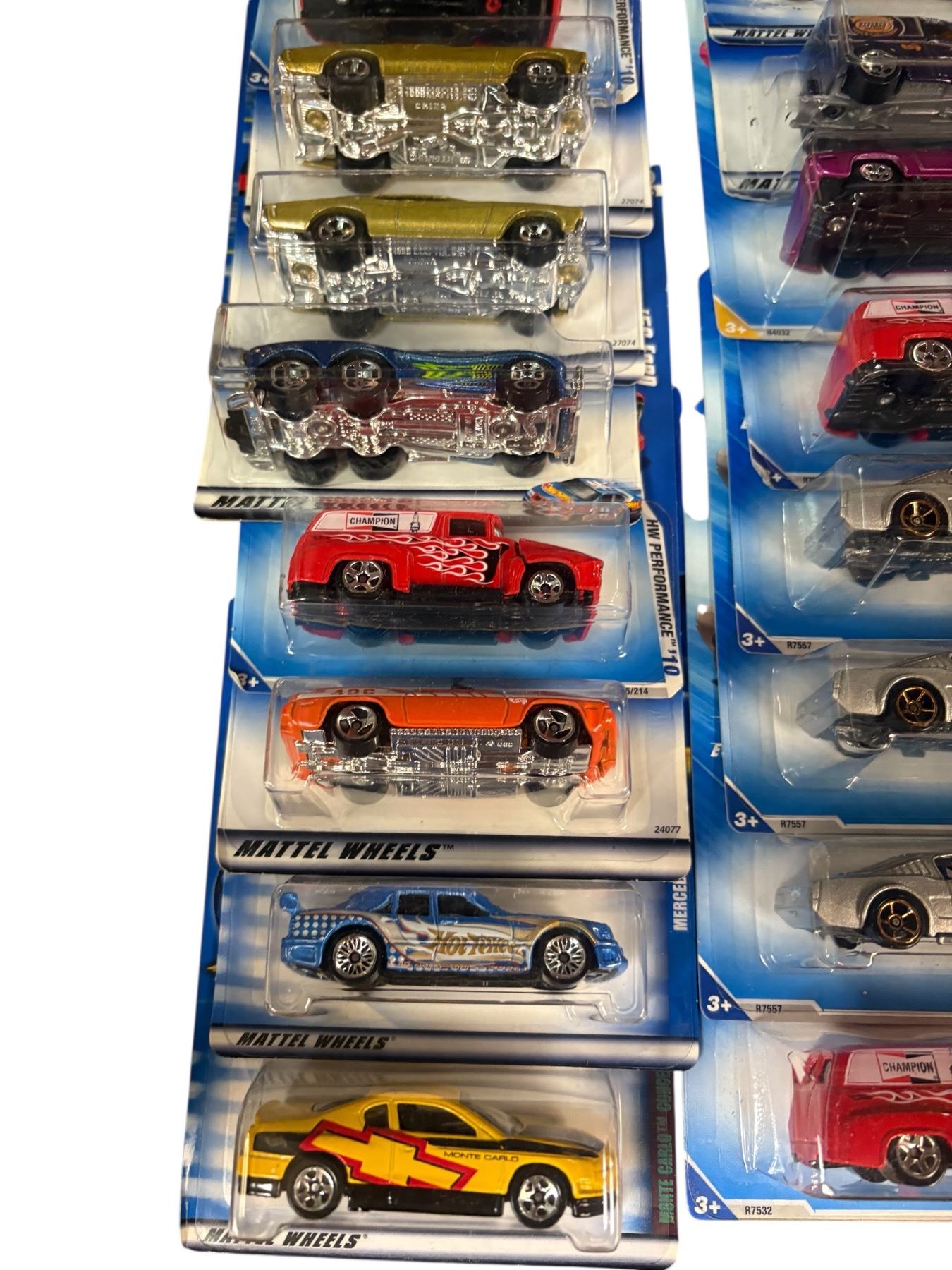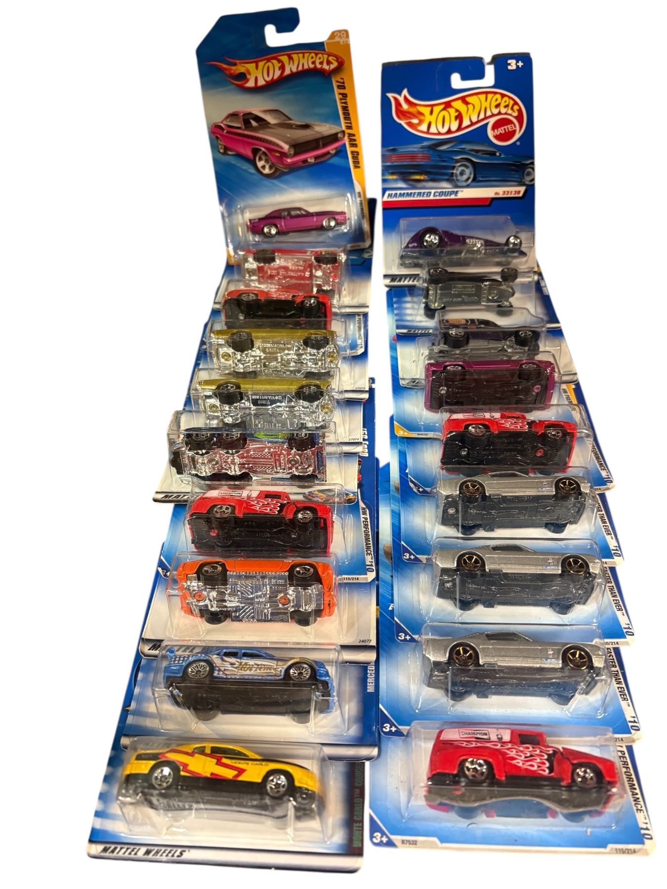 Lot of 19 Hot Wheels 1:64 scale diecast vehicles in sealed retail packaging. Includes assorted cars and trucks. Packaging is unopened, and designs feature a variety of models. Suitable for display or collection. Manufactured by Mattel.