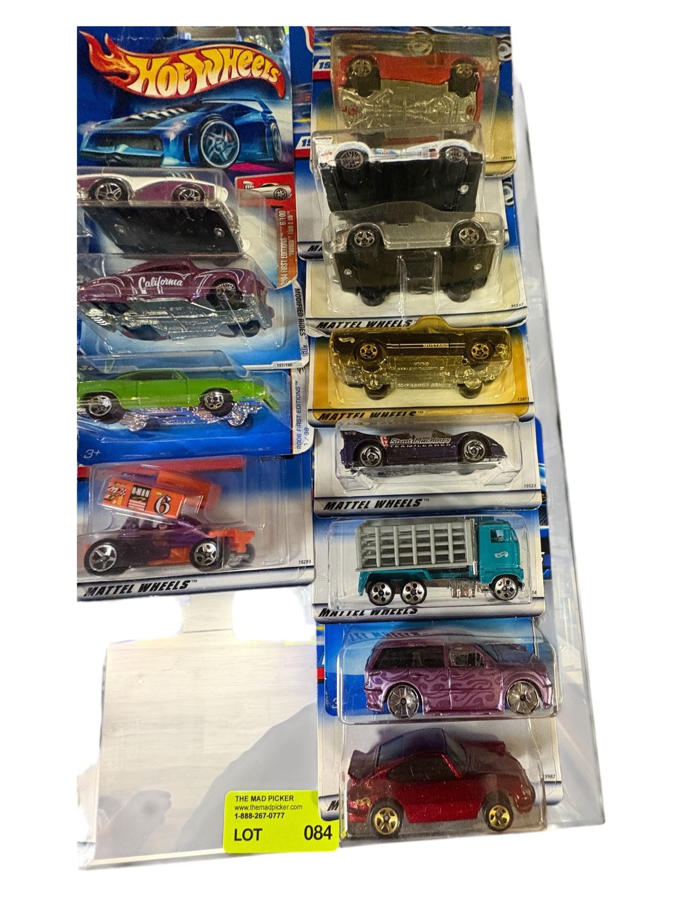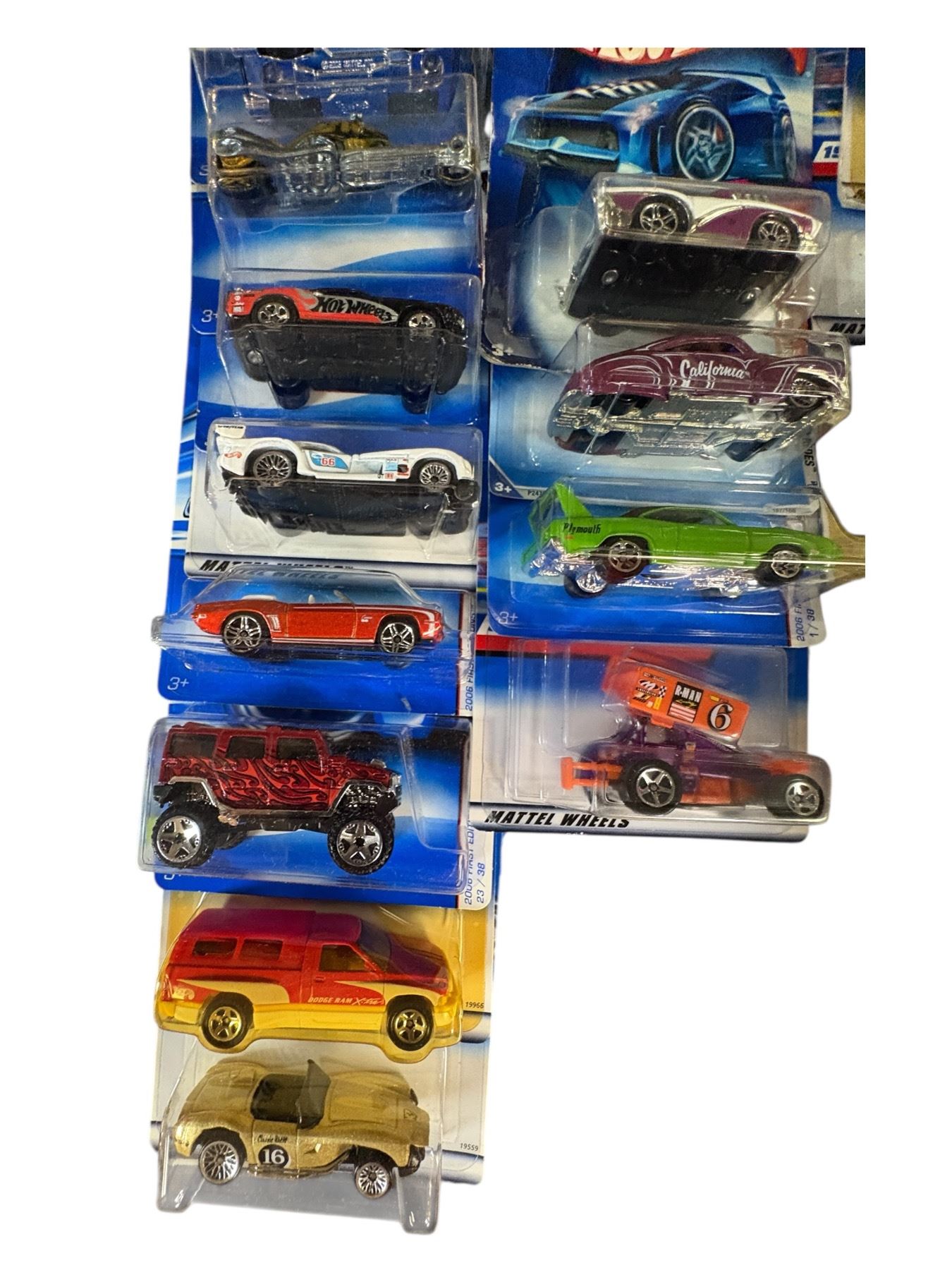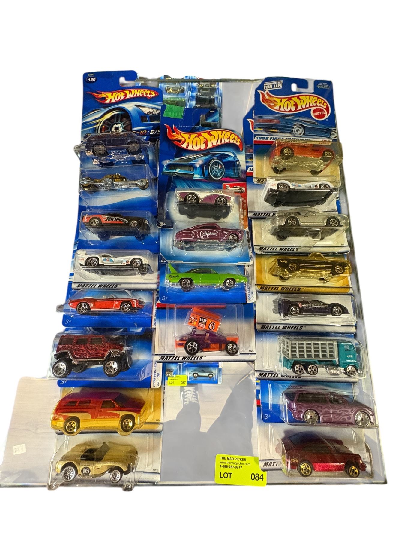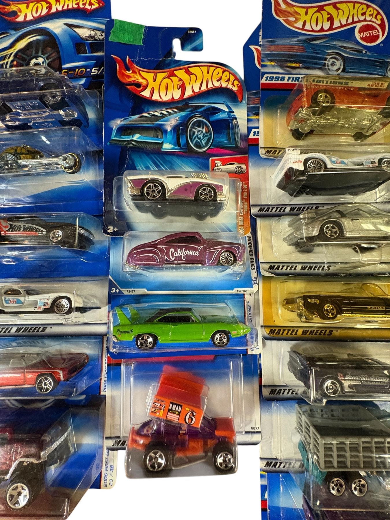 Lot of 20 Hot Wheels diecast vehicles in original sealed packs. Includes an assortment of cars and trucks from various series. Manufactured by Mattel, with standard 1/64 scale. Specific models and production years vary within the lot. All items remain in unopened packaging.