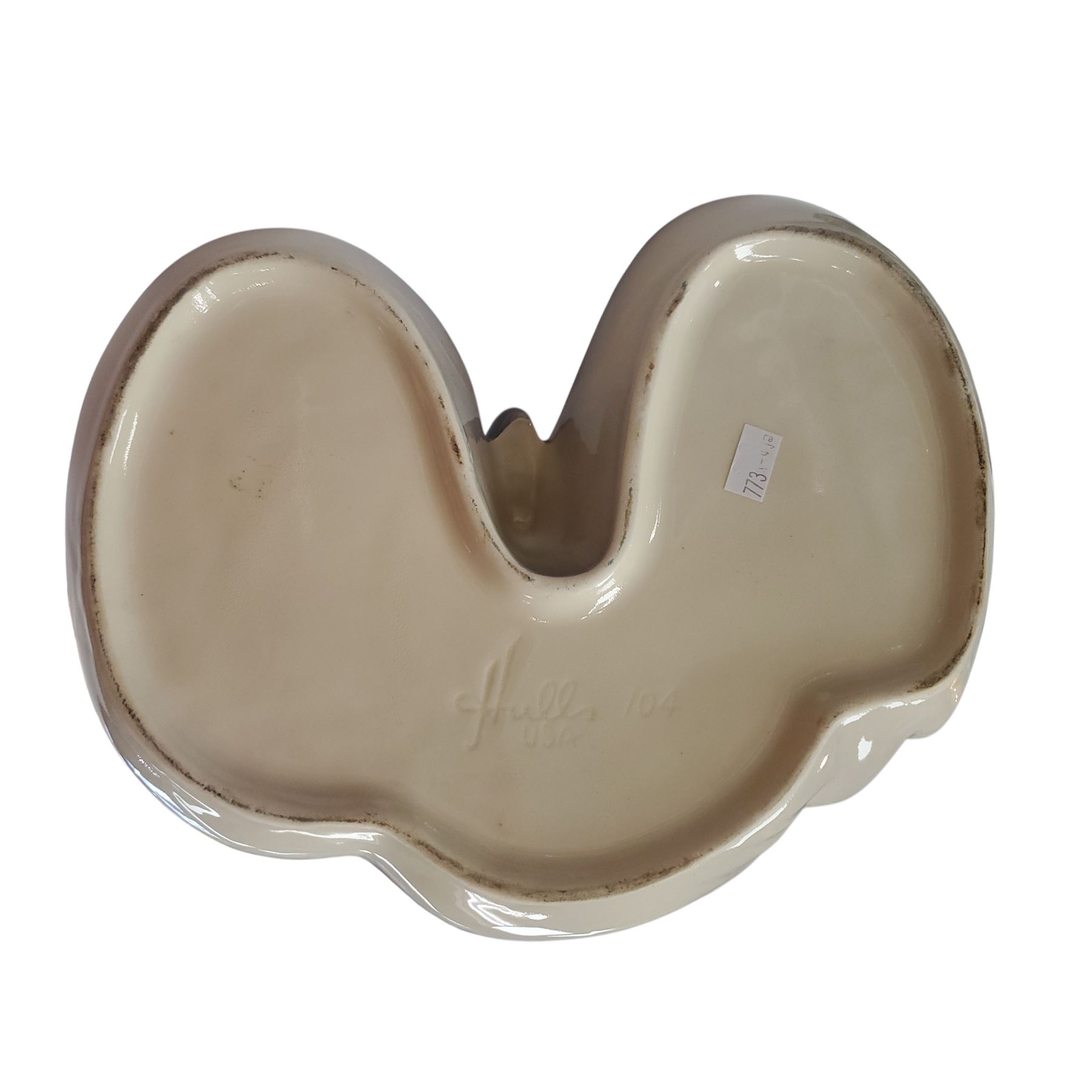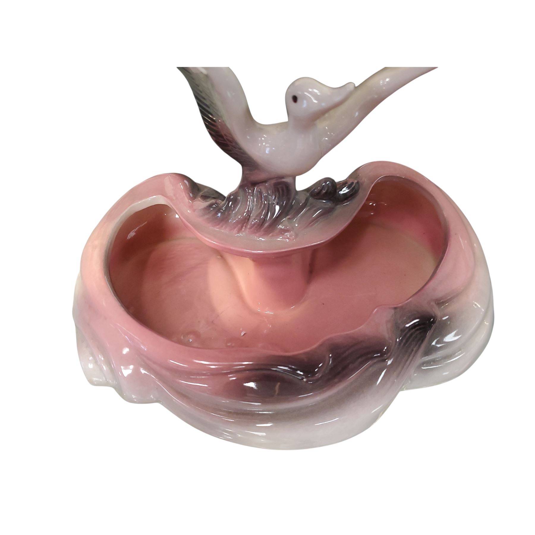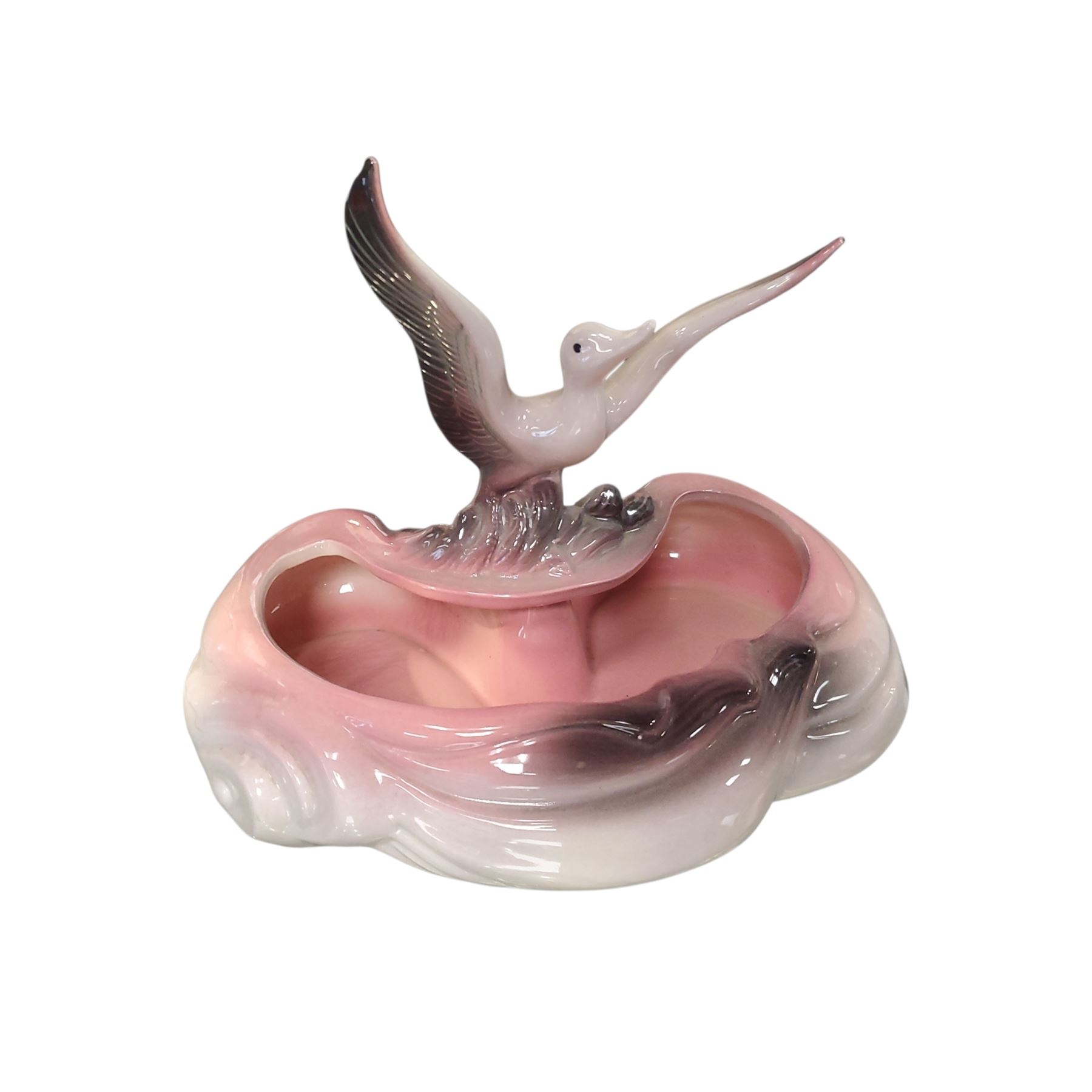 Hull Pottery Flying Duck (or Goose) Planter, model 104, made in the USA circa 1940s-1950s. Features a stylized bird in flight over a pond-shaped basin. High-gloss pink and charcoal gradient finish. Measures approximately 9 inches tall and 10-11 inches long. Reflects the Mid-Century Modern aesthetic.