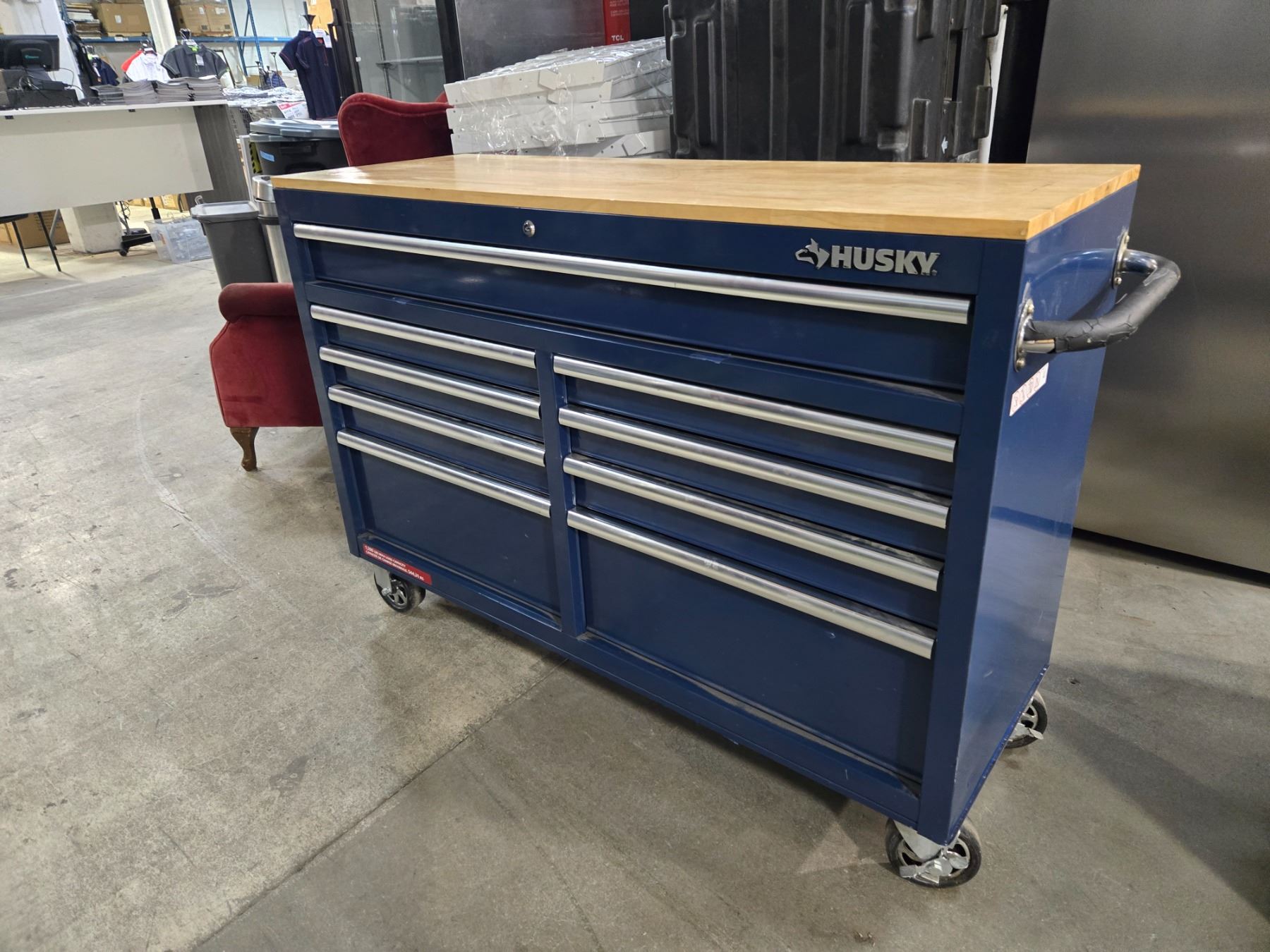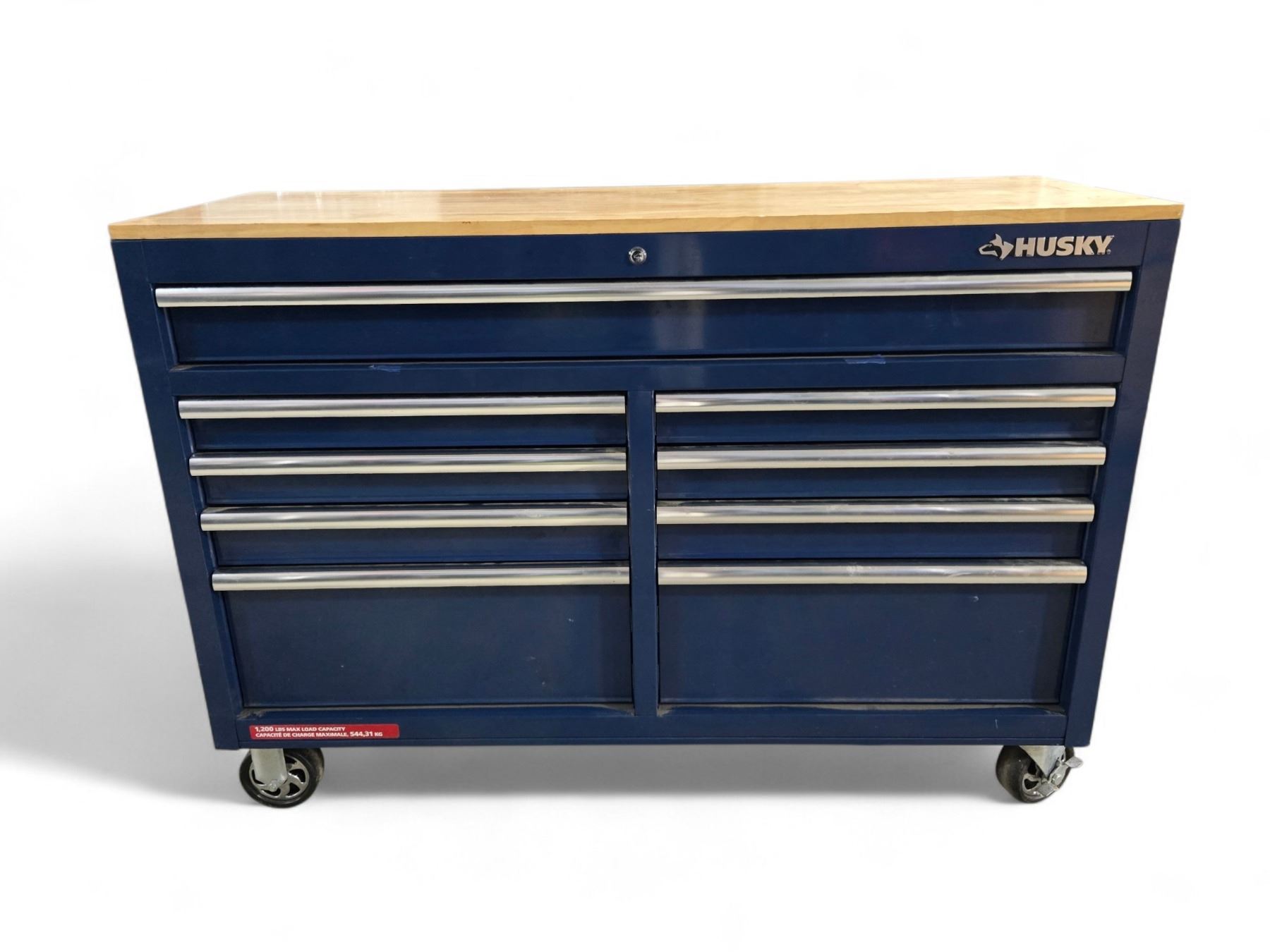 Husky Standard-Duty 52 inch W 9-Drawer Mobile Workbench with Solid Wood Top in Gloss Blue - R.V $599
