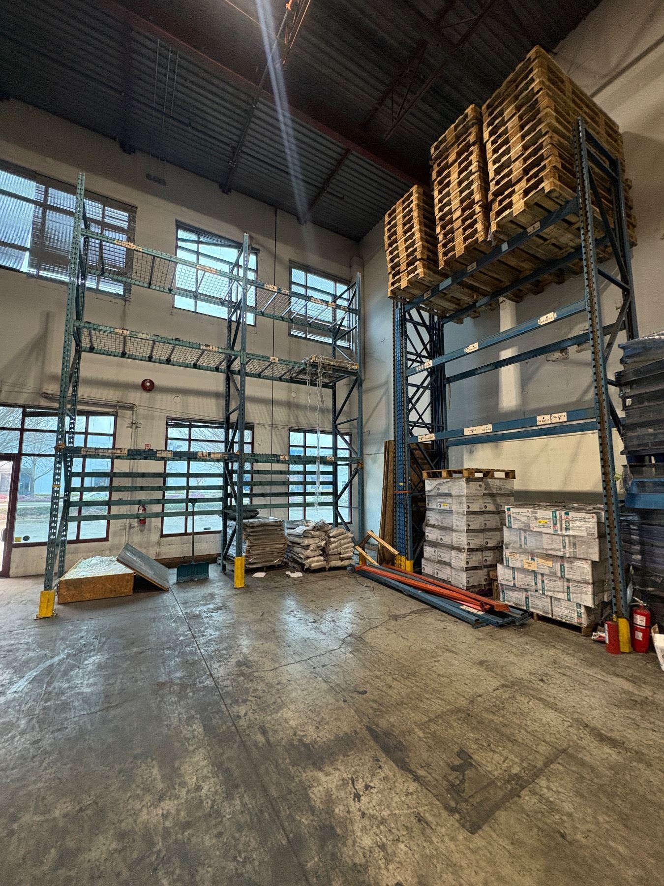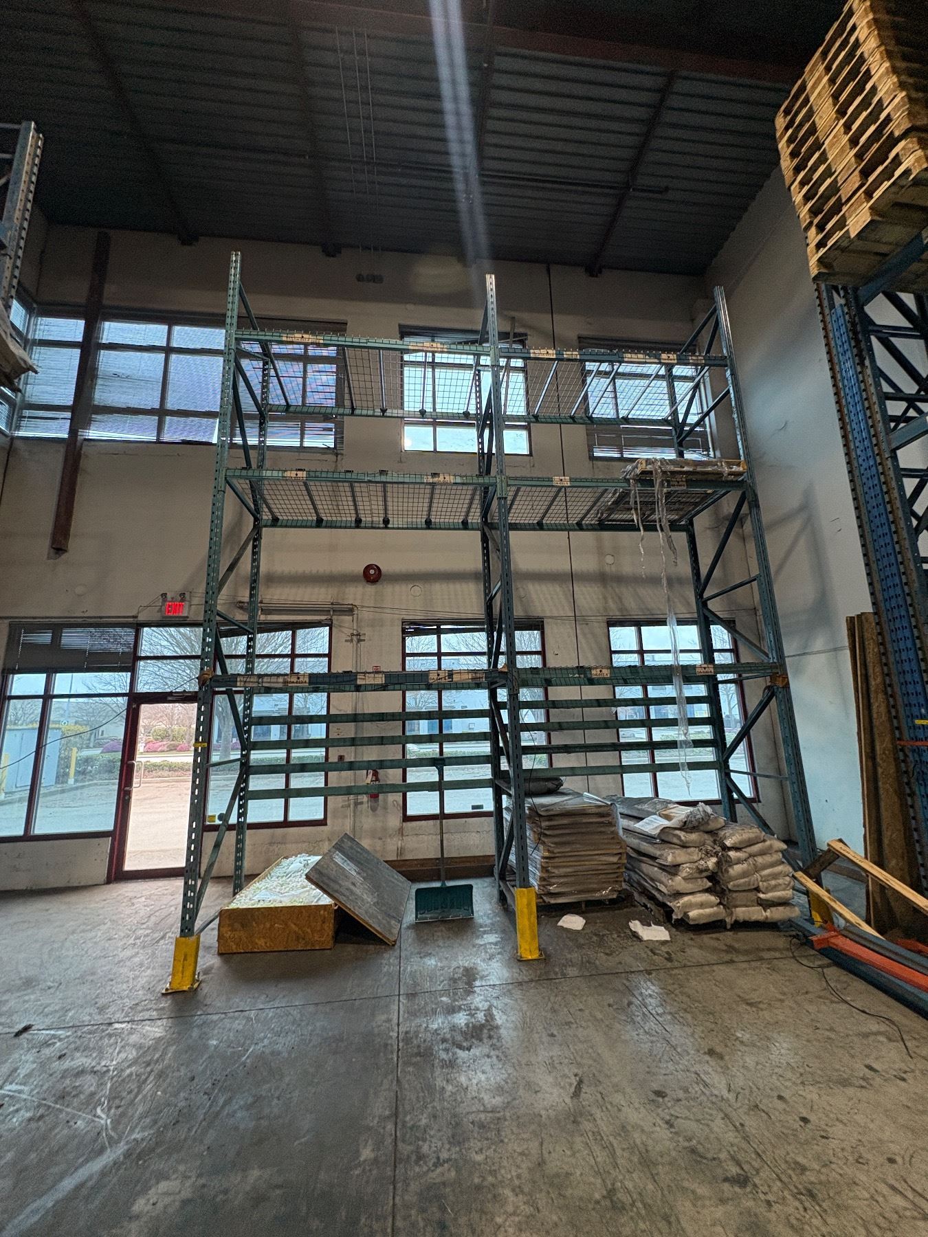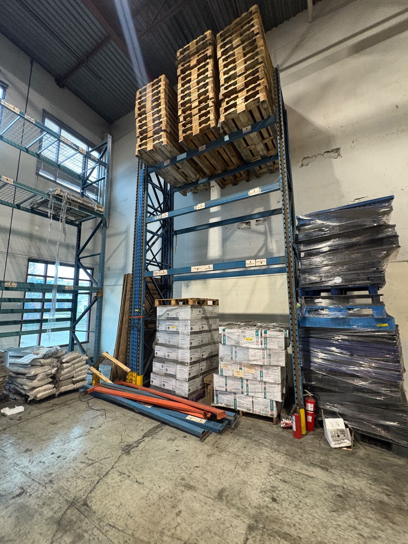 Industrial warehouse racking - includes 6 vertical uprights (approx. 18ft tall x 42in depth), 2 uprights (approx. 16ft tall x 42in depth), 10 beams (approx. 116in), 20 beams (approx. 94in) & mesh deck