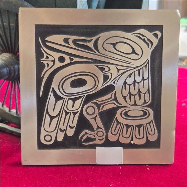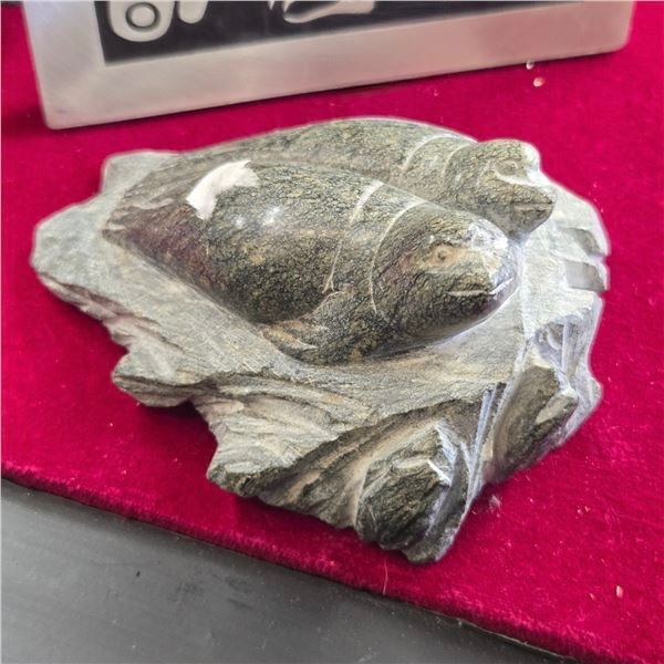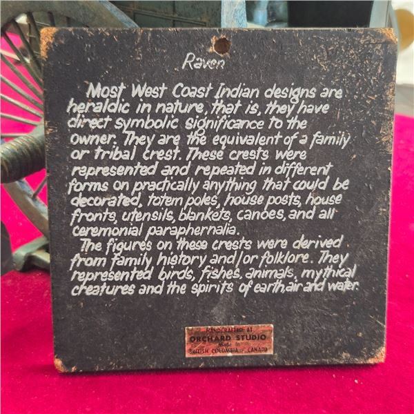 Lot includes an Inuit First Nations soapstone carving featuring seals on rock and an Orchard Studios ceramic raven plaque measuring 5.5x5.5-Inch. Both pieces showcase traditional styles and craftsmanship. Item is as pictured.