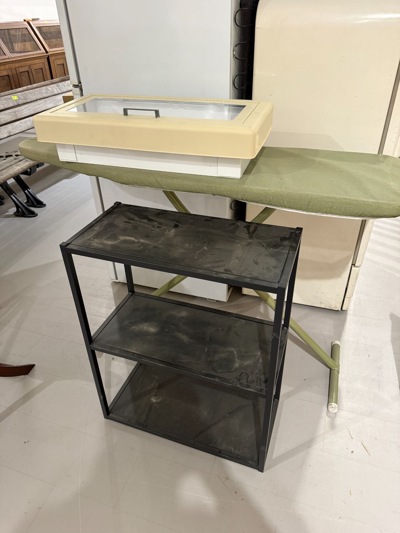 Ironing Board, Cabinet, and 3 Tier Black Metal Shelf (Shelf is: 12" x 24" x 30" tall)