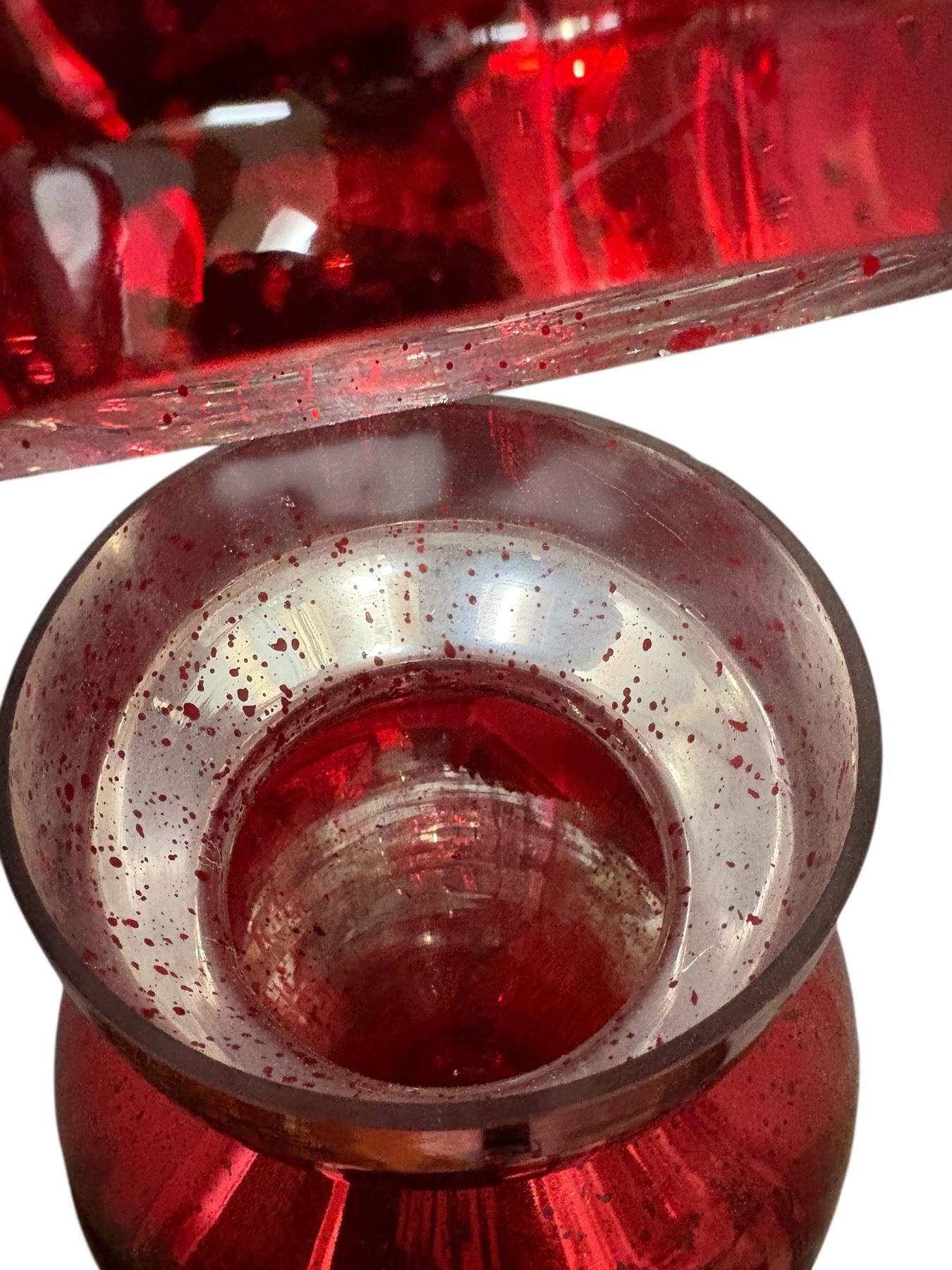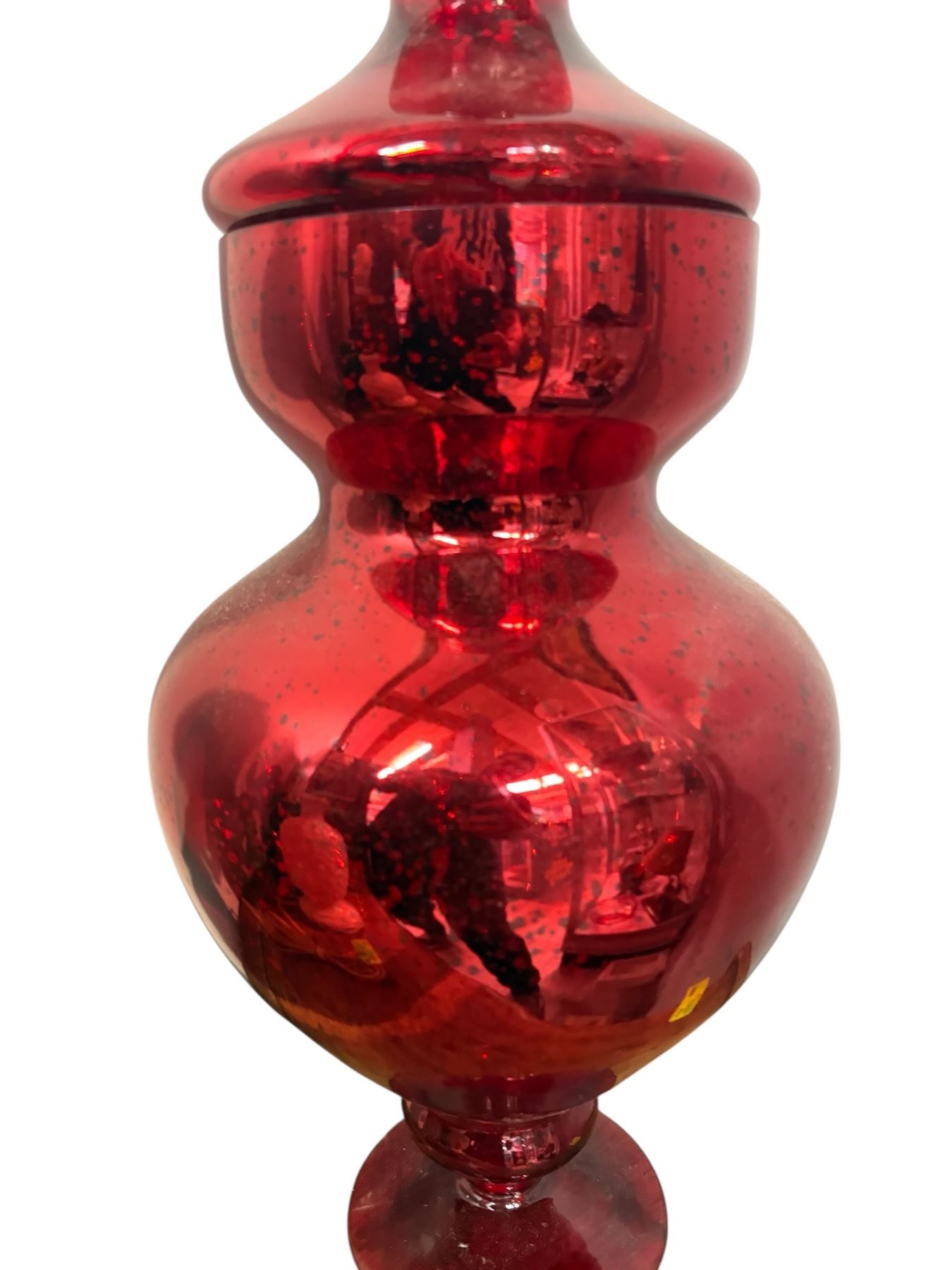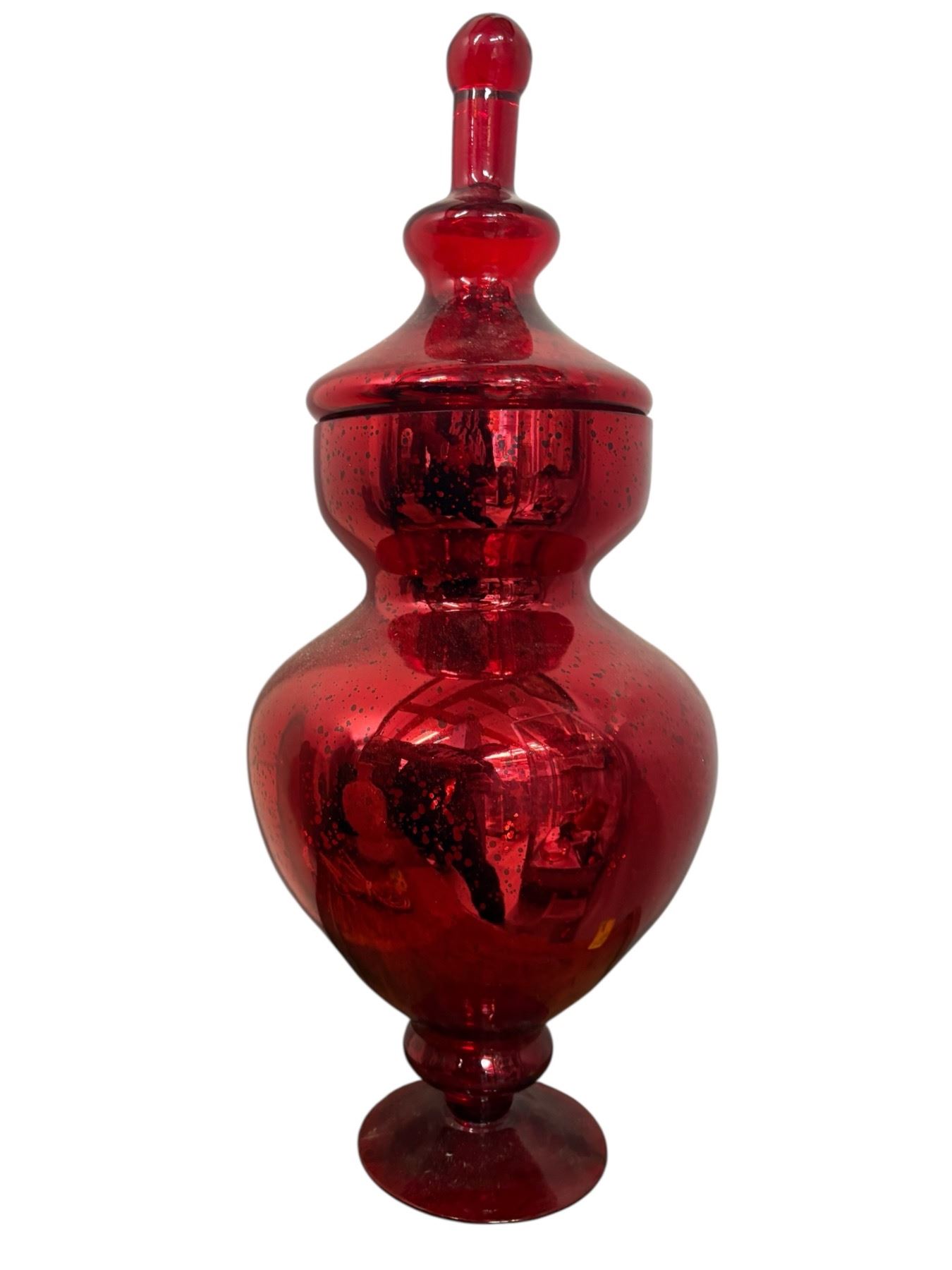 Large Italian Empoli-style glass apothecary jar featuring a vibrant red 'circus tent' design. This lidded centerpiece stands 22 inches tall and showcases classic mid-century modern aesthetics. Likely a decorative piece, reminiscent of Empoli glassware popular in the 1950s-1970s.