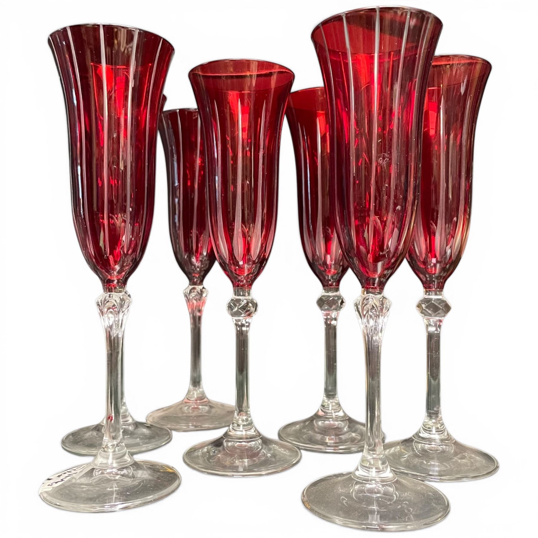 Italian Style Vintage Ruby Red Champagne Flutes 9" Tall Set of 7 Glasses