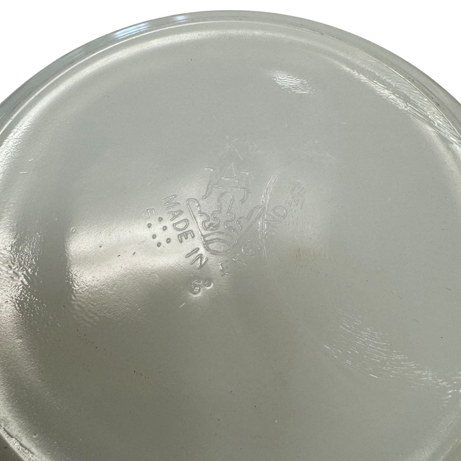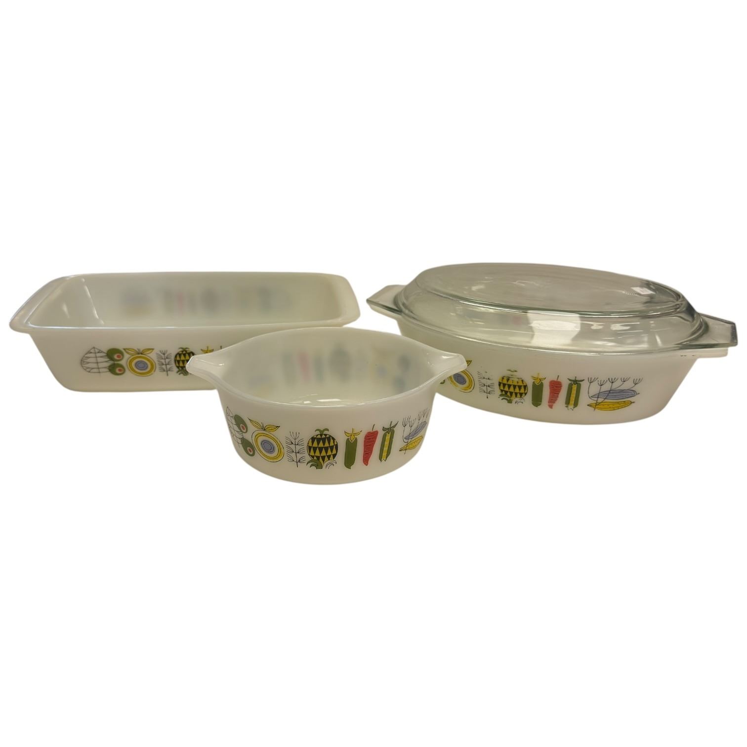 JAJ casserole dishes produced in England featuring the 'Harvest Vegetable' pattern, popular during the 1960s-1970s. Includes model 524 with lid, model 542 and 6-Inch bowl. Classic vintage cookware decorated with vegetable motifs characteristic of mid-20th-century kitchenware designs. No Chips