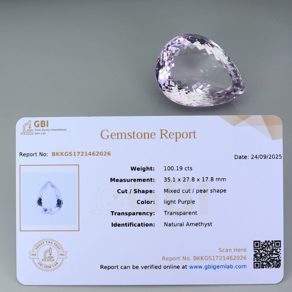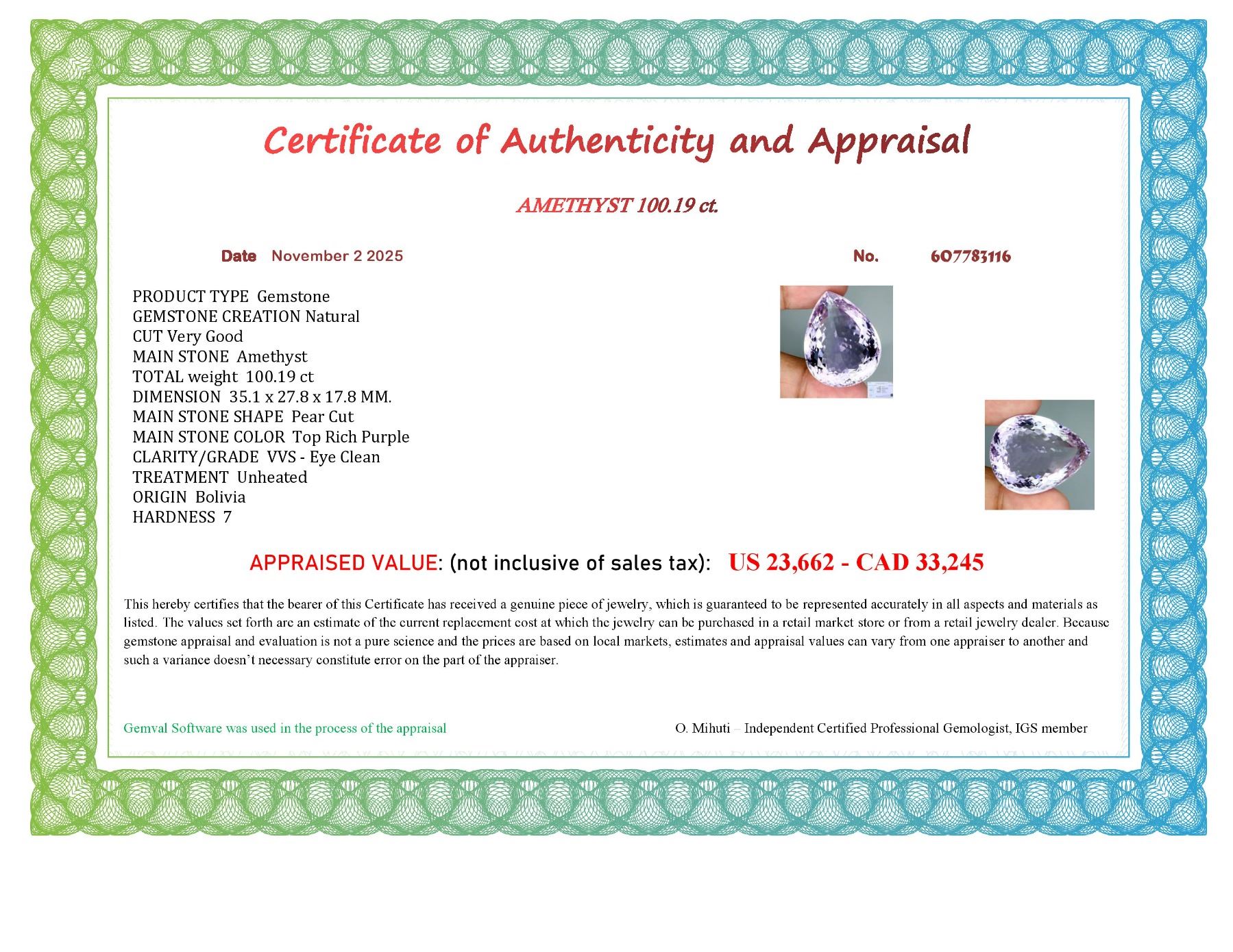 JUMBO 100.19 CT. AMETHYST PEAR CUT - Appraised value CAD 33,245