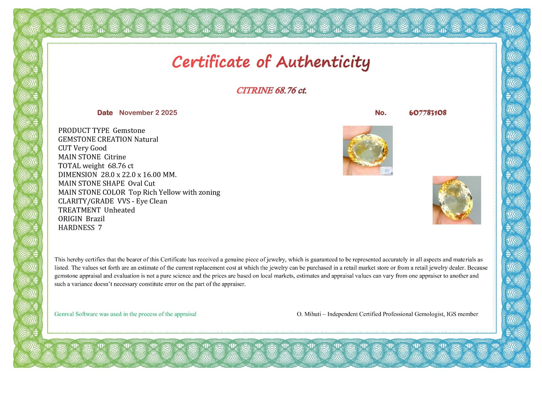 JUMBO 68.76 ct. CITRINE - ESTIMATED Value - CAD 6,800
