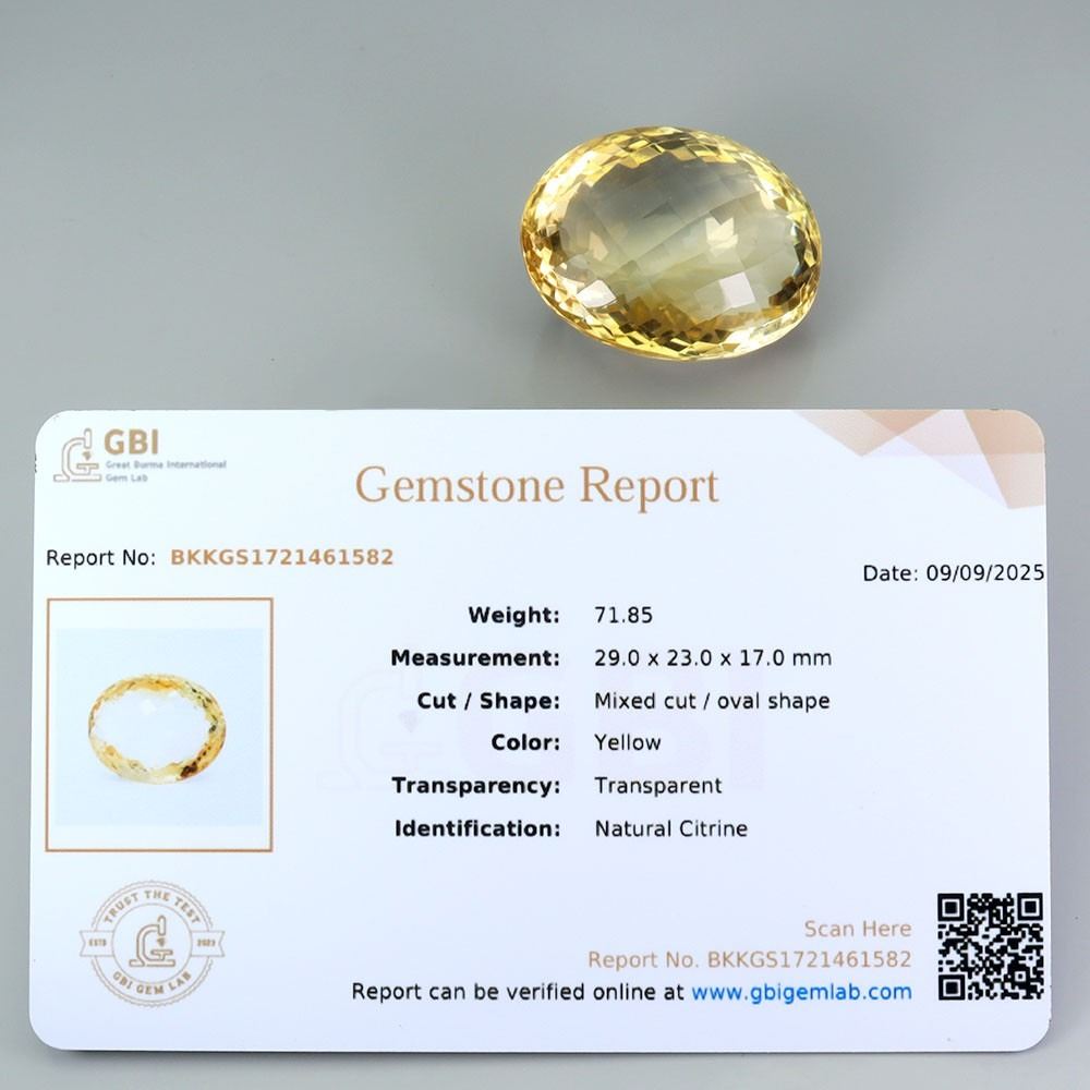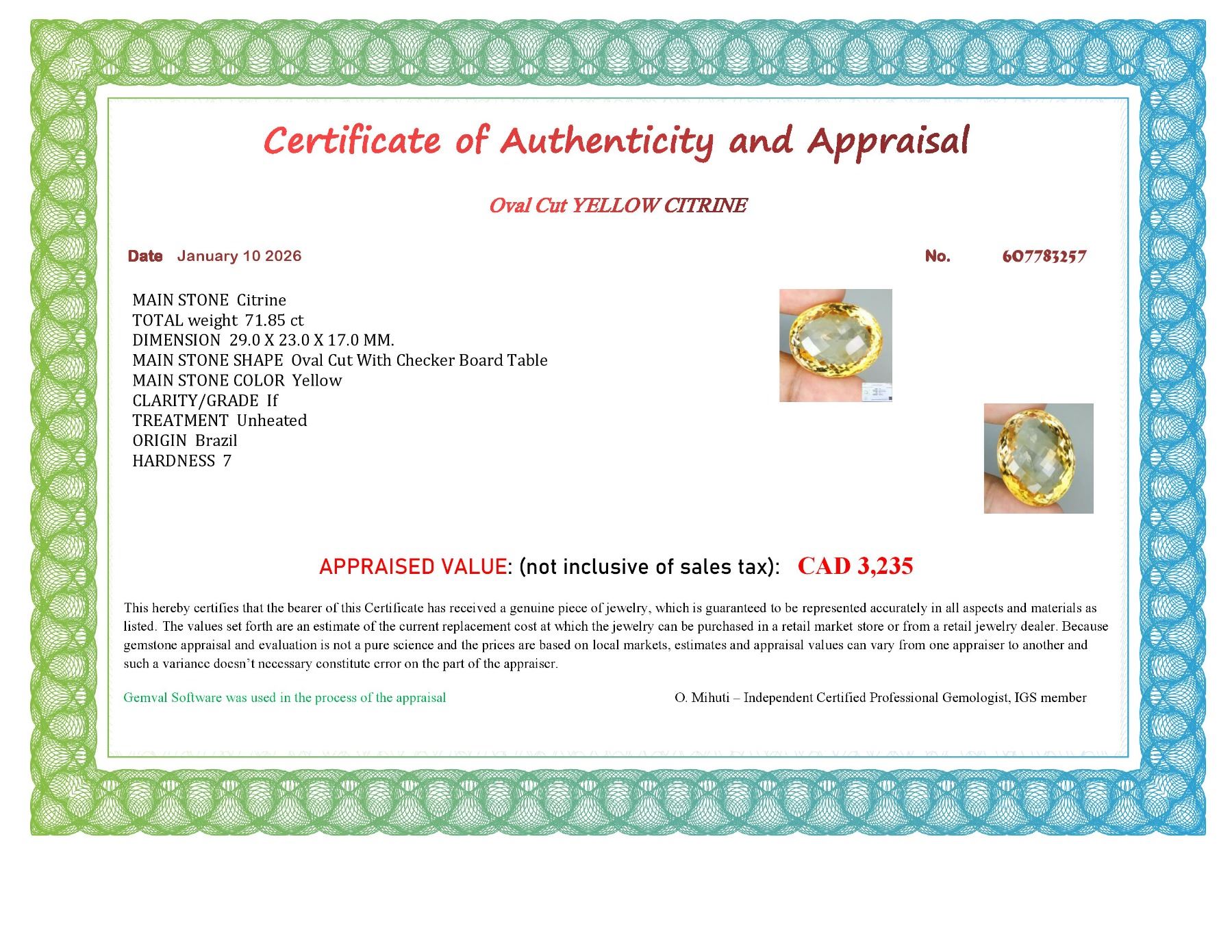 JUMBO 71.85 CARATS OVAL CUT NATURAL UNHRATED YELLOW CITRINE 29X23 mm - APPRAISED REPLACEMENT VALUE CAD 3,235