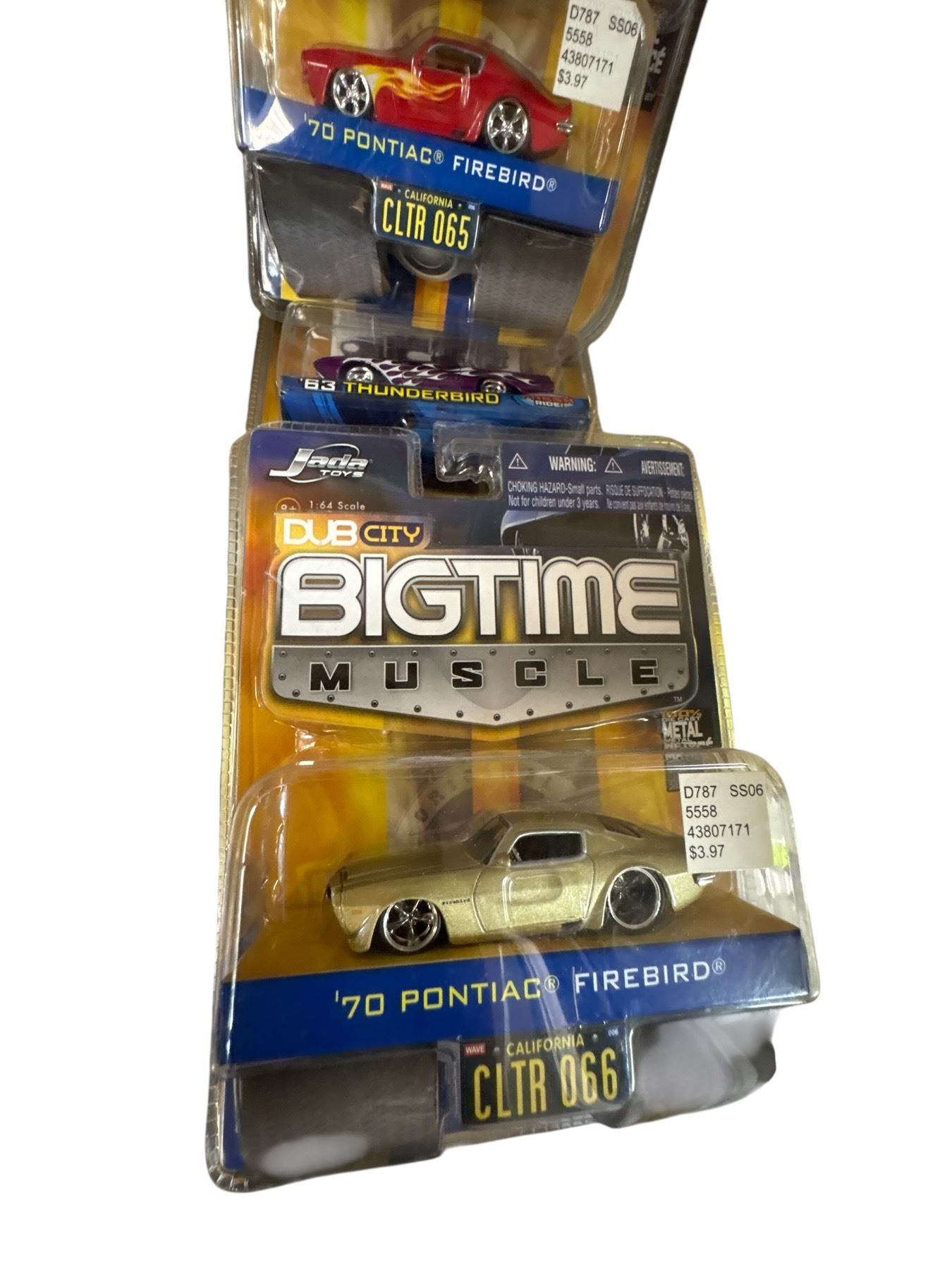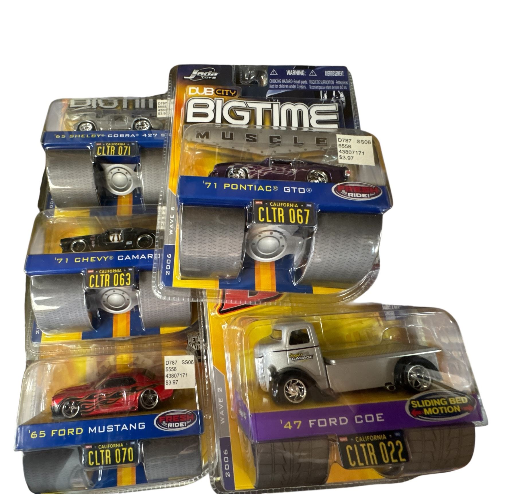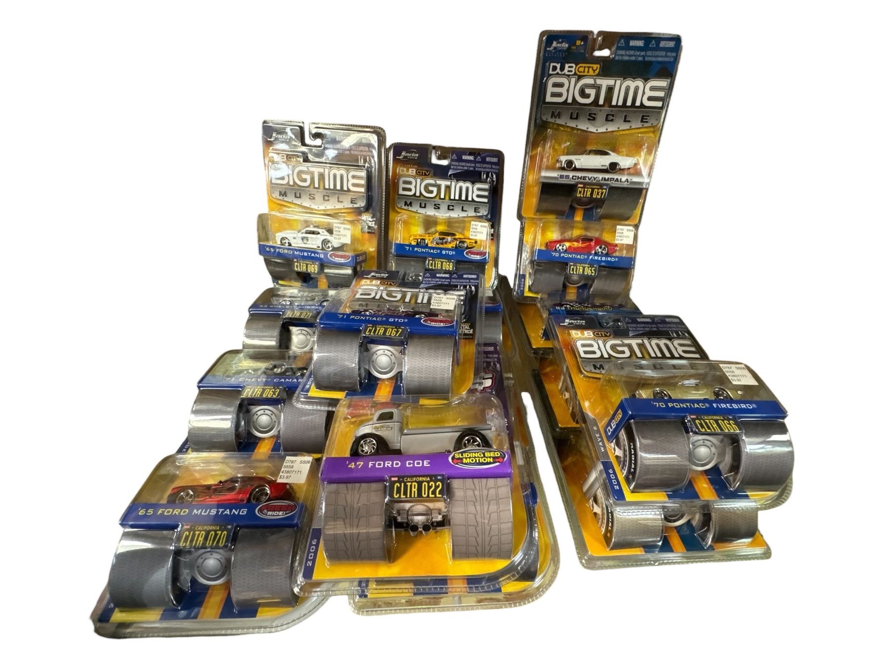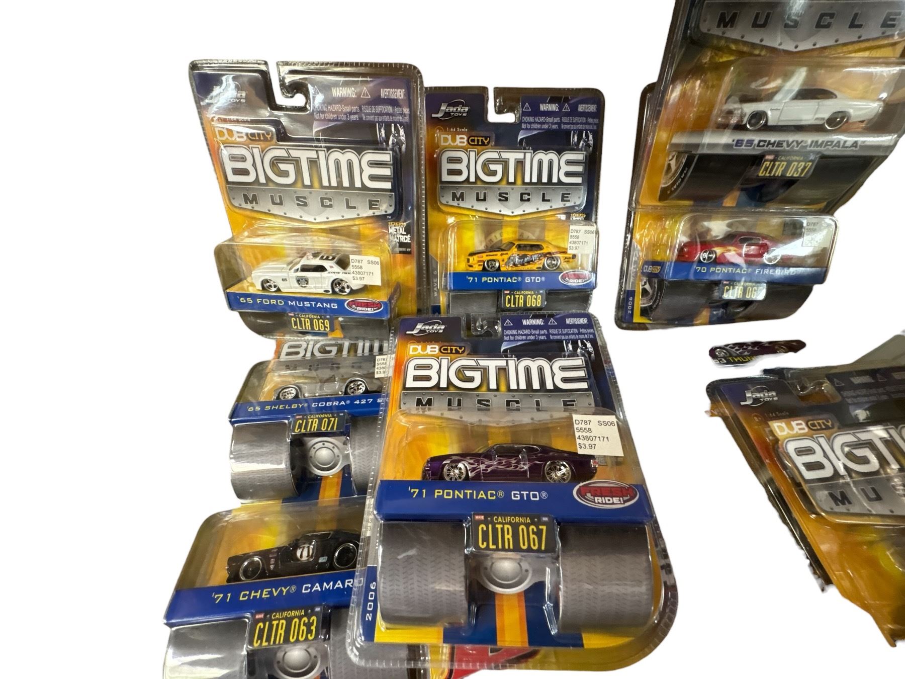 Large collection of 11 Jada Toys Dub City Bigtime Muscle diecast cars, each in original packaging. Models represent various iconic muscle cars with detailed designs, true to the Bigtime Muscle series. Scale likely 1:24 or 1:64 (check packaging specifics). Includes a mix of colors and styles.