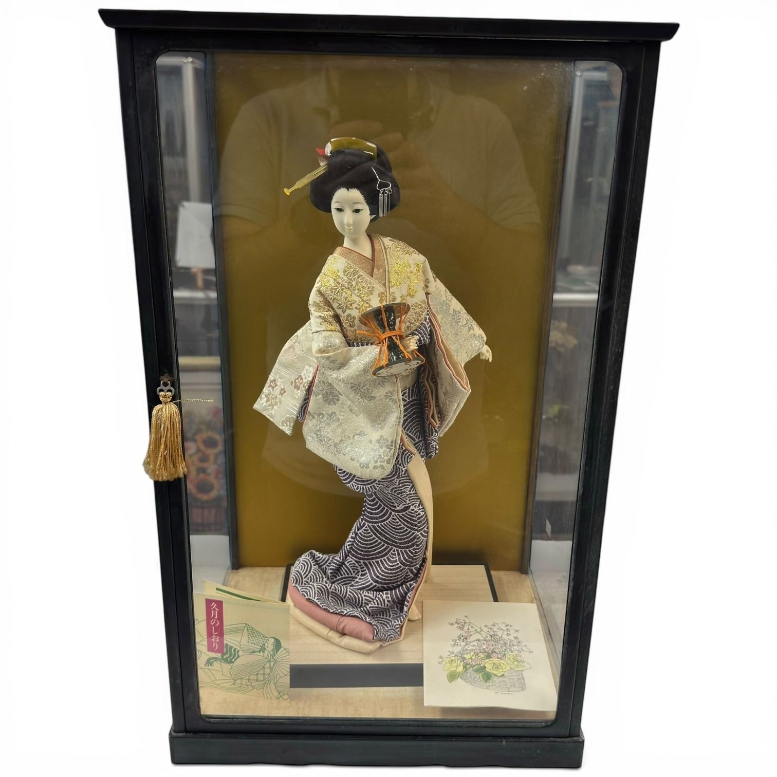 Japanese Doll with Glass Display Case - Case dimensions are: 10" x 13" x 22" tall